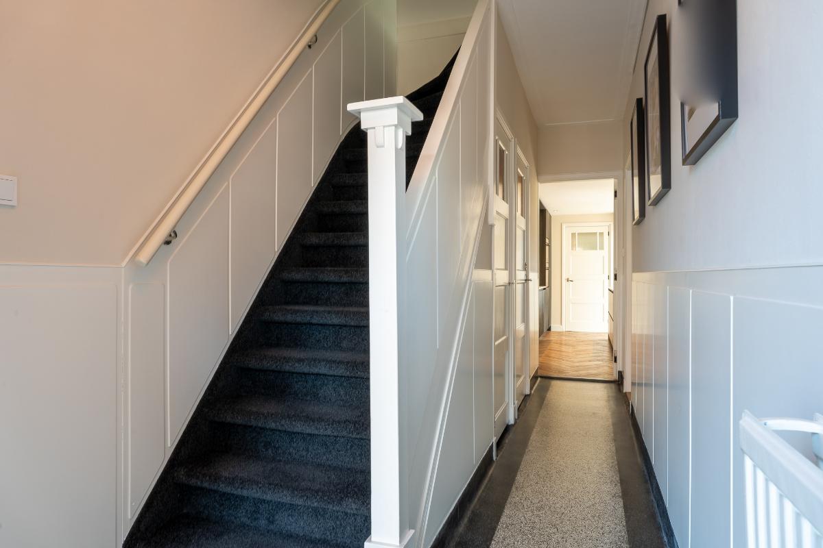 ENTREE Entree/hal met granitovloer, originele lambrisering en trapopgang naar de 1e verdieping, meterkast, praktische trapkast, toiletruimte, garderobenis en toegang tot de woonkamer en keuken.