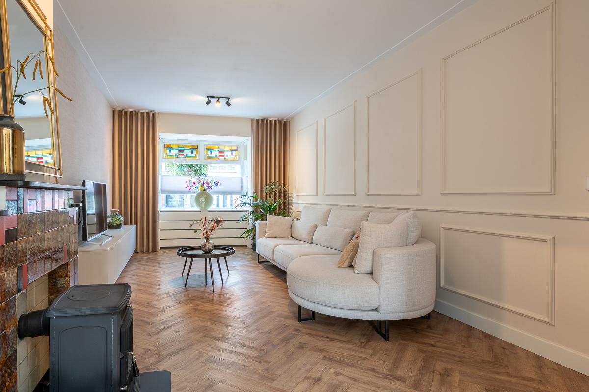 LIVING WOONKAMER De charmante woonkamer is aangenaam licht door de erker met glas in lood aan de voorzijde en geeft aan de achterzijde toegang tot de open leefkeuken. De woonkamer beschikt over een visgraat pvc-vloer, stucwerk plafondafwerking met sierlijsten, vaste kast voor opbergruimte en tot slot een sfeervolle houtkachel met originele schouw waardoor in deze ruimte optimaal woongenot is gecreëerd.