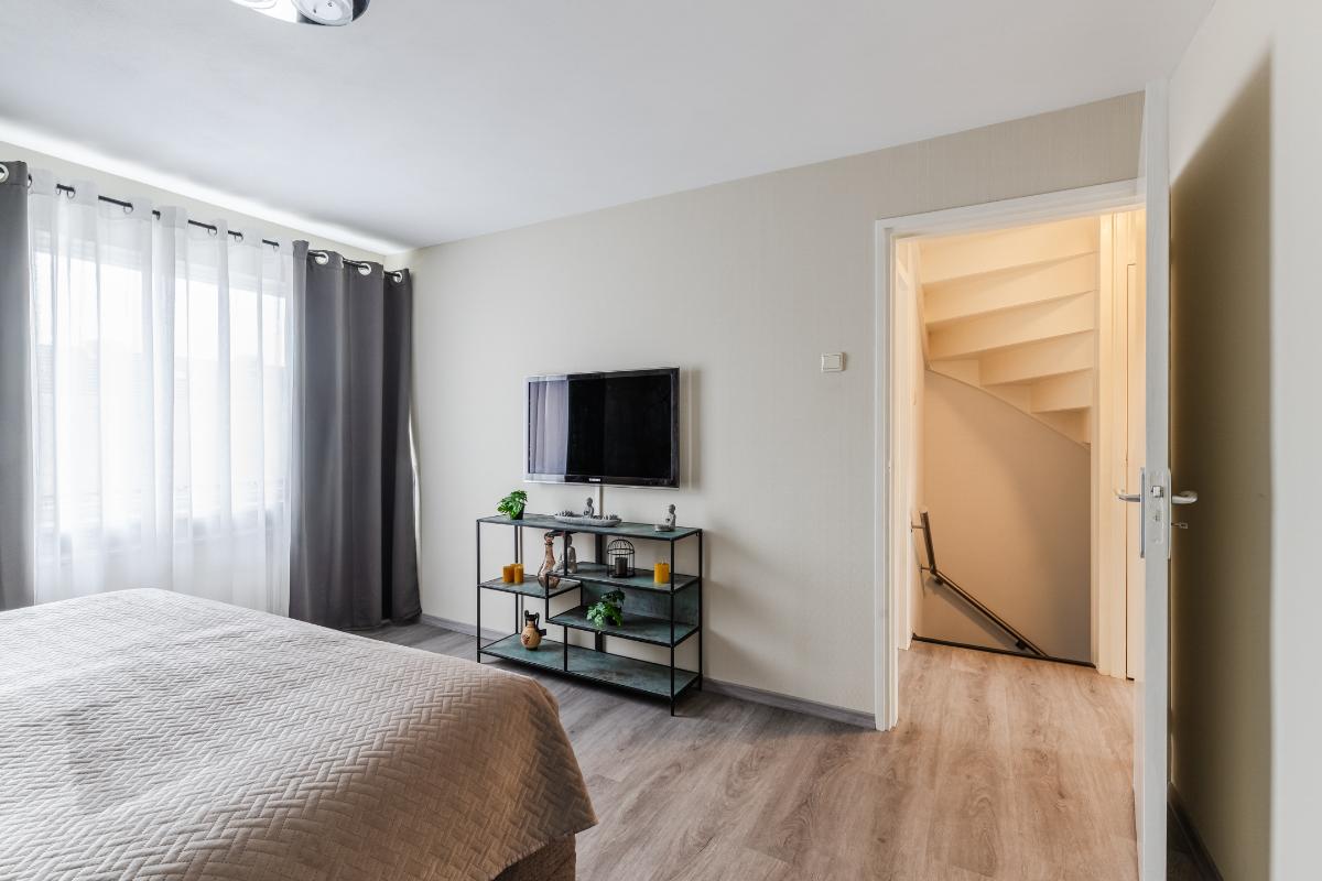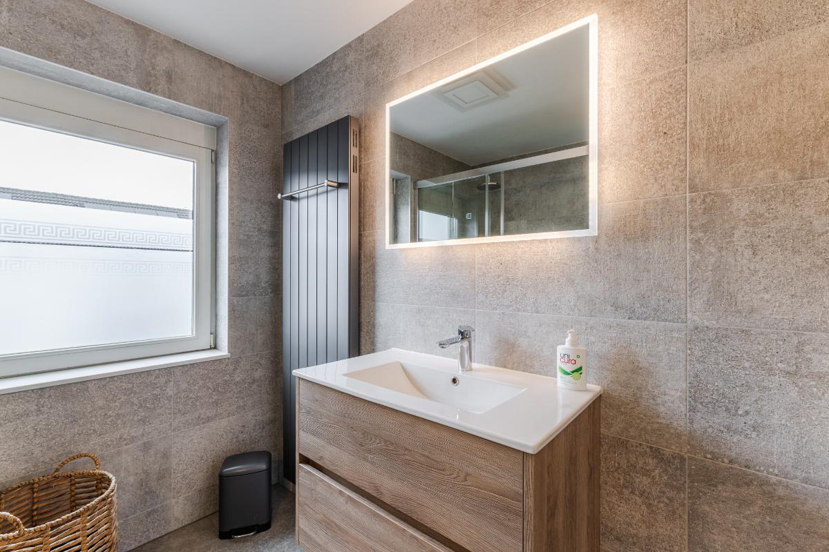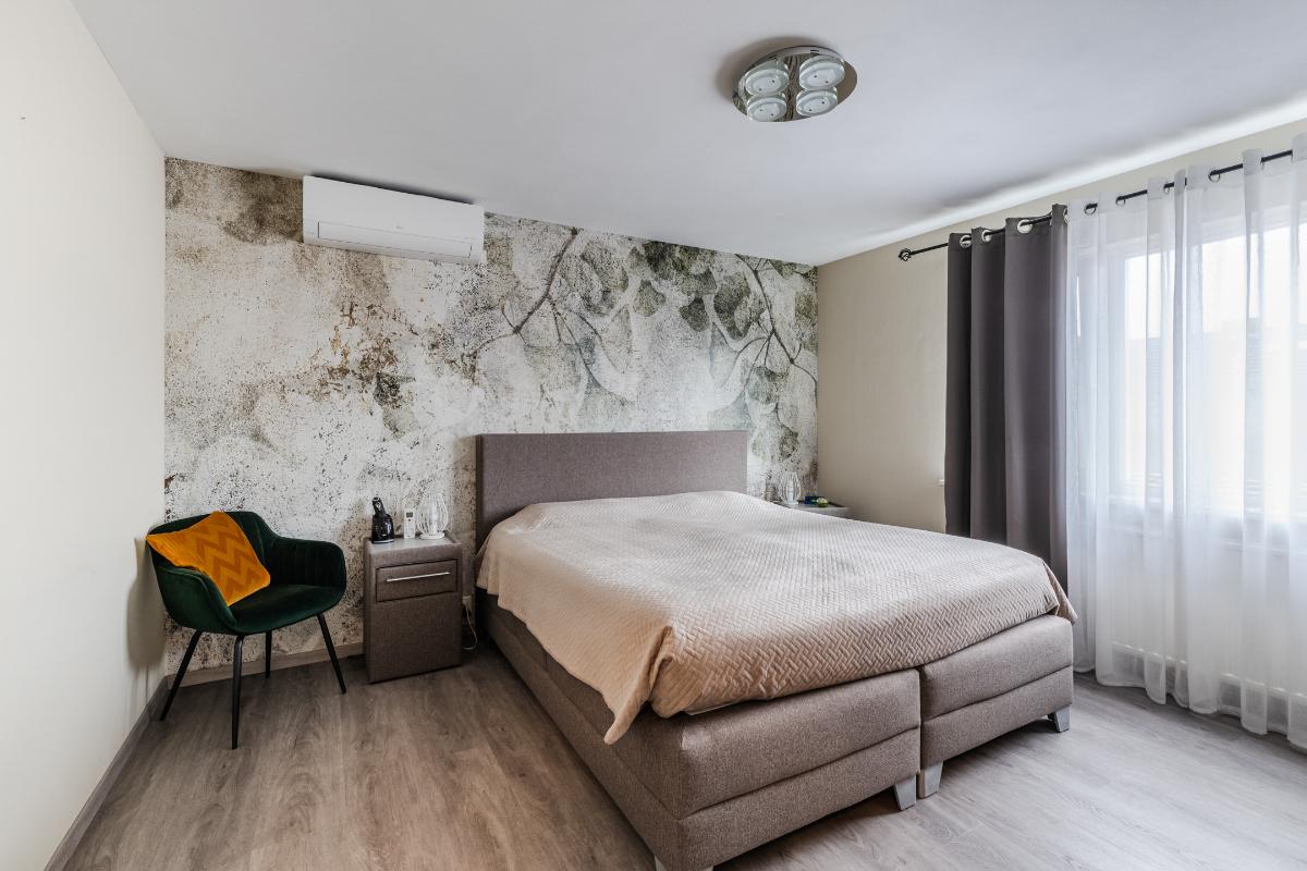 1e Verdieping: Overloop. Op de eerste verdieping bevinden zich 3 comfortabele slaapkamers, waarvan 2 v.v. een airco-unit, en de badkamer. De fraaie badkamer beschikt over een inloopdouche, een hangtoilet, een wastafelmeubel en een designradiator. De badkamer is volledig betegeld. De vloer van de verdieping is v.v. laminaat, de wanden zijn v.v. behang en stucwerk.