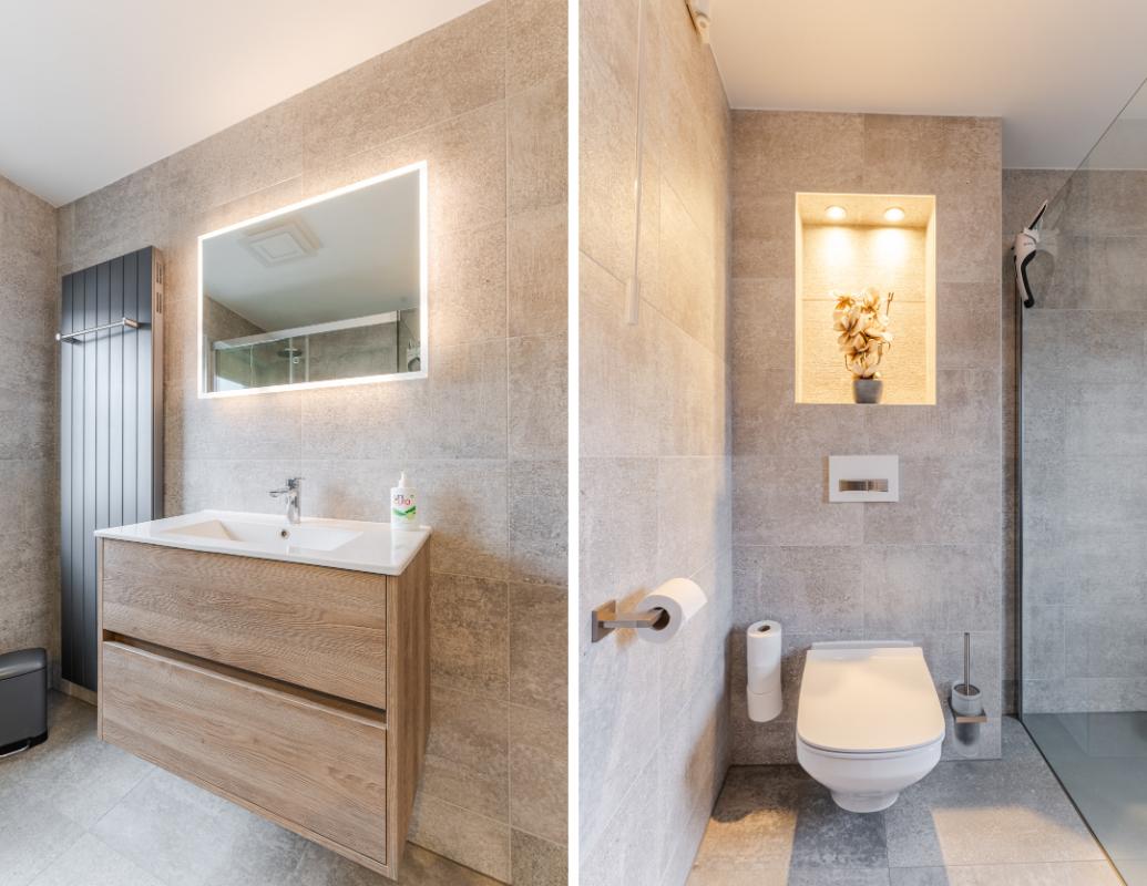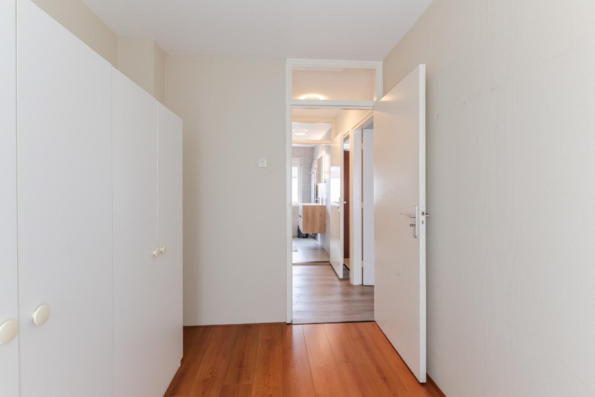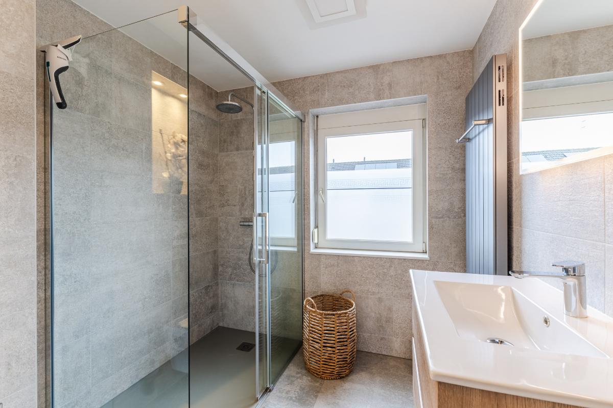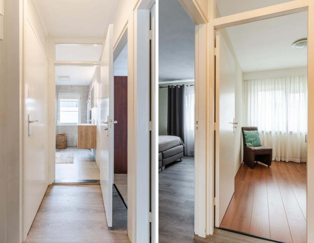 1e Verdieping: Overloop. Op de eerste verdieping bevinden zich 3 comfortabele slaapkamers, waarvan 2 v.v. een airco-unit, en de badkamer. De fraaie badkamer beschikt over een inloopdouche, een hangtoilet, een wastafelmeubel en een designradiator. De badkamer is volledig betegeld. De vloer van de verdieping is v.v. laminaat, de wanden zijn v.v. behang en stucwerk.