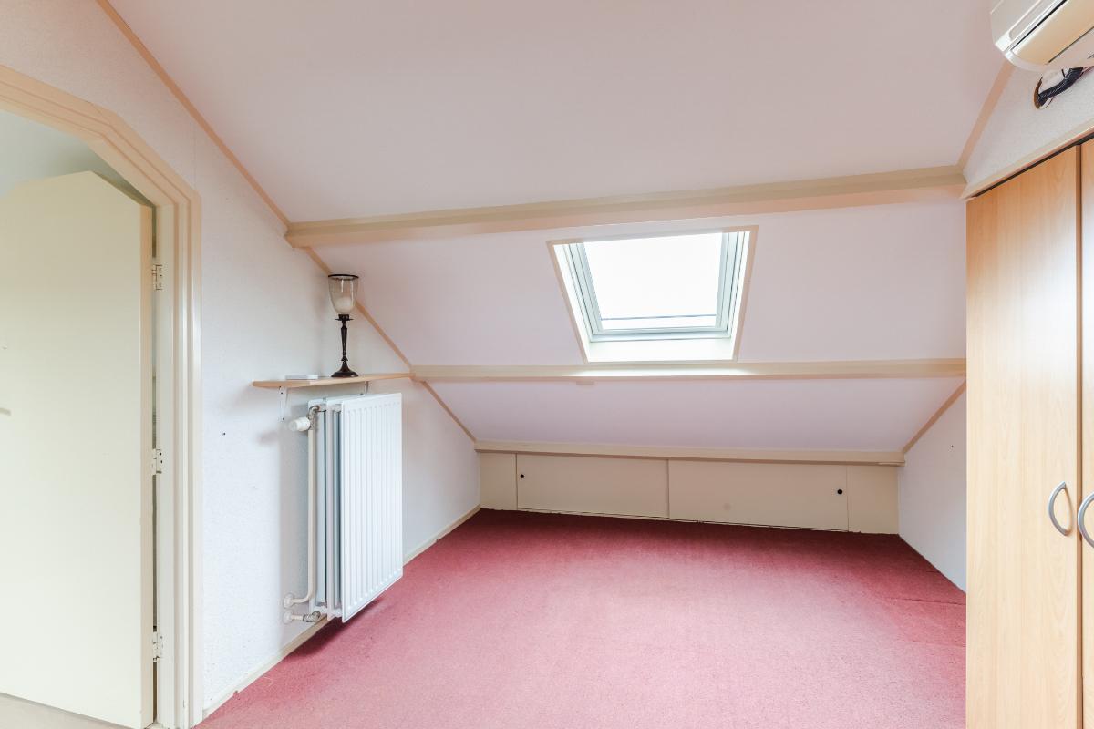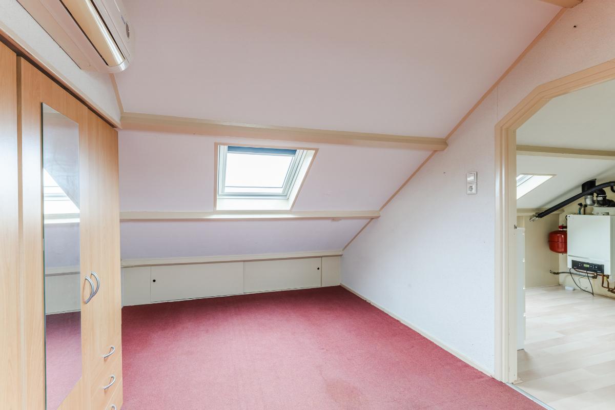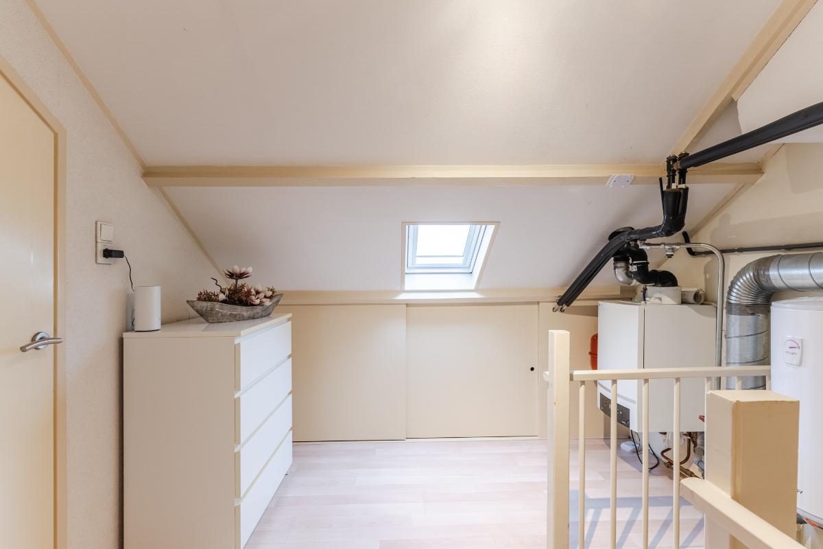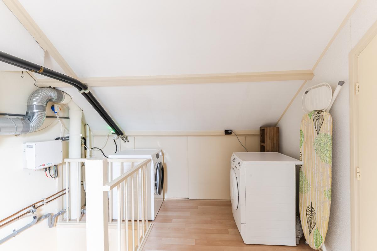 2e Verdieping: Overloop met de opstelling van de wasmachine, droger, CV ketel, boiler en ventilatie unit. Dakraam. Slaapkamer met 2x dakraam en knieschotten.