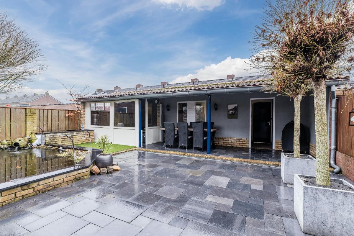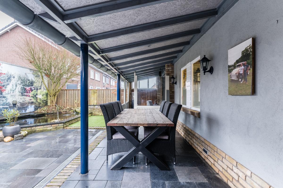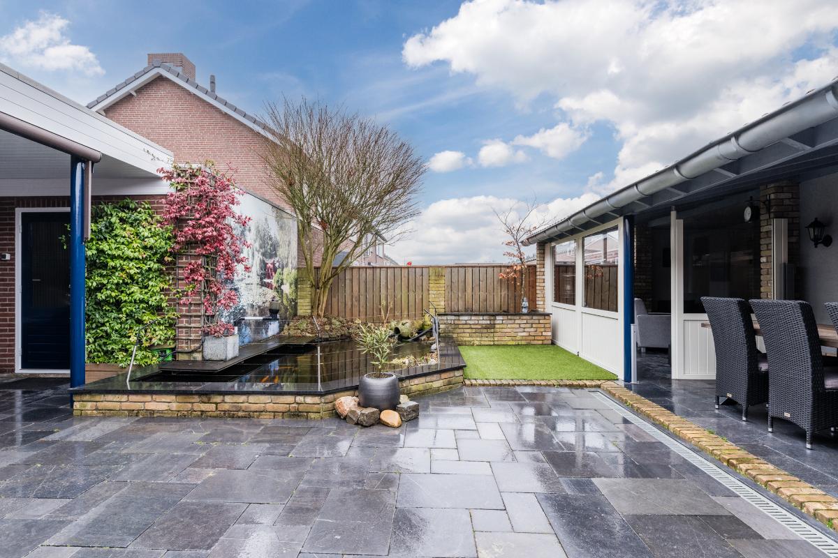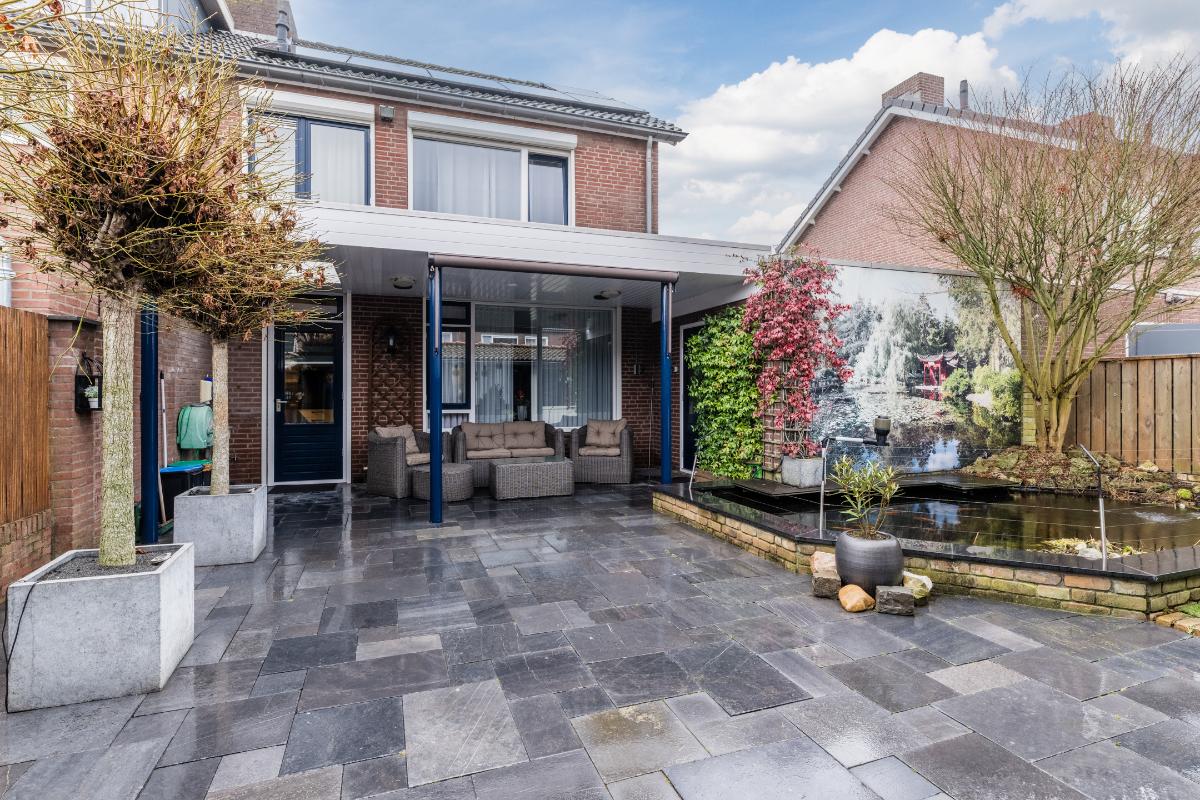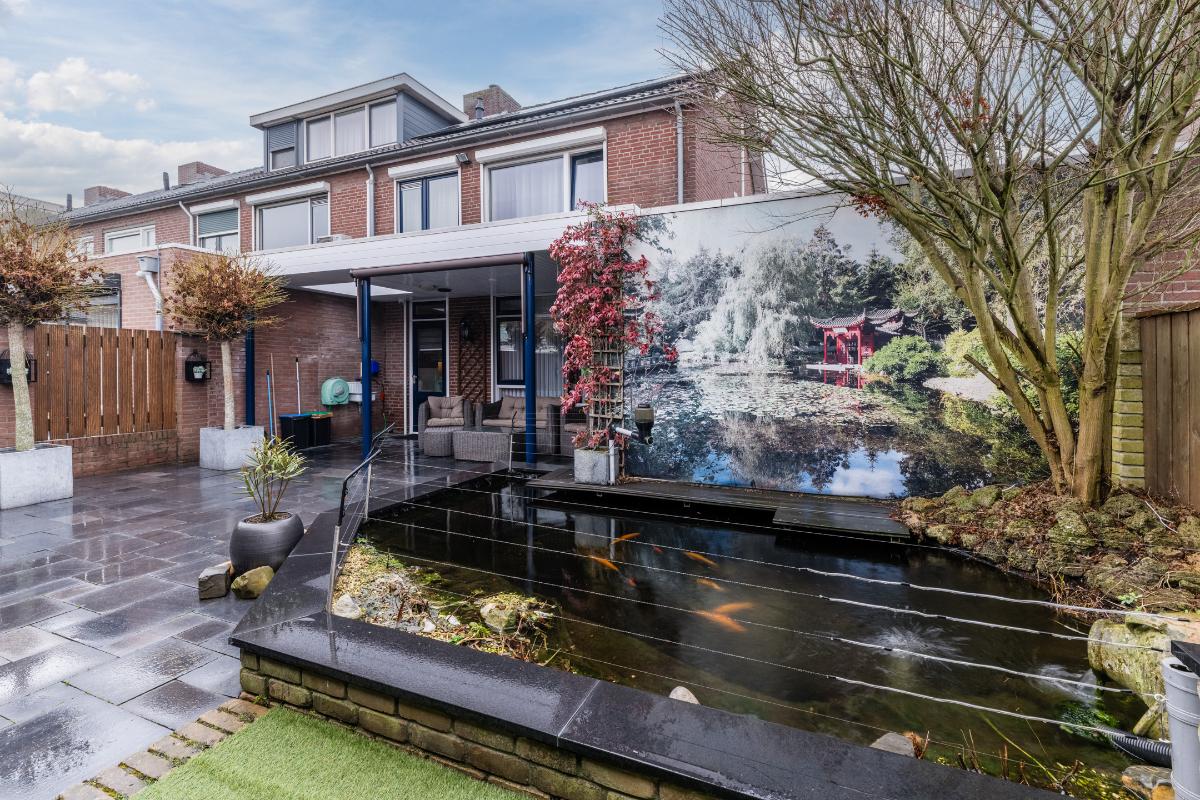 Er is extra aandacht besteedt an de achtertuin. Het terras aan de achterzijde van de woning is overdekt. Achterin de tuin heb je de beschikking over 2 veranda's waarvan 1 afgesloten kan worden. Verder is de tuin volledig v.v. bestrating en een vijver. Uiteraard beschikt de woning over een berging en een achterom naar de brandgang.