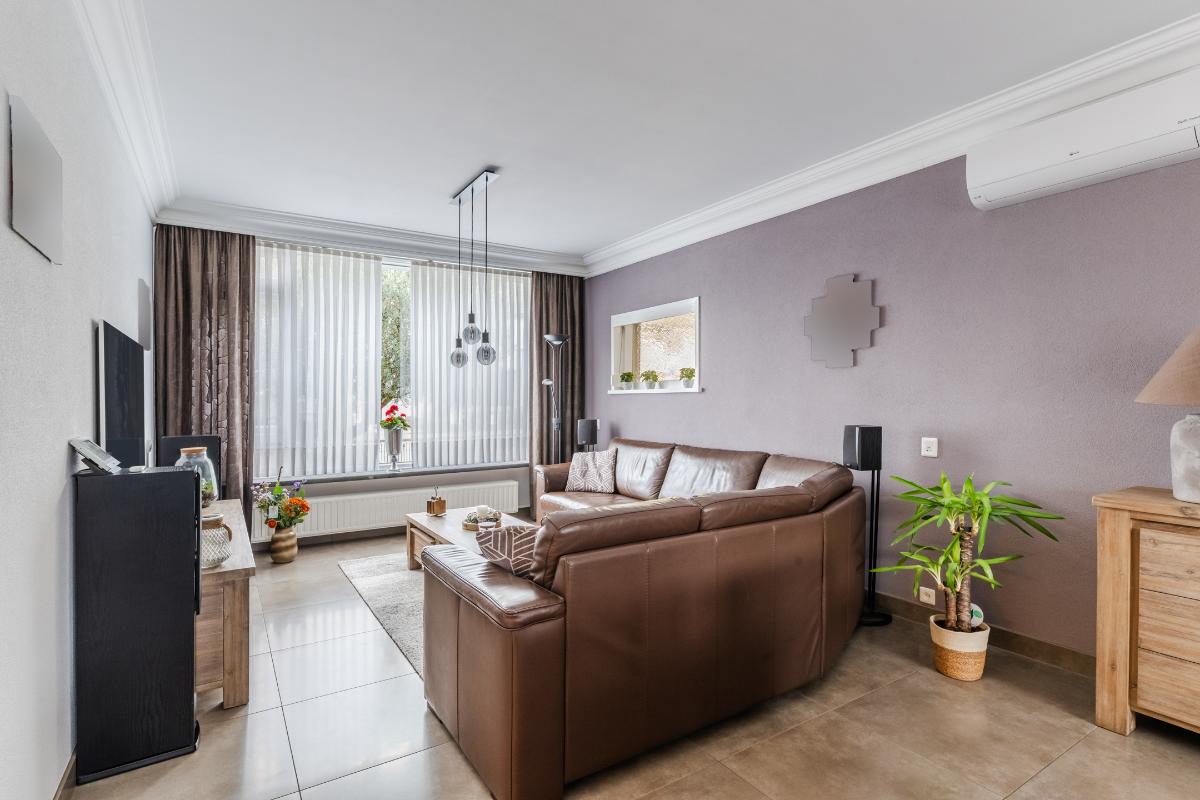 Entree, hal met eterkast, toiletruimte en de trapopgang naar de 1e verdieping. De woonkamer staat ij open verbinding met de moderne keuken. Deze is voorzien van diverse kastjes en lades, een granieten aanrechtblad, een inductie kookplaat, een wasemkap, een combi magnetron/oven, een vaatwasser en een koelkast. In de woonkamer is een airco-unit aanwezig. De vloer van de verdieping is v.v. plavuizen en de wanden van stucwerk.