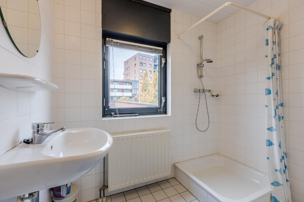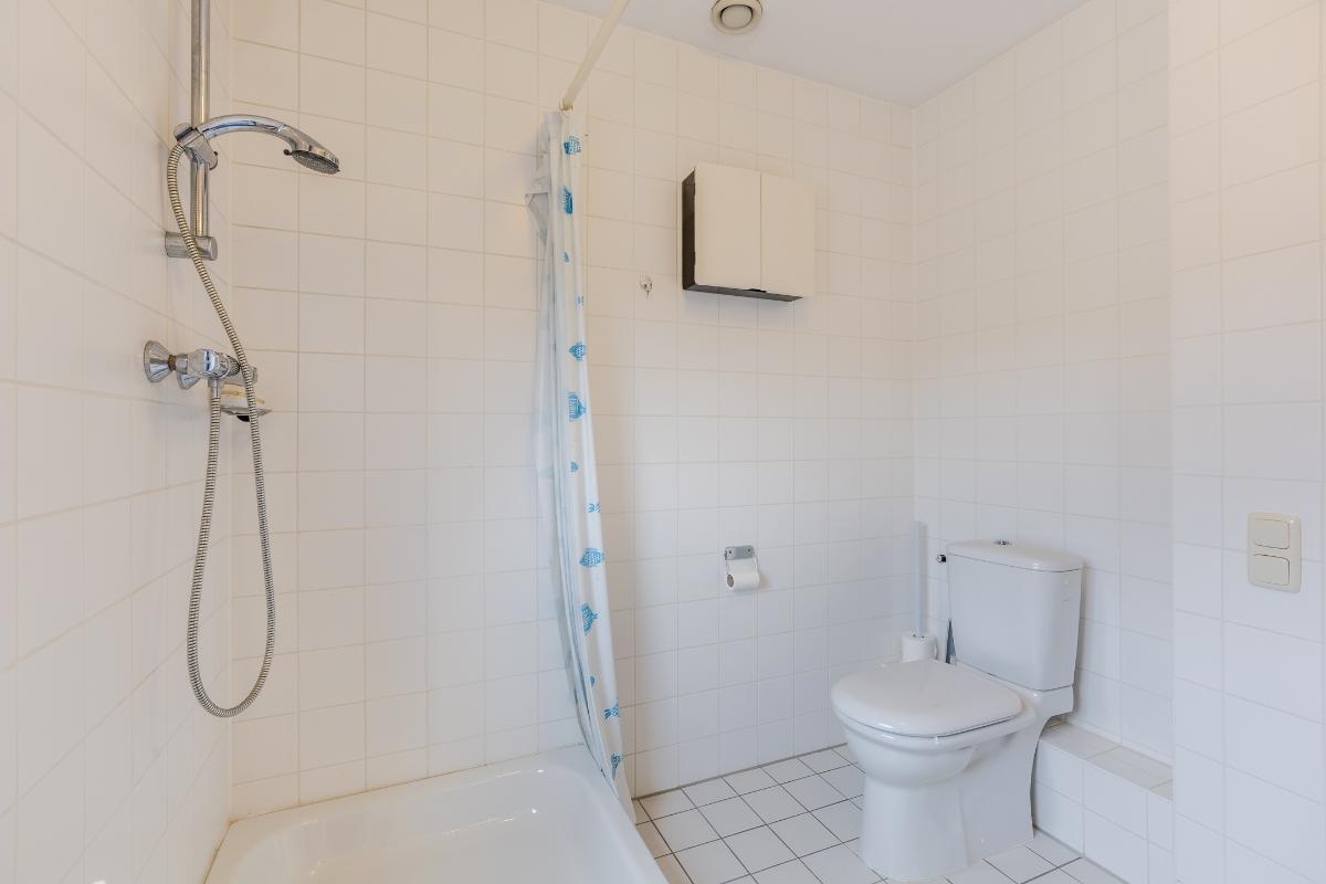 1e Verdieping: Overloop met toegang tot het dakterras, de 2 slaapkamers, de badkamer en de wasruimte. Badkamer douche, wastafel en toilet. Vloer v.v. tapijt. Wanden v.v. stucwerk.