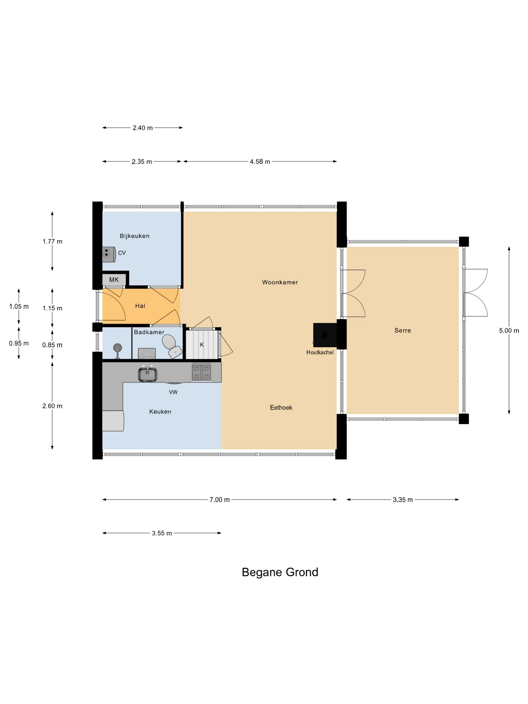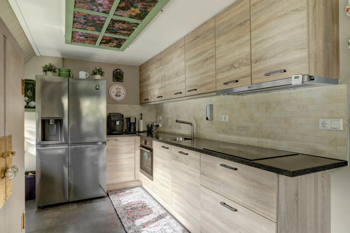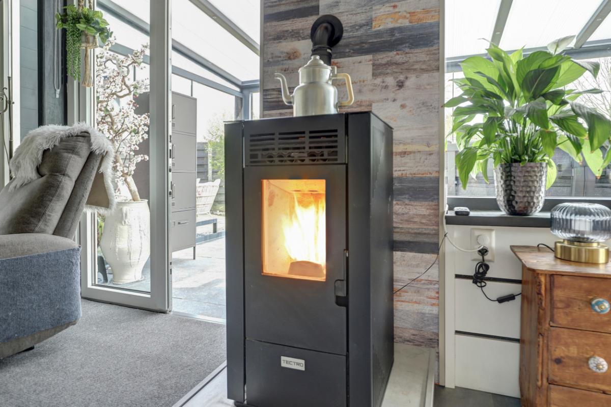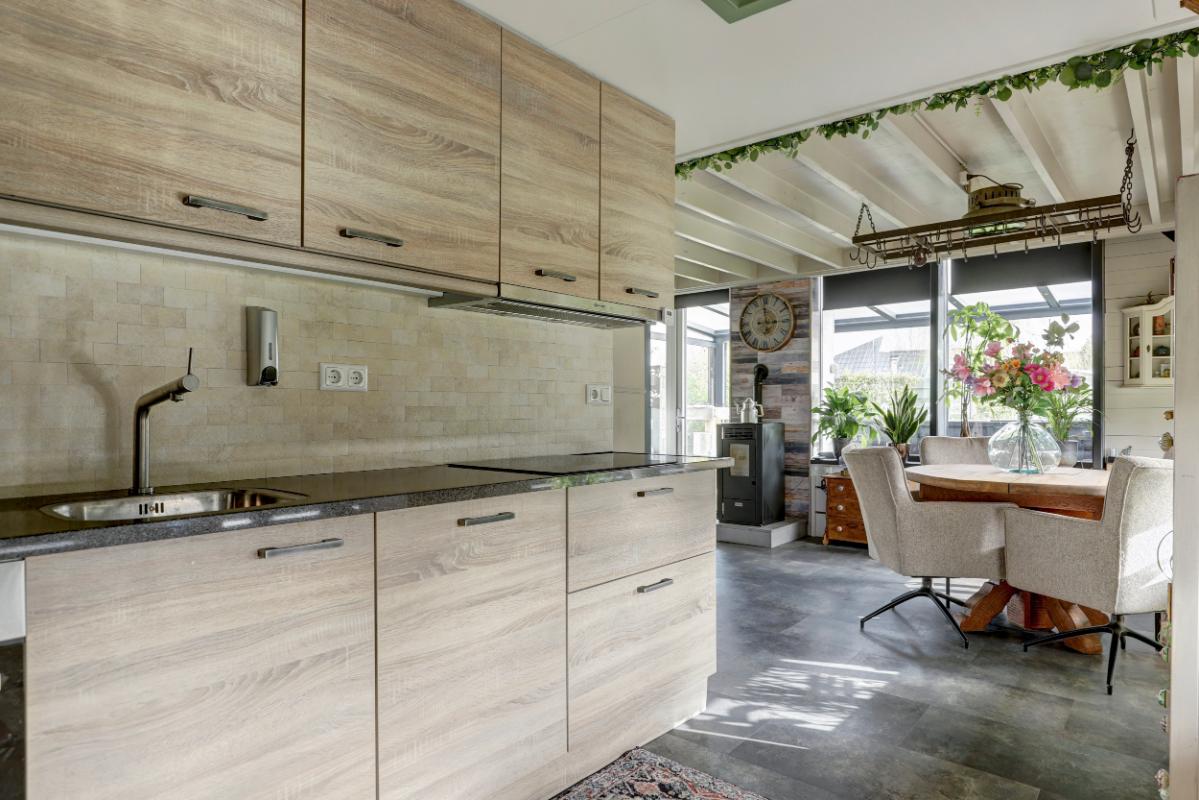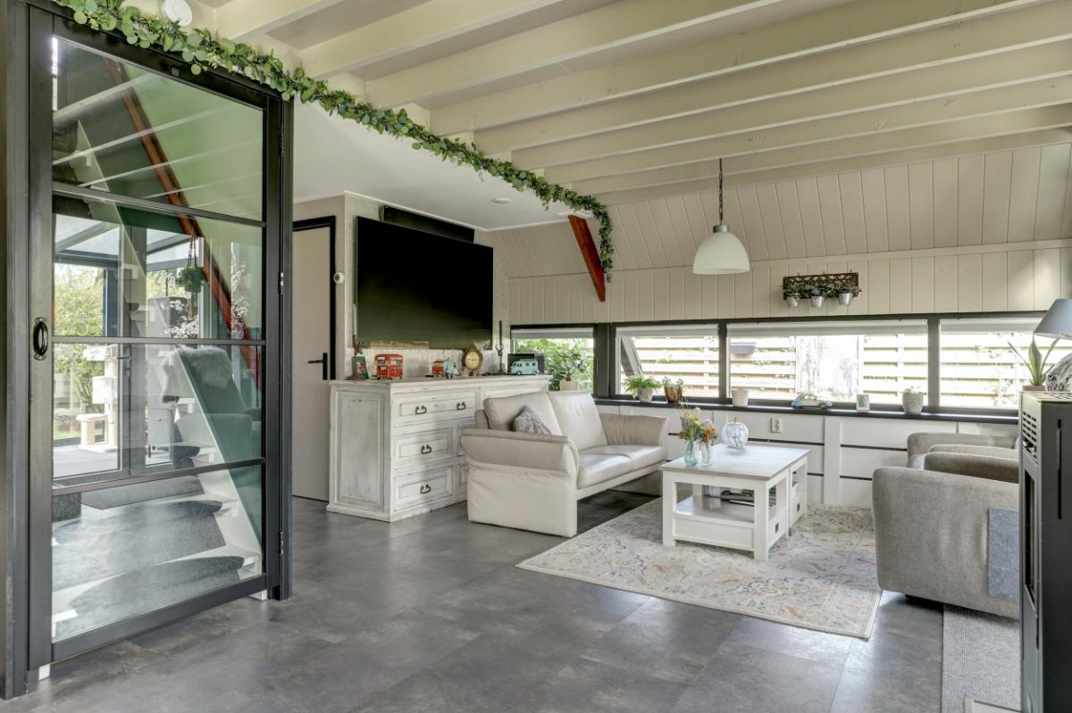 De hal leidt naar de sfeervolle woonkamer met eethoek (circa 30 m²). Dankzij de nieuwe achterpui valt hier veel licht naar binnen en de pelletkachel zorgt voor extra warmte en sfeer. De vloer is afgewerkt met PVC en de wanden zijn geïsoleerd en voorzien van betimmering.