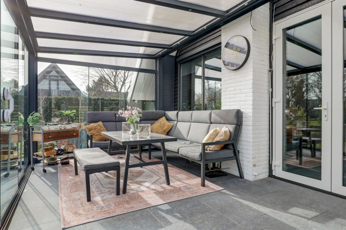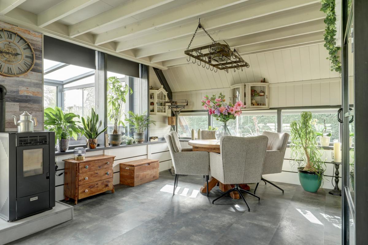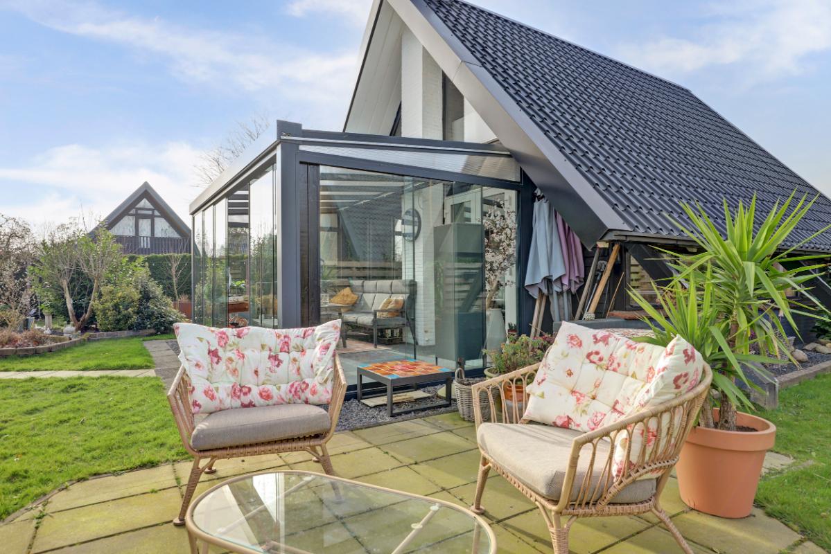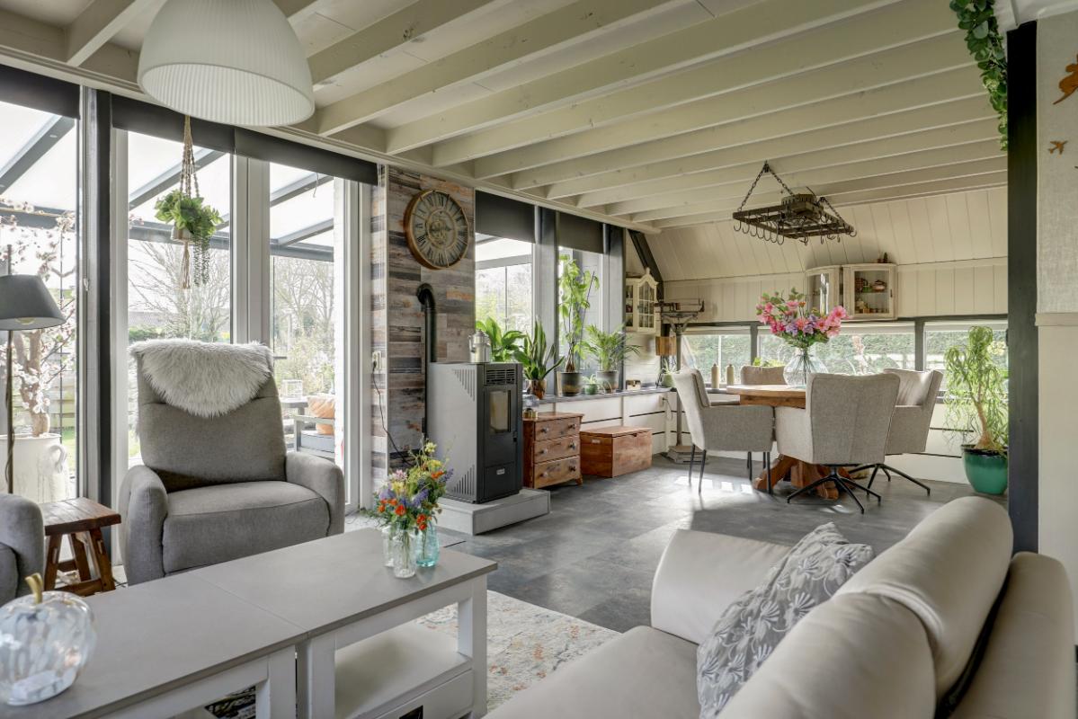 Via de woonkamer stap je de serre (18 m²) binnen. Met glazen wanden en een glazen dak met zonwering is dit een heerlijke plek waar je al vroeg in het voorjaar van het buitenleven geniet.