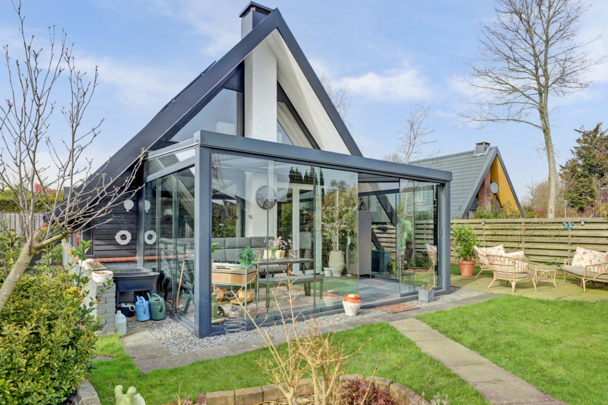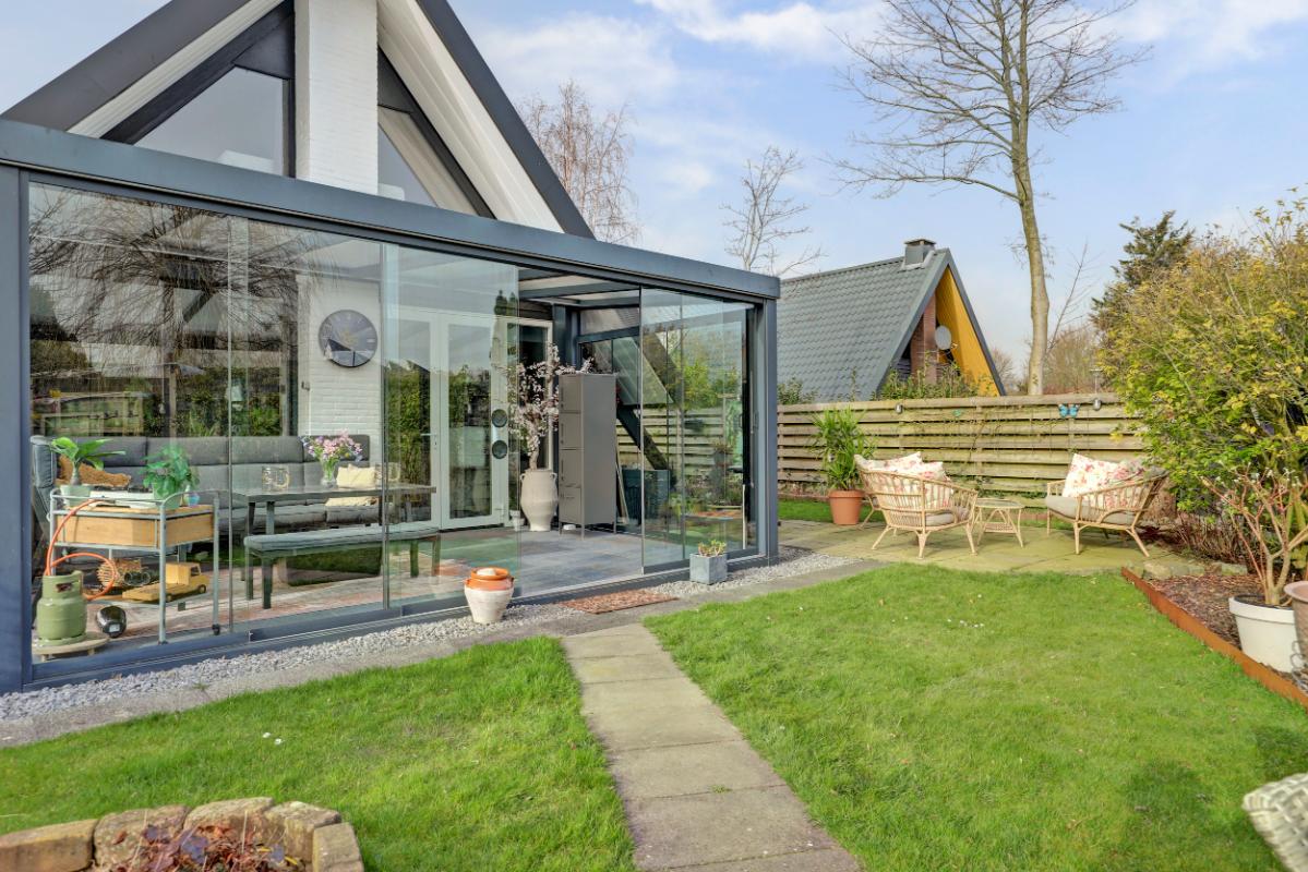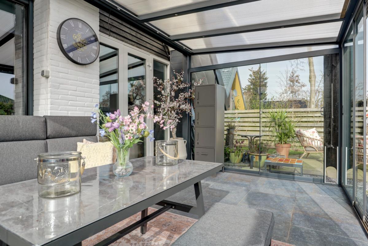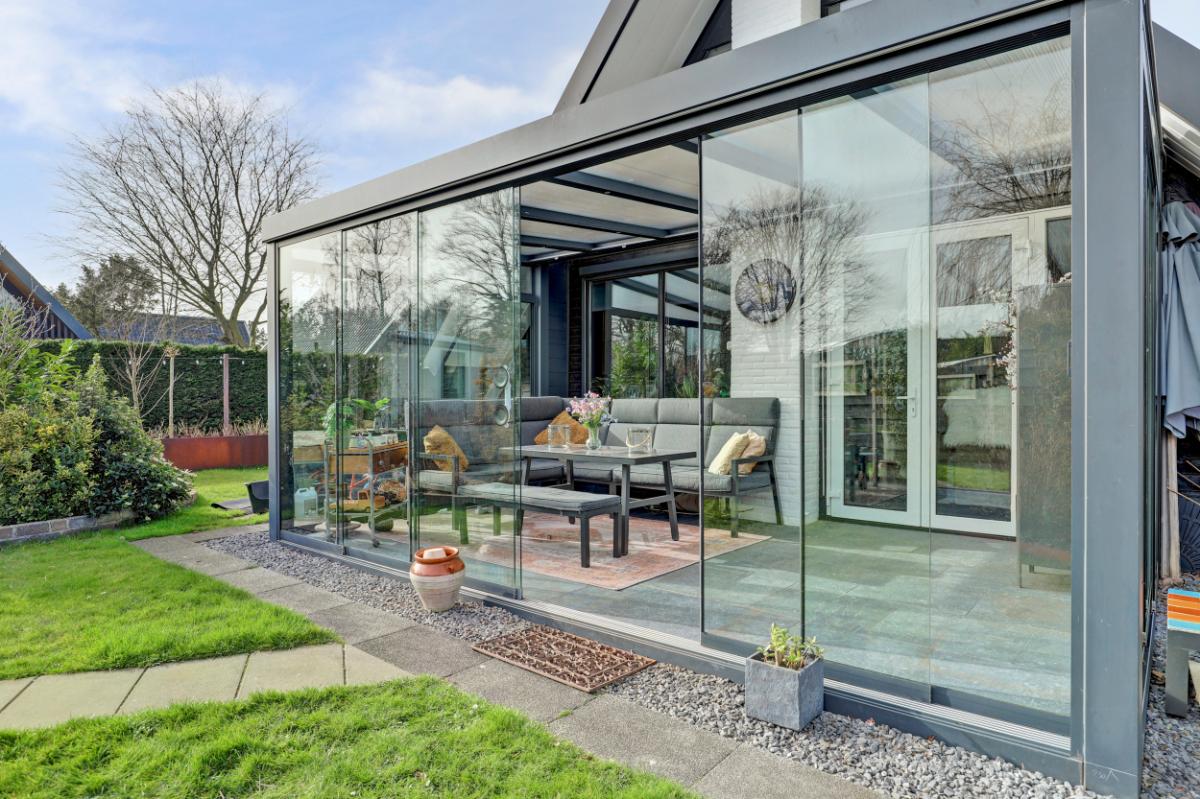 Via de woonkamer stap je de serre (18 m²) binnen. Met glazen wanden en een glazen dak met zonwering is dit een heerlijke plek waar je al vroeg in het voorjaar van het buitenleven geniet.