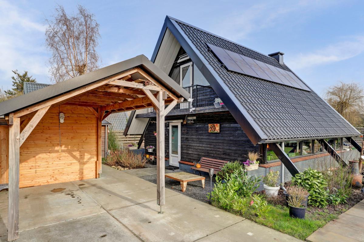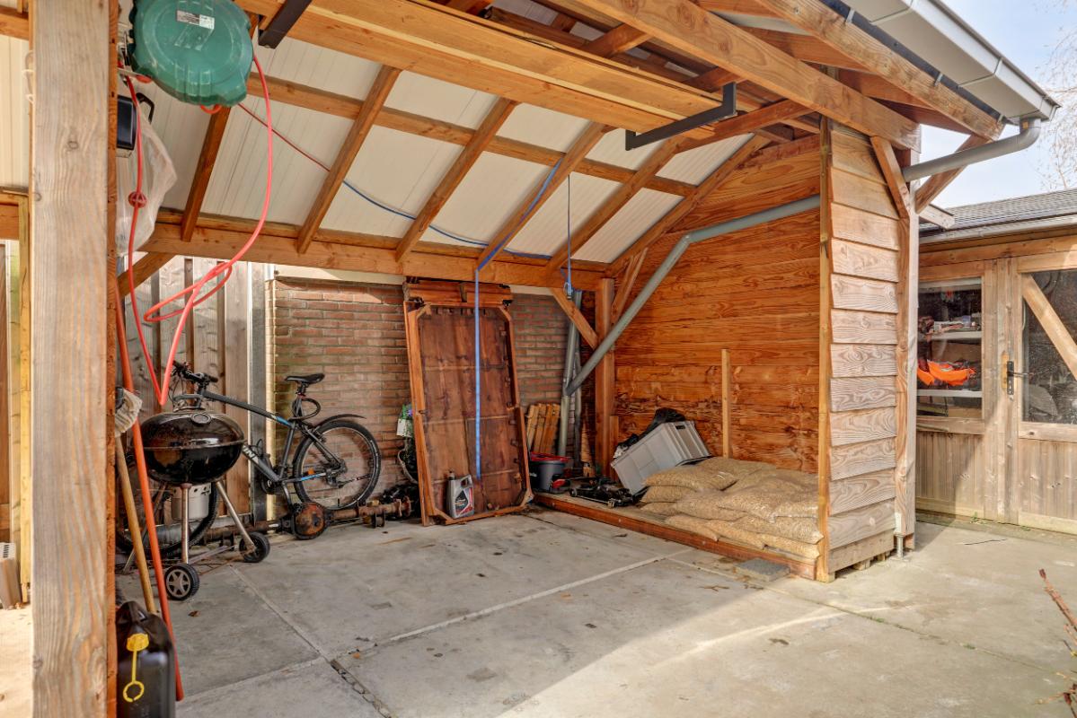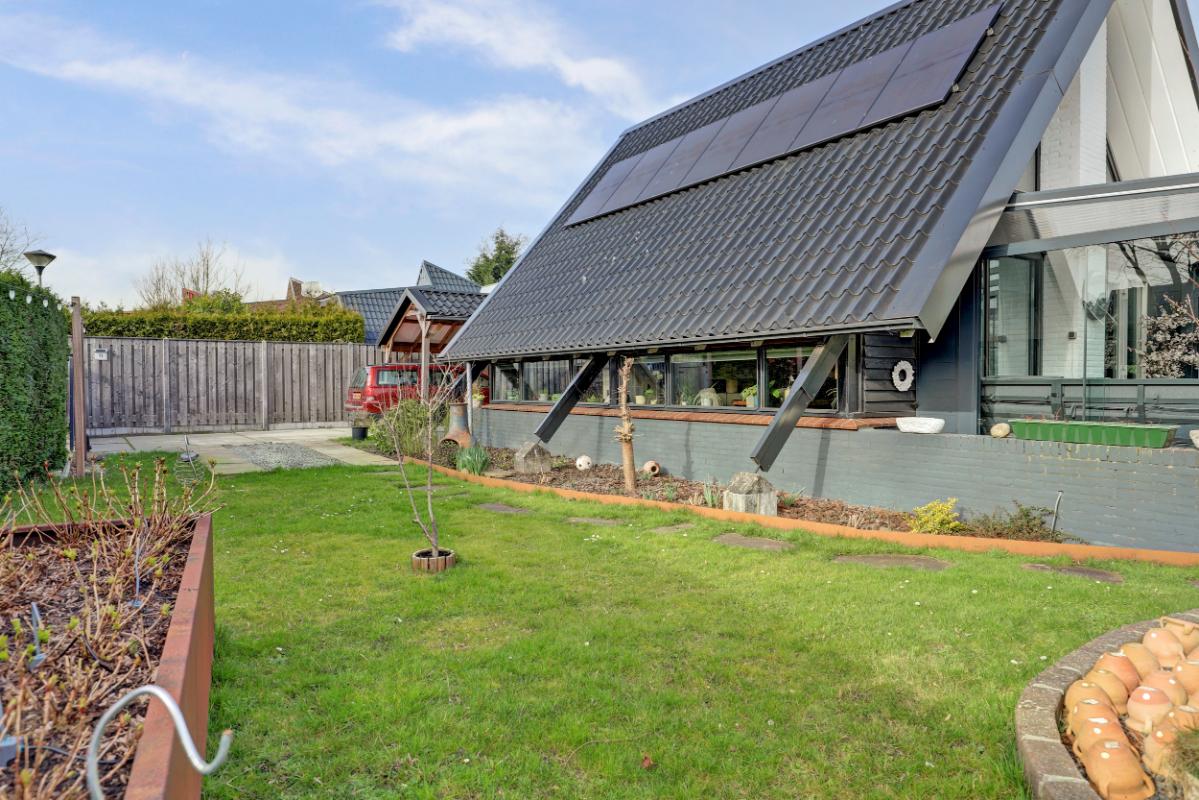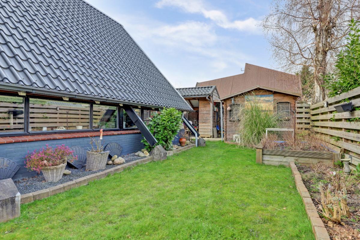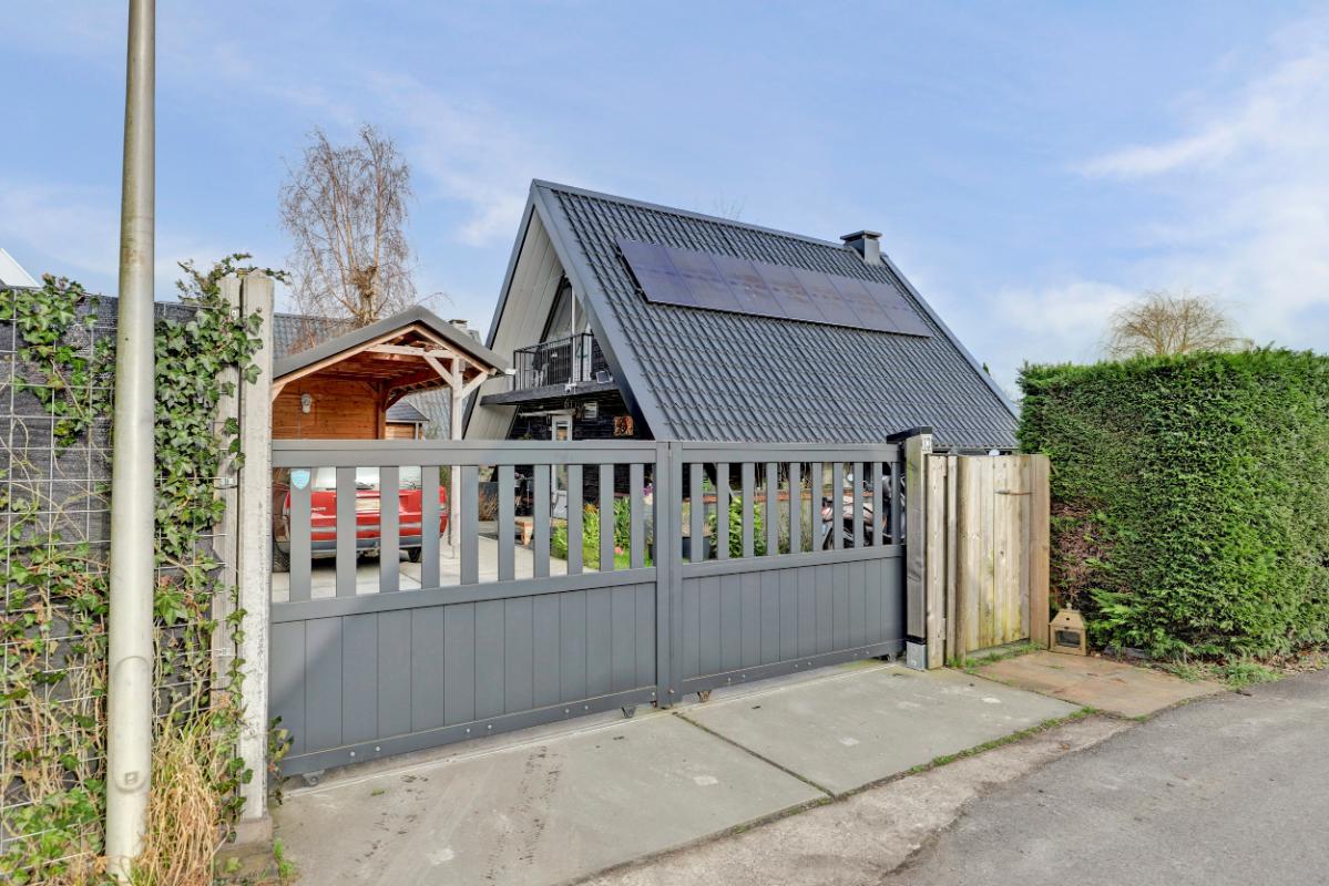 Het perceel is bereikbaar via een schuifpoort met daarachter een oprit, carport en overkapping. De tuin ligt rondom de woning en biedt volop privacy. Je vindt hier meerdere terrassen, een gazon, fraaie borders, een blokhut en zelfs een sauna. Een heerlijke plek om te ontspannen en te genieten van het buitenleven.