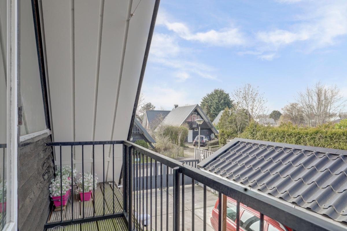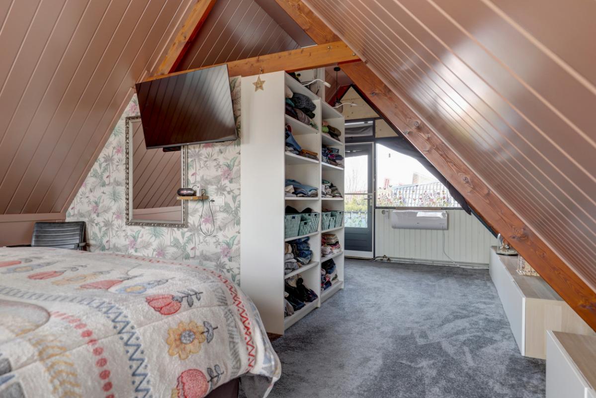 Via een vaste trap bereik je de royale open ruimte van circa 30 m² met inloopkast en balkon. Deze verdieping kan eenvoudig worden ingedeeld in twee slaapkamers. De vloer is voorzien van tapijt en het dak is sfeervol afgewerkt met houten betimmering. Voor extra comfort heeft u hier ook nog de beschikking over een comfortabele airco.