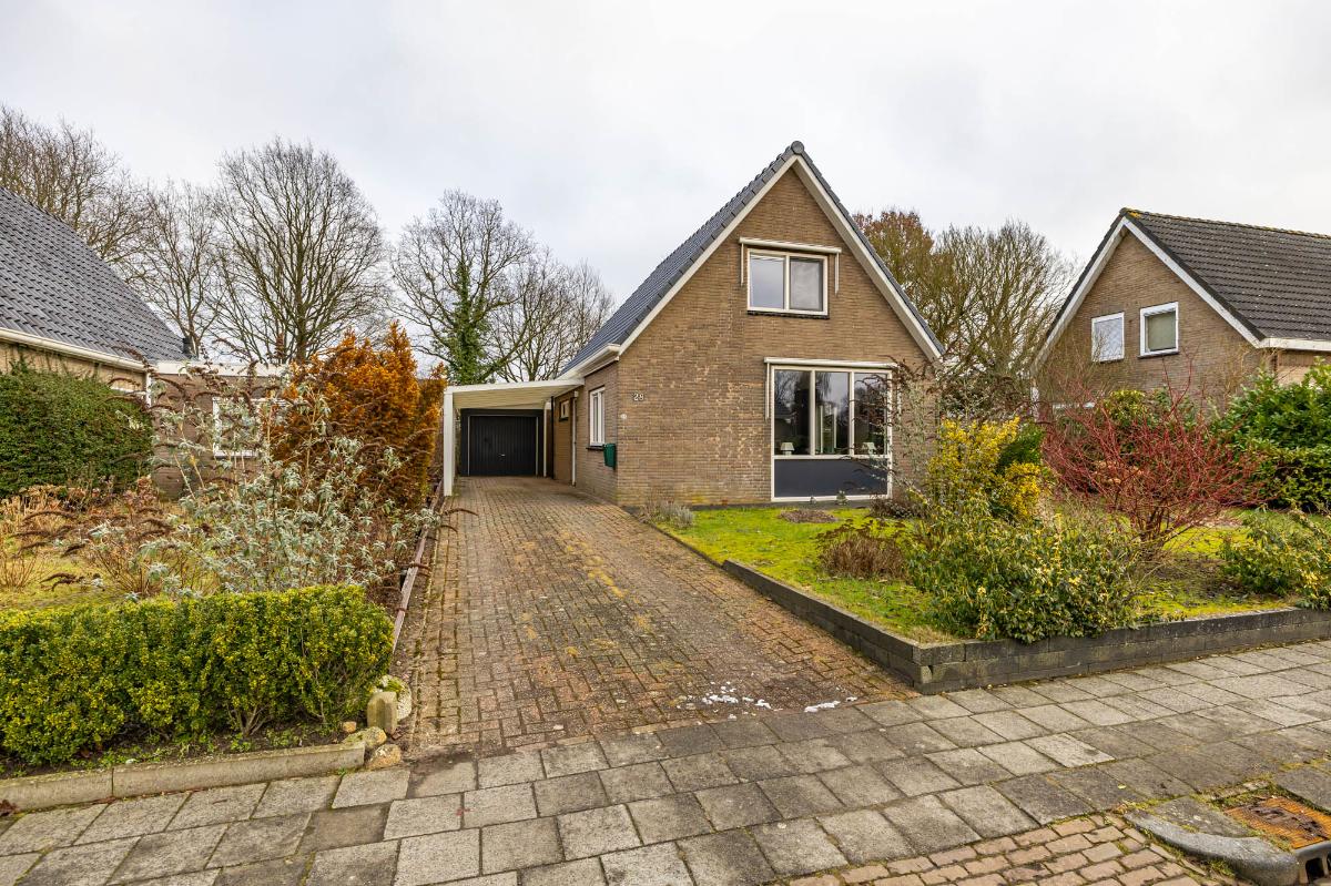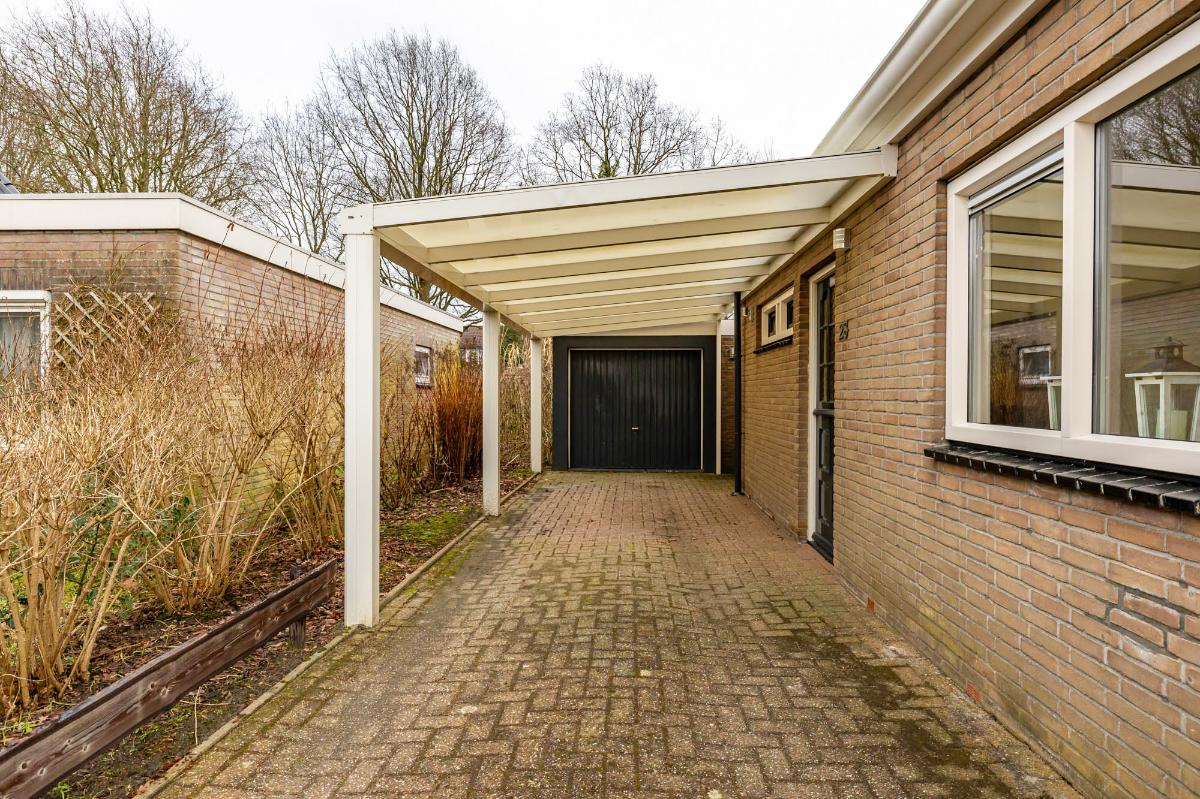 Een overkapping en de ruime stenen garage, bereikbaar via de zijdeur en de carport, maken het geheel compleet.