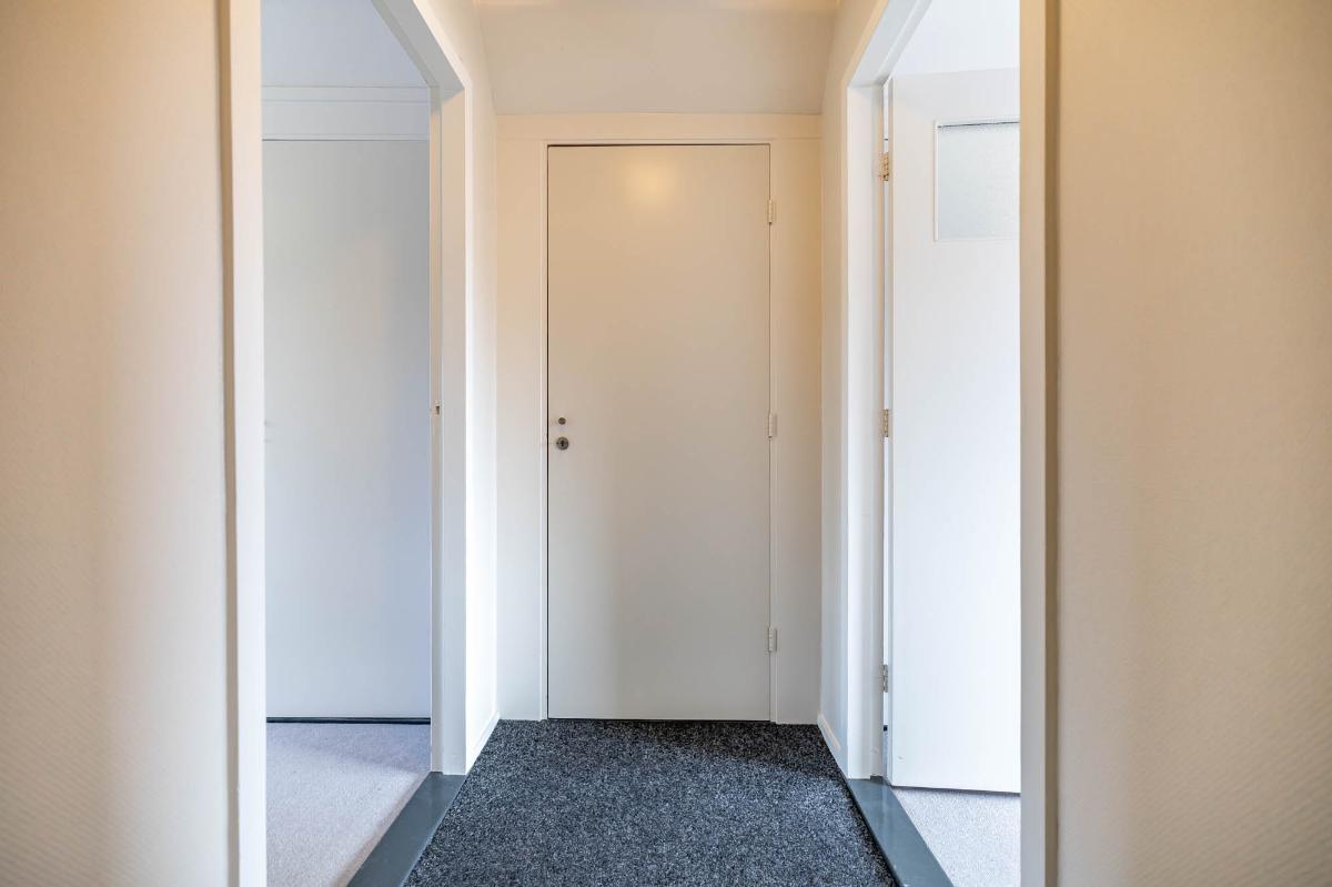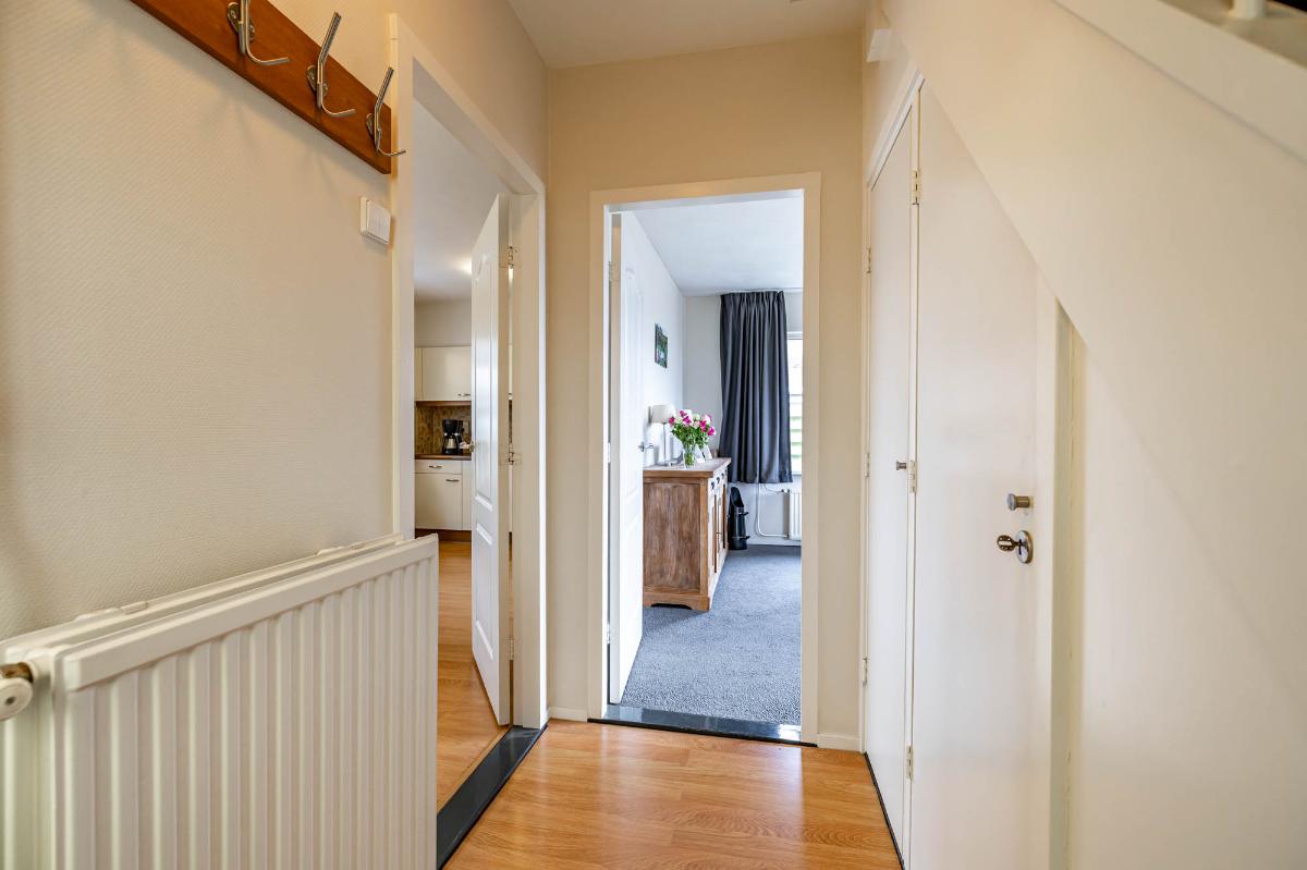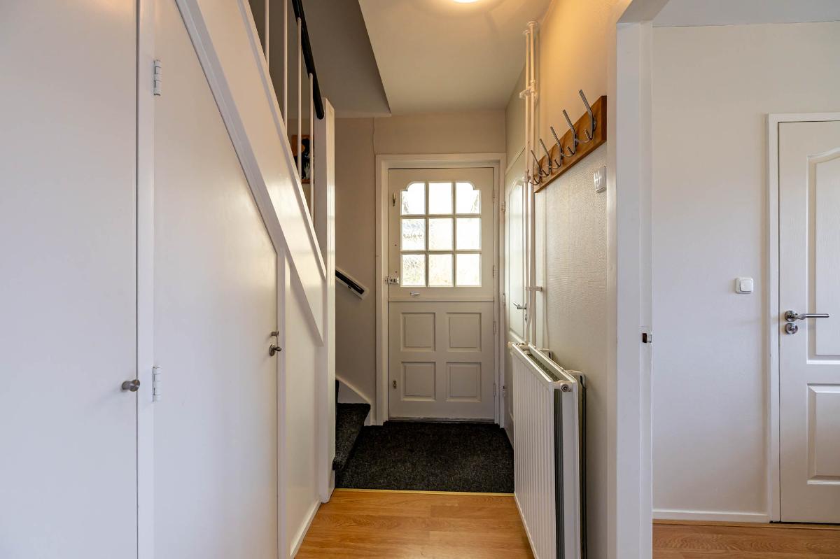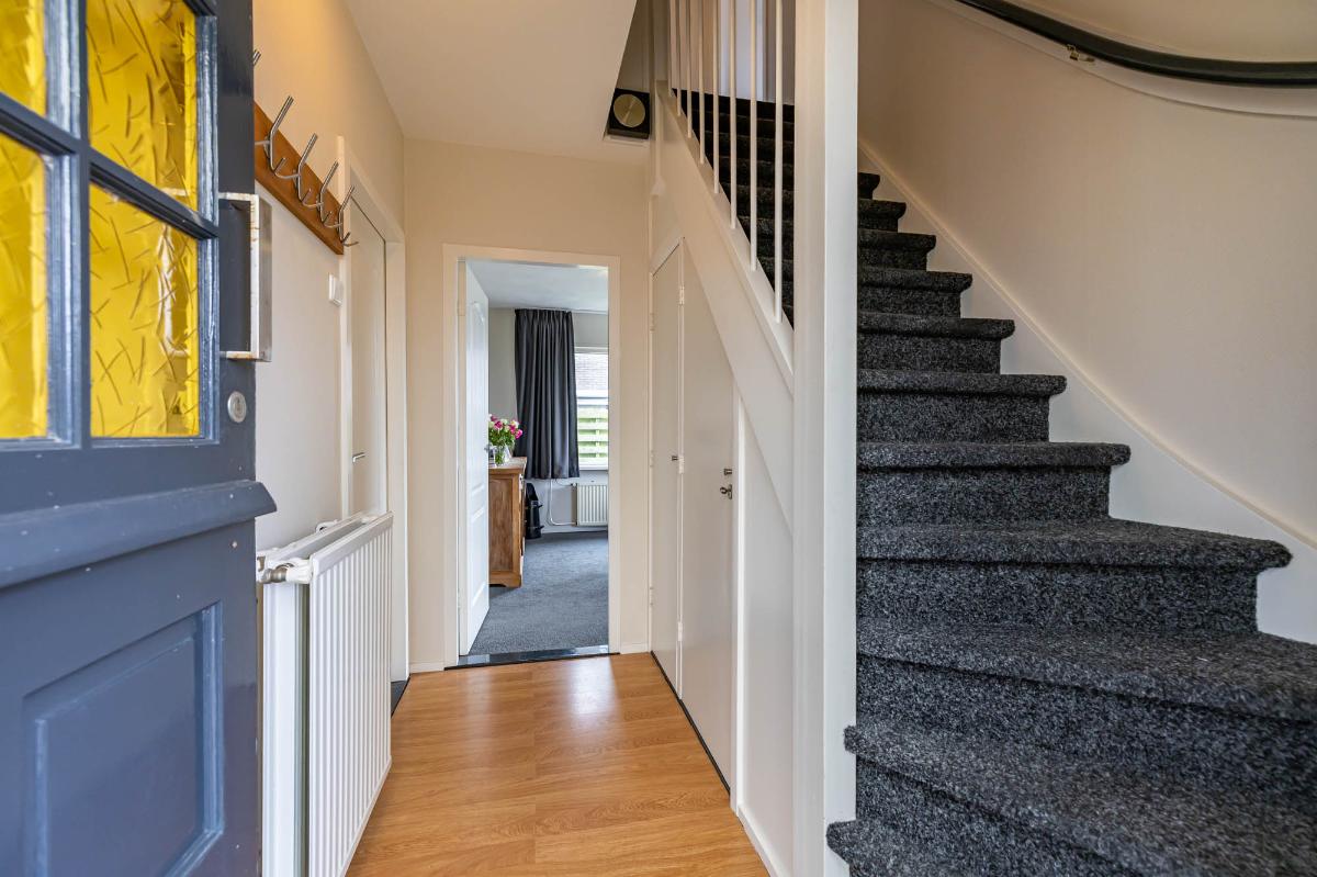 Begane grond Via de verzorgde voortuin bereik je de voordeur, beschut gelegen onder de carport. In de hal vind je de trap naar de eerste verdieping, een praktische trapkast en de meterkast. Vanuit de hal is er toegang tot het nette, volledig betegelde toilet, de keuken en de woonkamer.