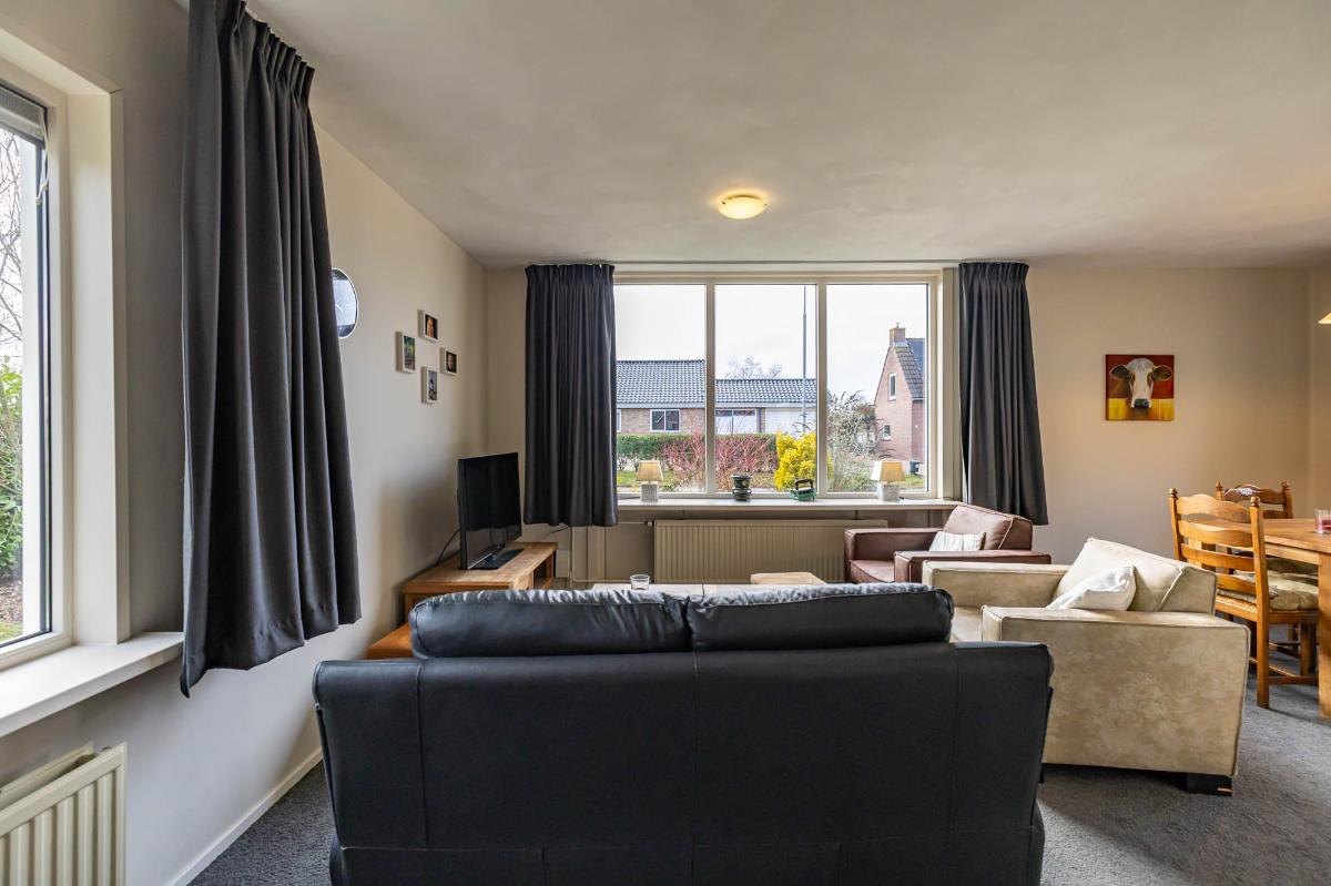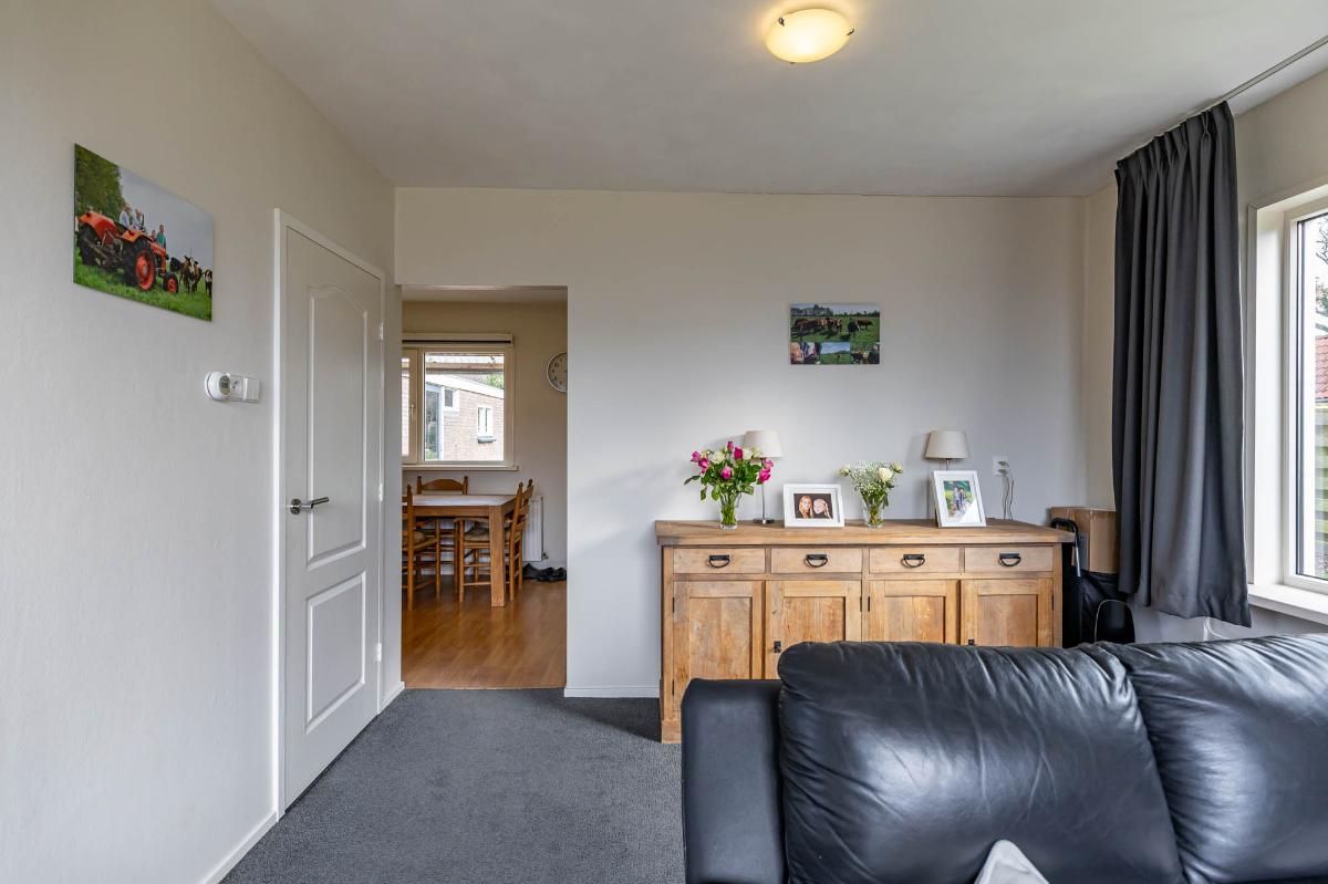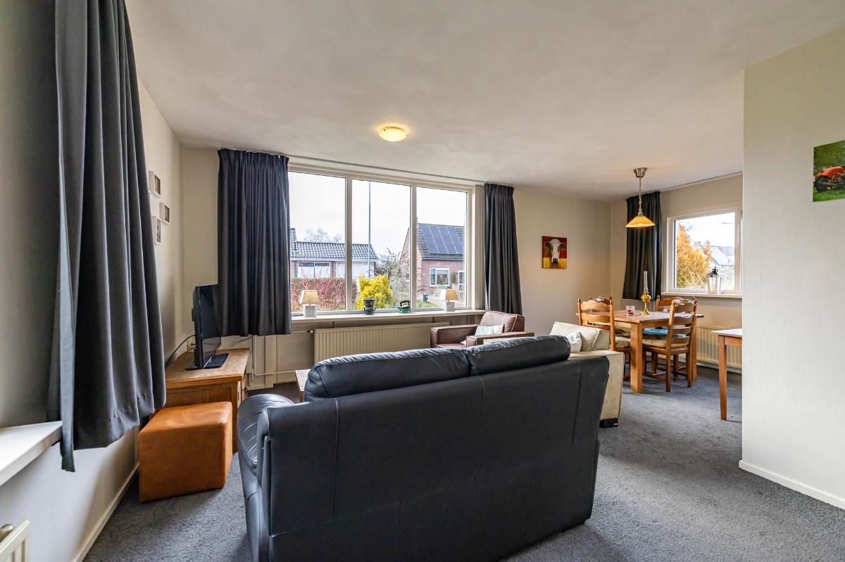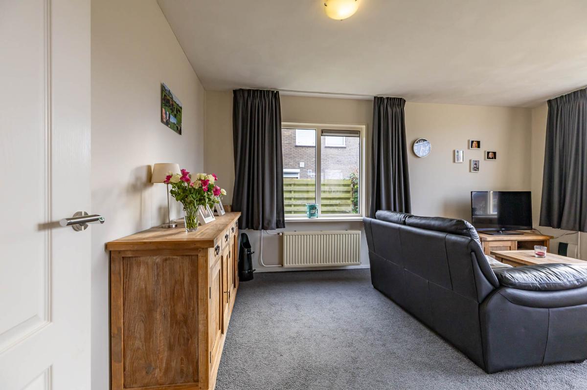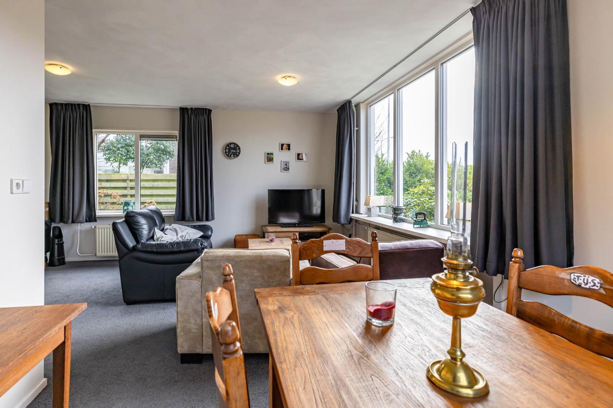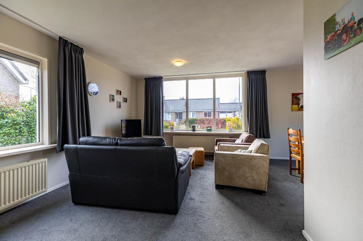 De woonkamer is licht en sfeervol, met een speelse L-vorm die gezelligheid combineert met ruimte. Grote ramen bieden een fraai uitzicht op de voortuin en laten veel daglicht binnen.