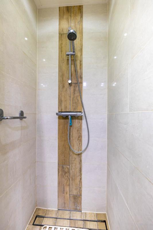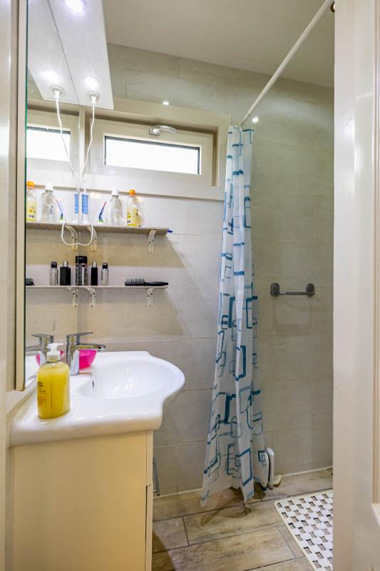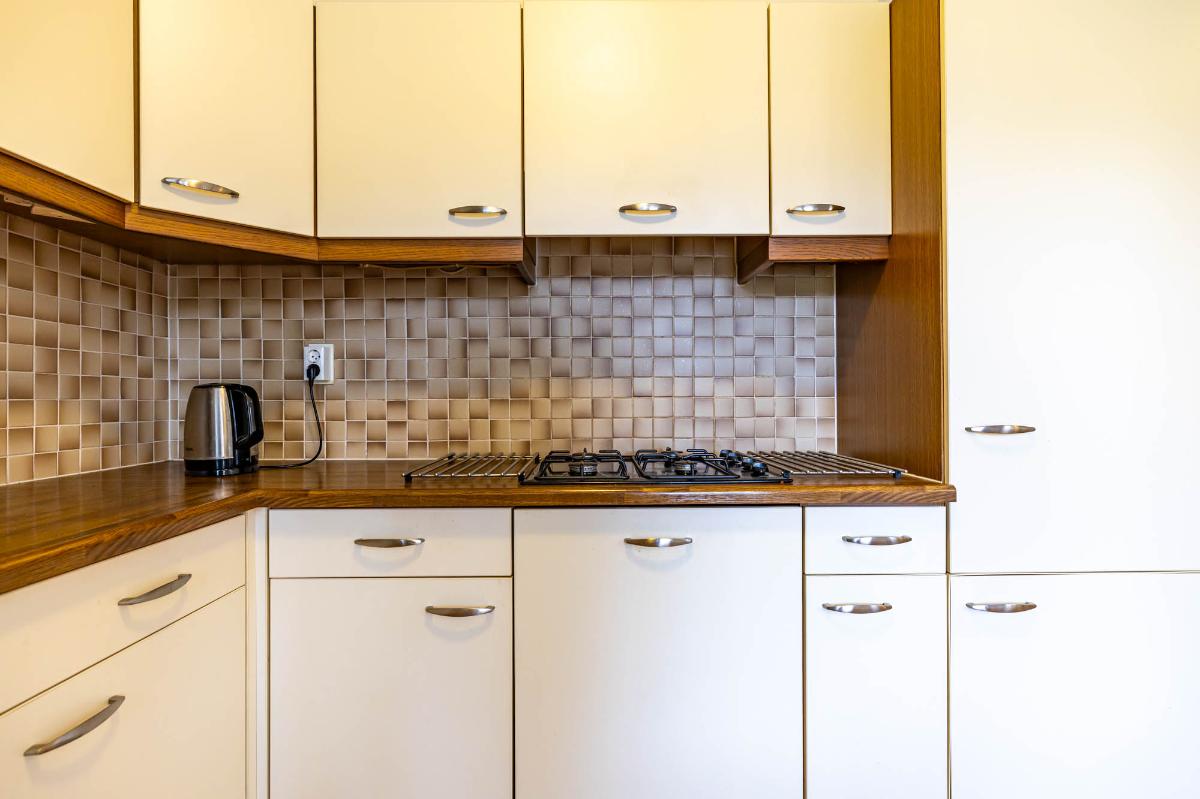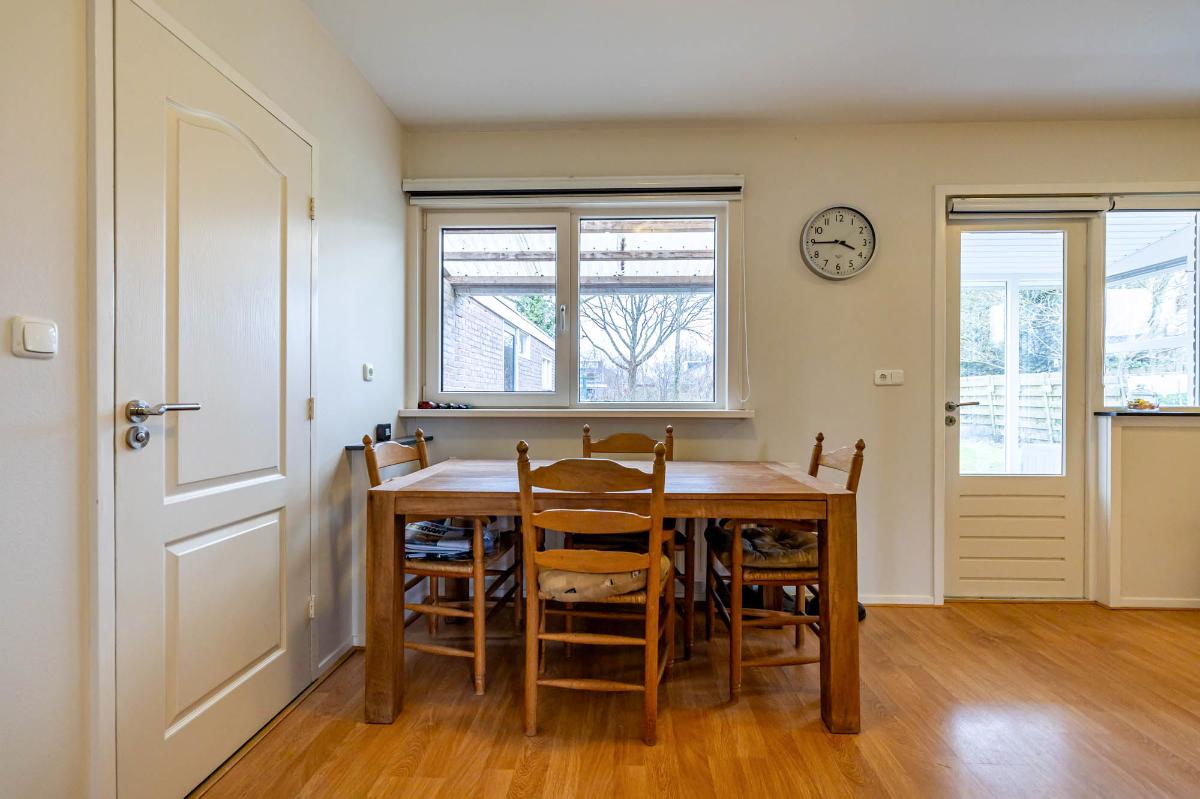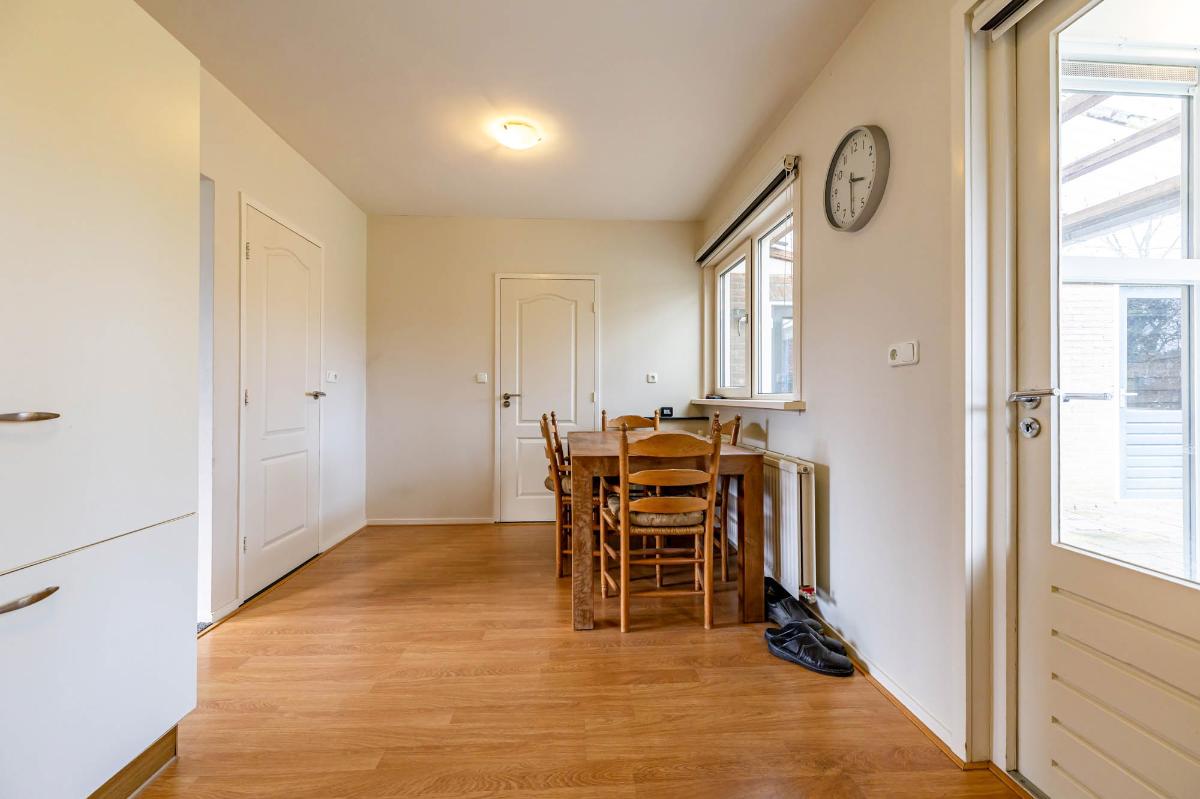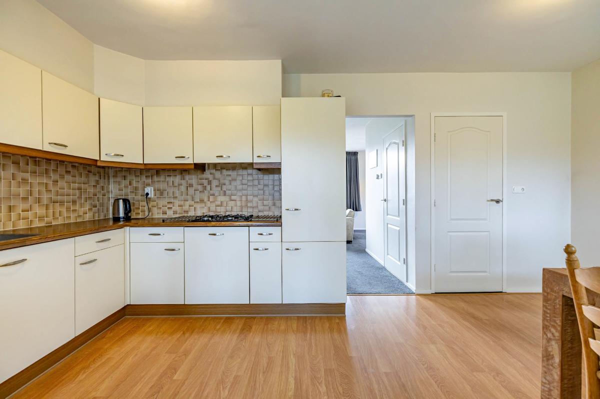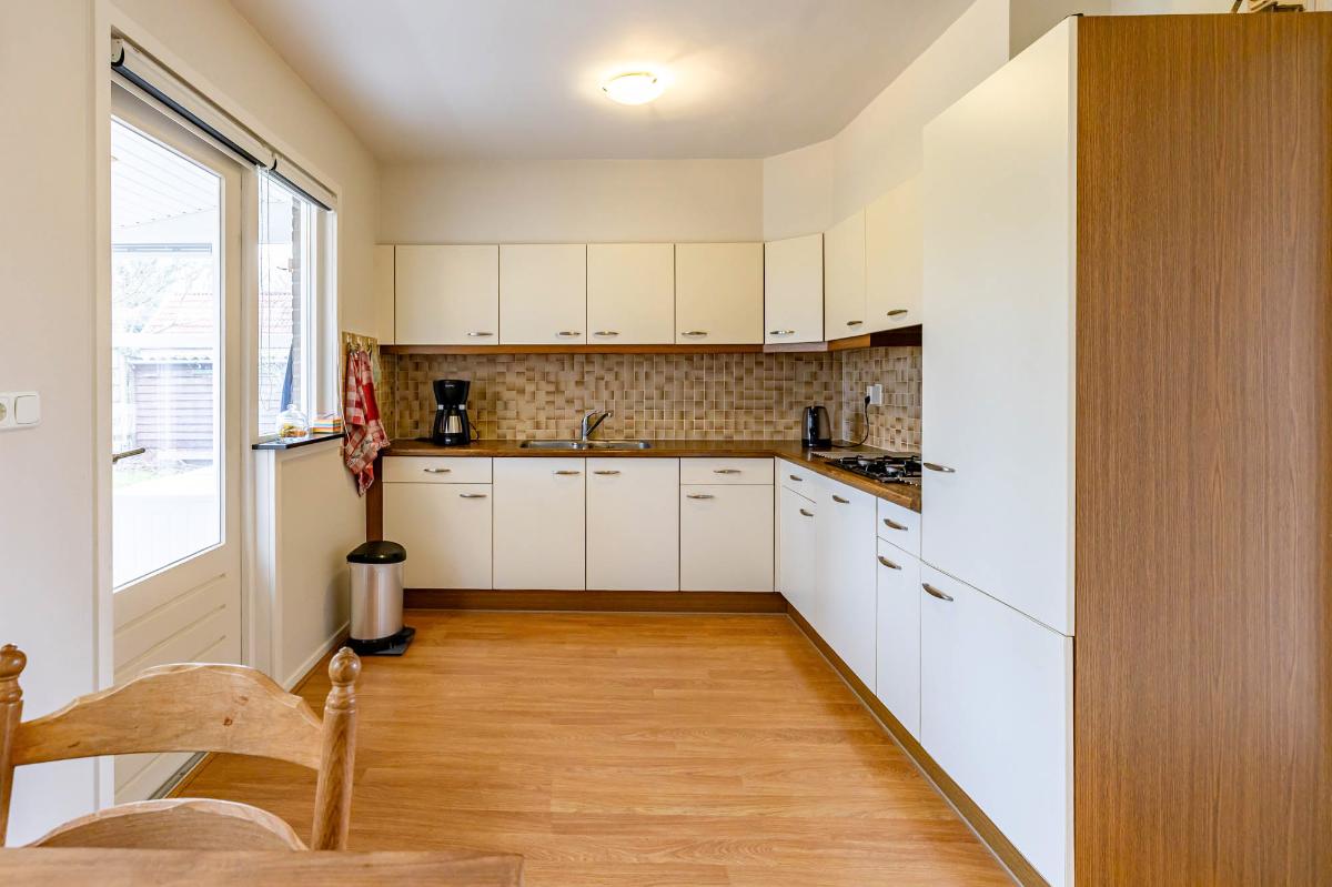 De keuken bevindt zich aan de achterzijde van de woning en biedt voldoende ruimte voor een fijne eethoek. De ruime keuken is voorzien van een dubbele spoelbak, gaskookplaat, vaatwasser en ingebouwde koelkast en vriezer. Vanuit de keuken is er toegang tot de doucheruimte en de serre, waar de wasmachineaansluiting is geplaatst. Met een moderne update van de keuken en eventueel de vloer creëer je hier een moderne, functionele leefruimte.