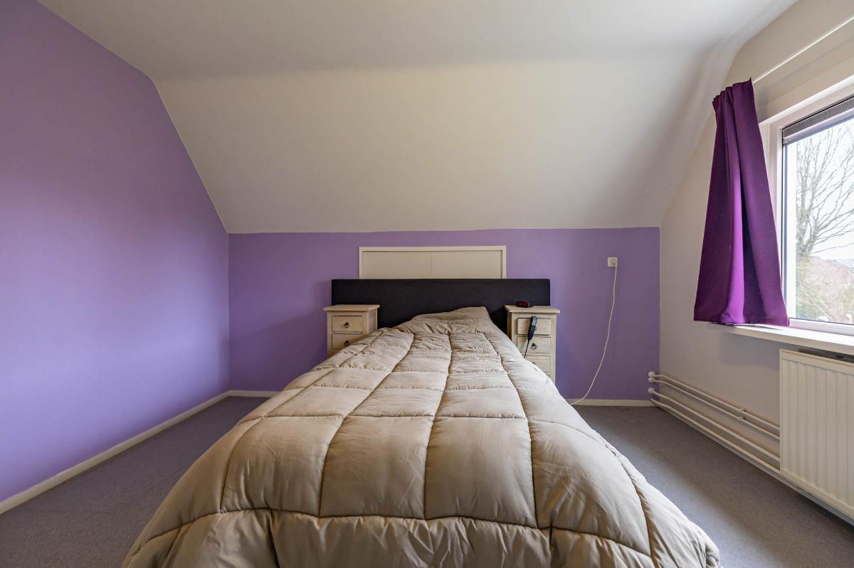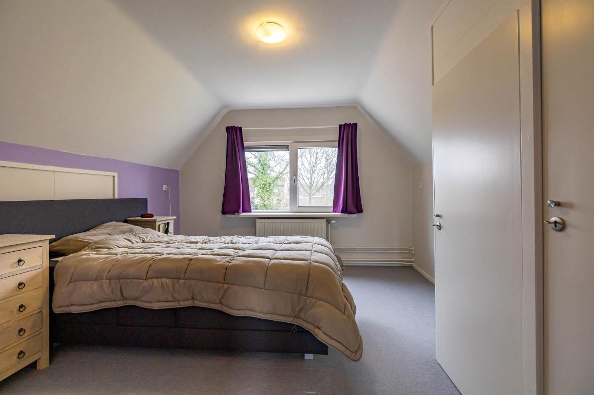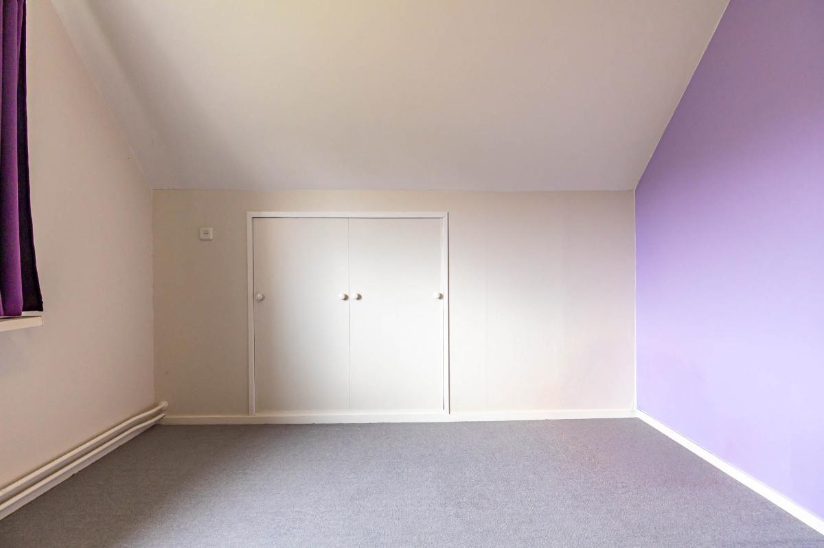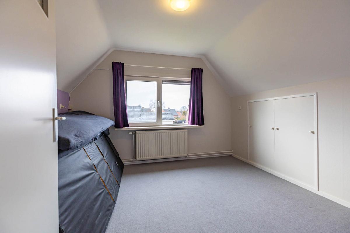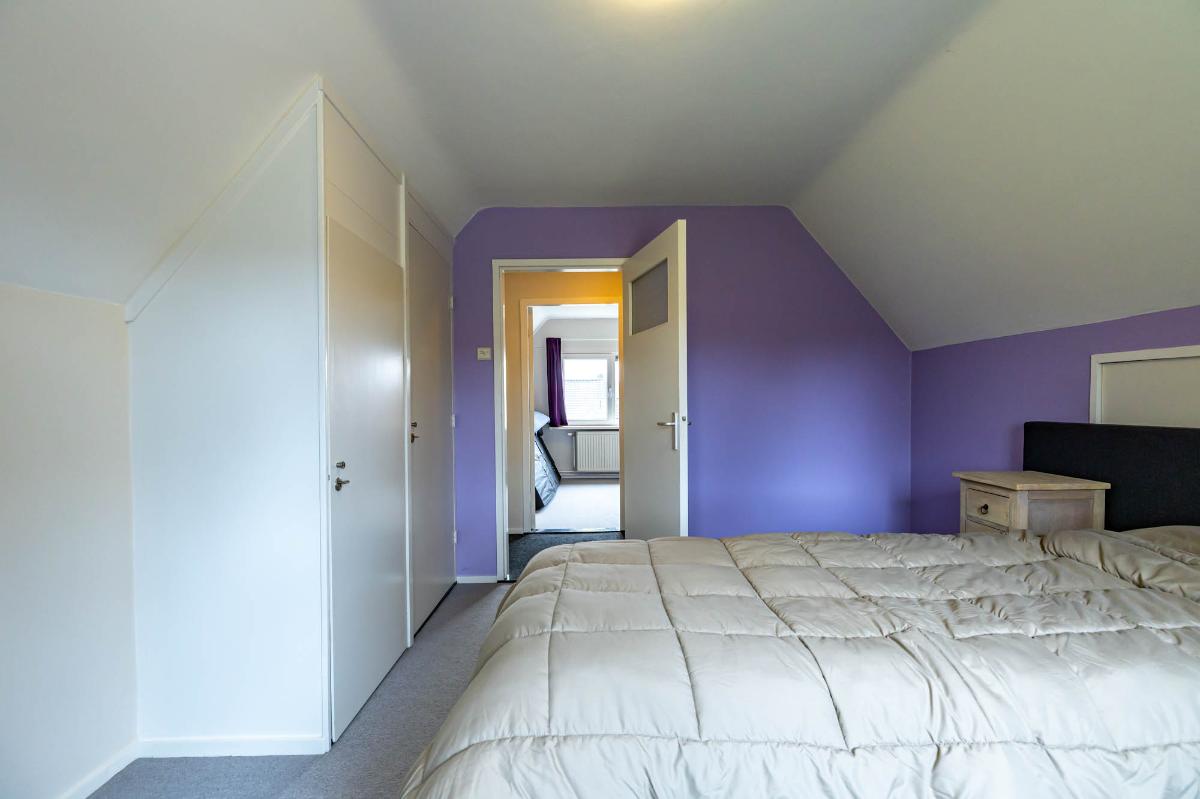 Eerste verdieping Op de eerste verdieping bevinden zich twee slaapkamers van elk ruim 10 m², beide voorzien van vaste kasten voor veel bergruimte. Extra opslagruimte is beschikbaar achter de knieschotten. De verdieping is afgewerkt met vloerbedekking. Met aanpassingen, zoals het plaatsen van dakkapellen, is hier eenvoudig extra ruimte te creëren.