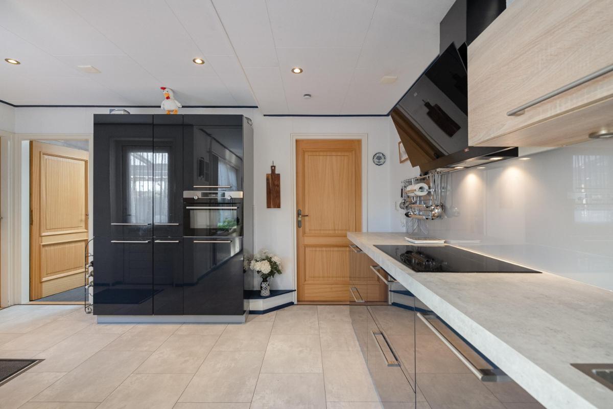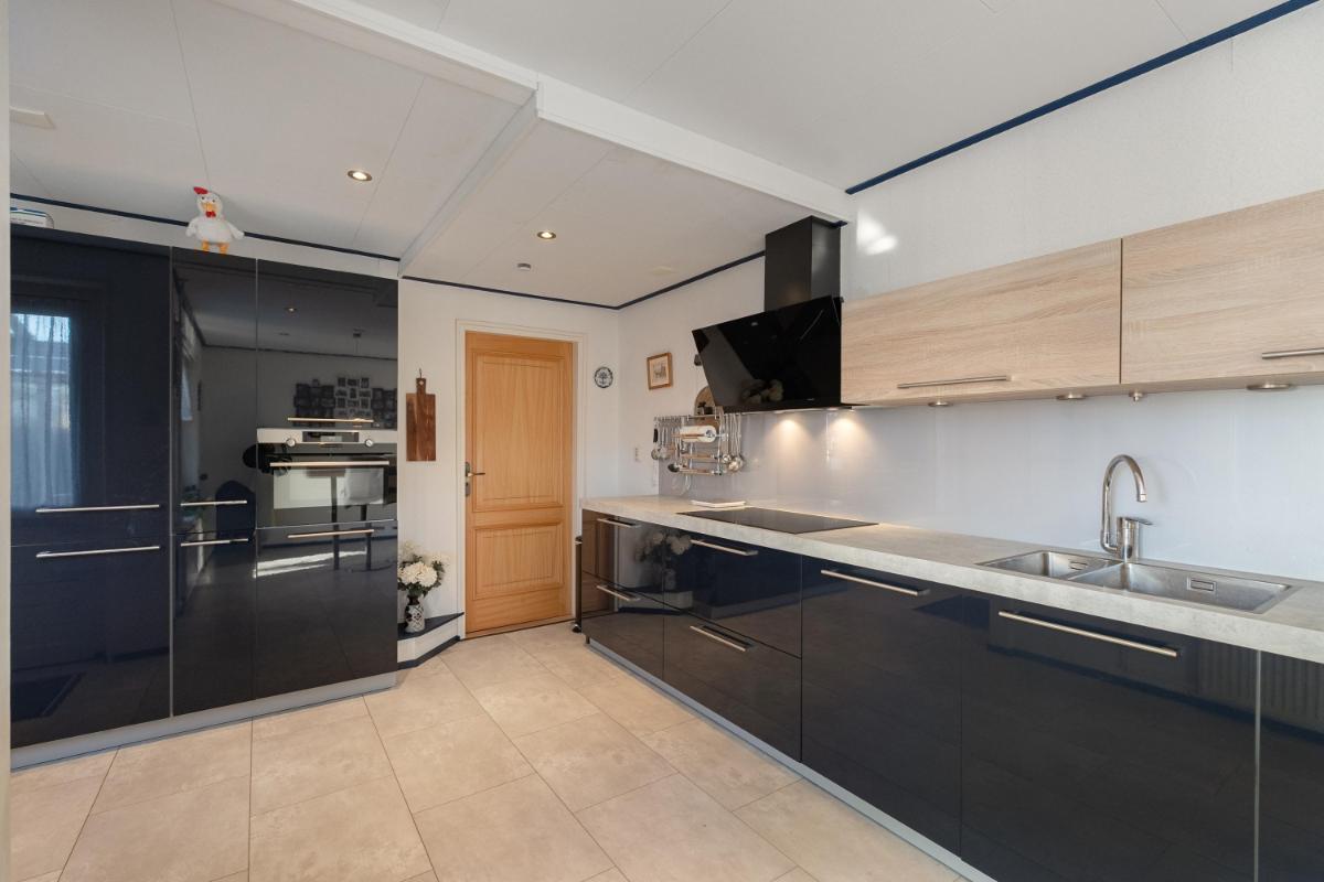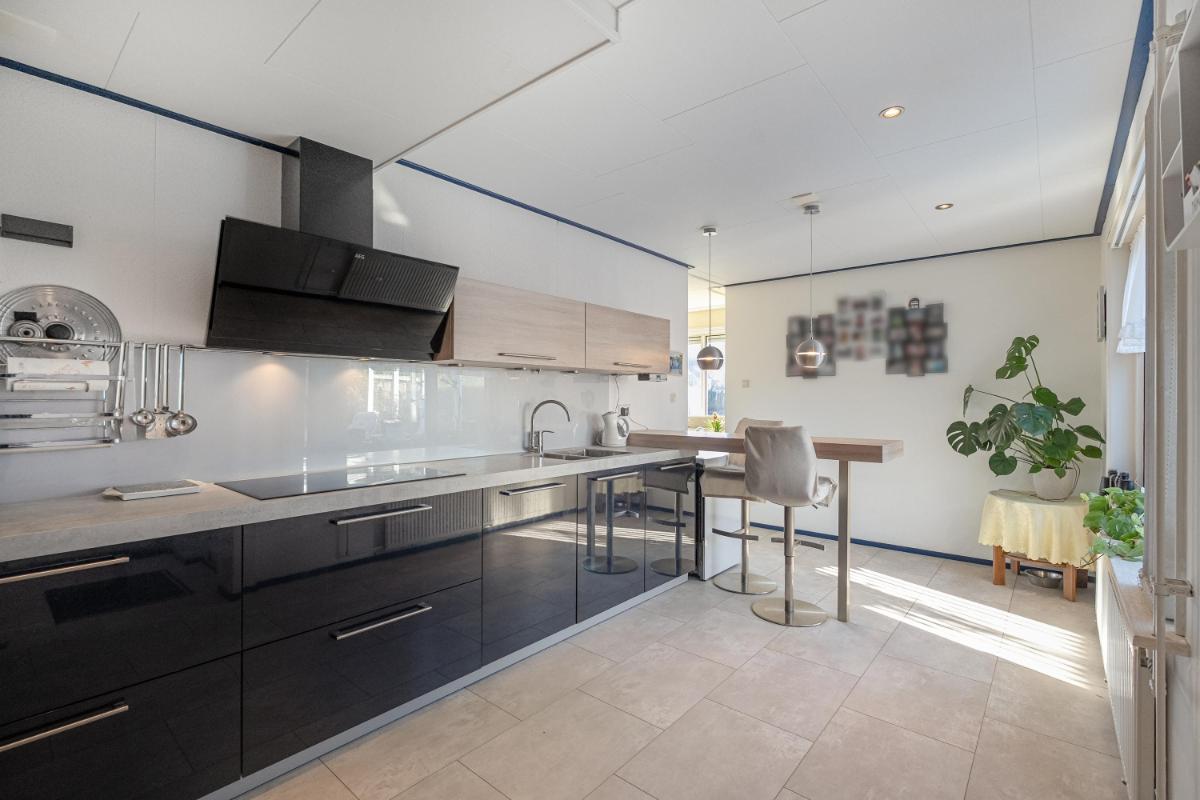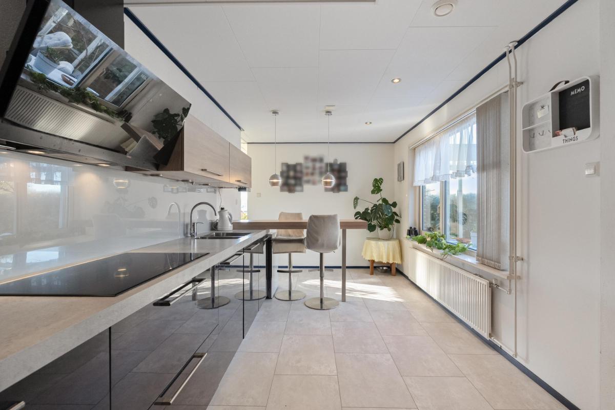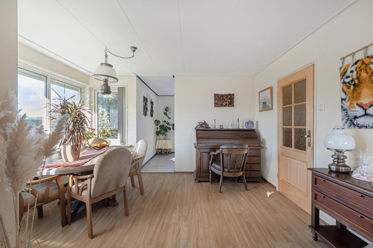 Via de hal met meterkast en toegang tot de badkamer op de begane grond komt u in de L-vormige woonkamer met zijerker. Vanuit de woonkamer kunt u naar de keuken met een blank eiken inbouwkeuken voorzien van diverse inbouwapparatuur. De bijkeuken vormt de tussenruimte tussen de slaap- of werkkamer op de begane grond en de badkamer met douche, wastafel en toilet. De garage is verkleind en wordt nu gebruikt als berging.