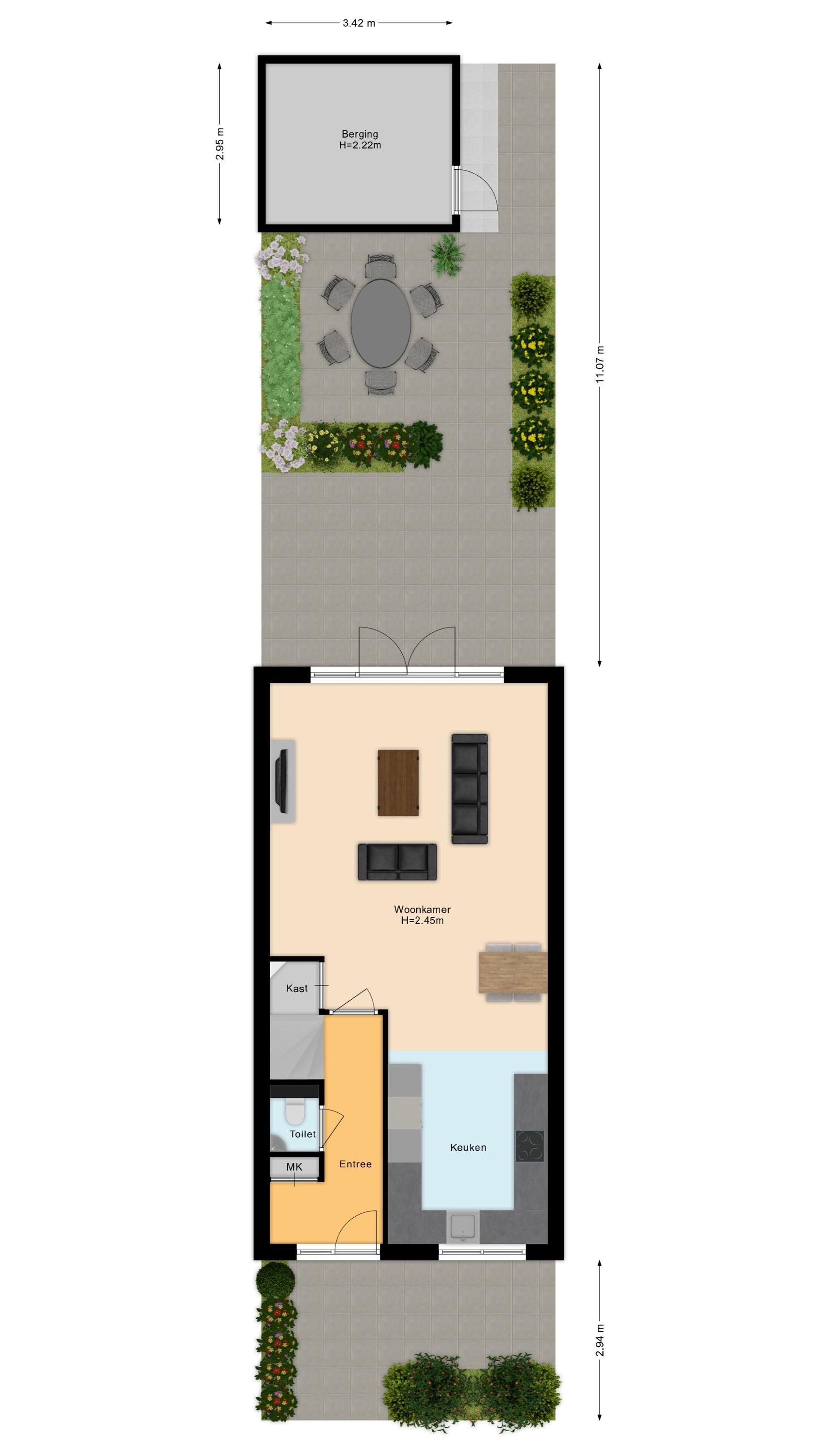 Begane grond betreed je het huis in een royale woonkamer met achter aanbouw (2019) en openslaande deuren, gekenmerkt door een overvloed aan natuurlijk licht en luxe comfort. De keuken is in 2023 compleet vernieuwd en biedt alle moderne gemakken die elke thuiskok droomt. Zo is hij voorzien van de 4-pits inductiekookplaat met Bora afzuiger, combi-oven, elektrische oven, koel/vries combinatie, vaatwasser, heet water kraan, 2x carrousel en veel praktische lades en werkruimte.