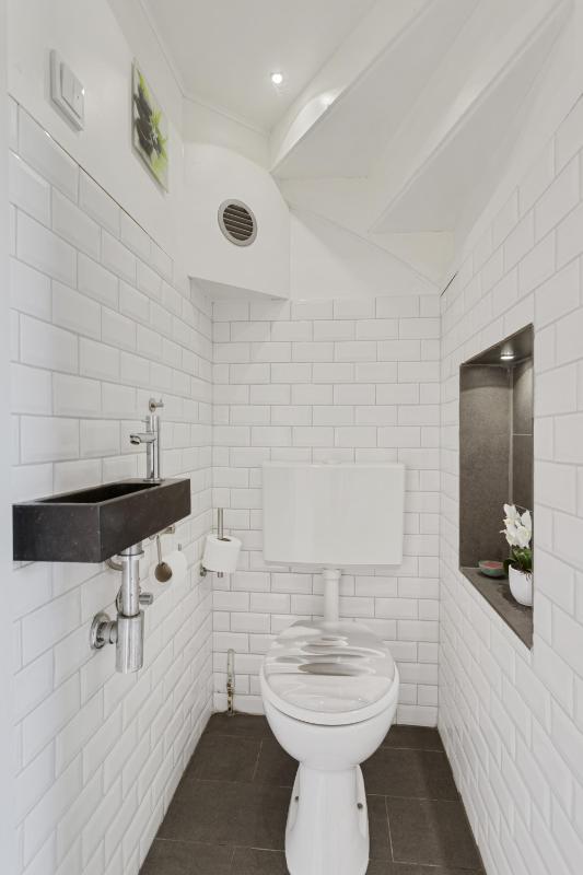 TOILETRUIMTE (Gedeeltelijk betegelde) toiletruimte met closet en fonteintje en inbouwspots.