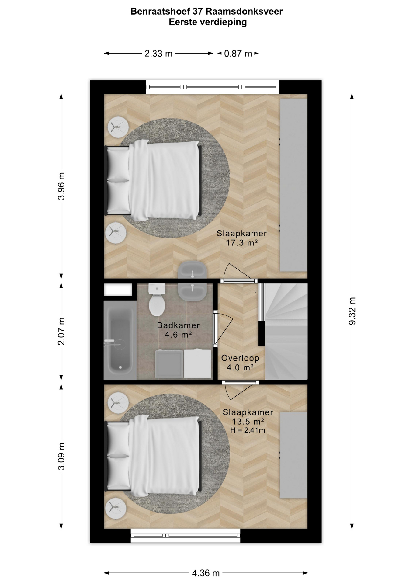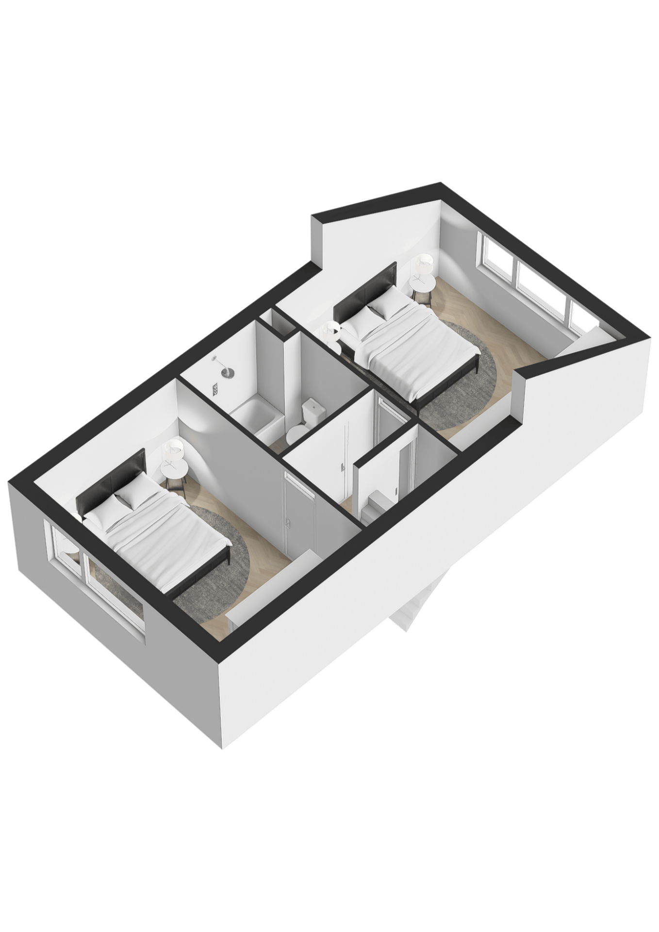 Eerste verdieping De overloop geeft toegang tot twee ruime slaapkamers en de badkamer. De grote slaapkamer aan de achterzijde valt op door de fraaie plafondhoogte, wat zorgt voor een extra ruimtelijk gevoel. Daarnaast beschikt deze kamer over een wastafel en rolluik.