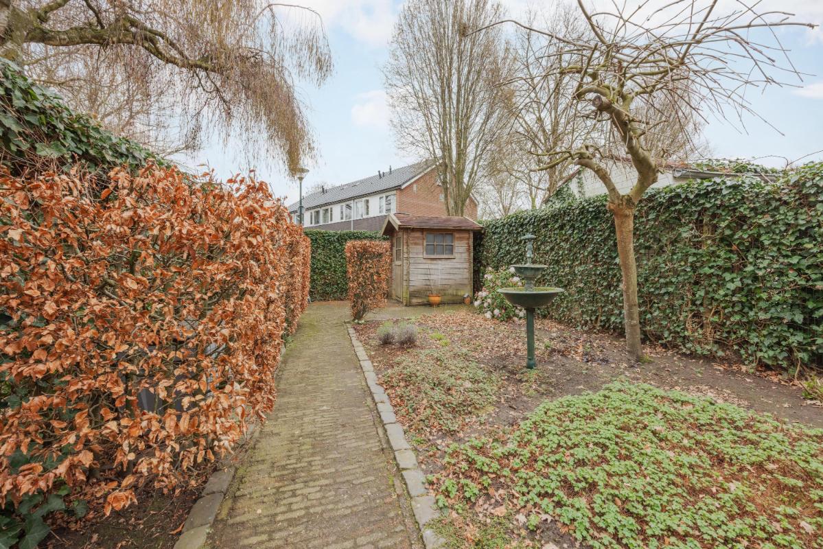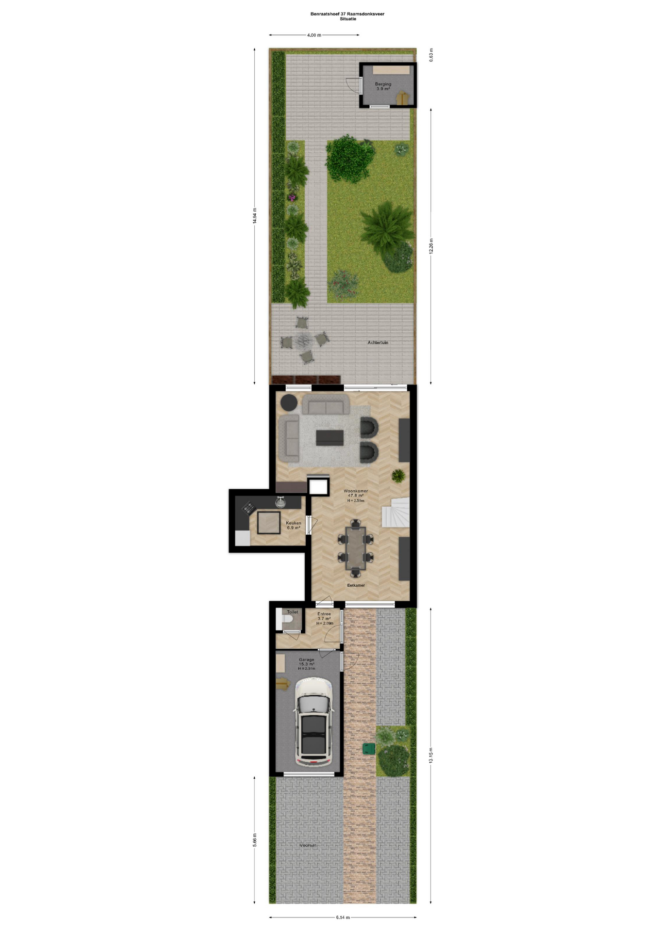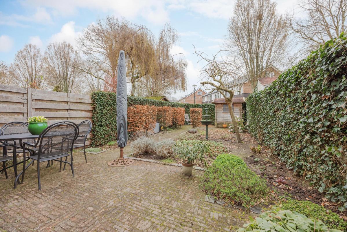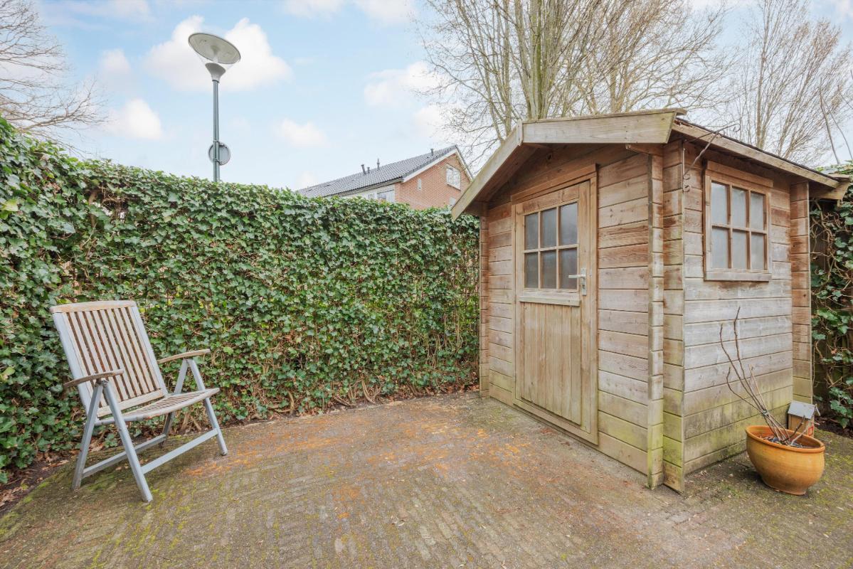 Tuin De zonnige achtertuin is verzorgd aangelegd met plantenborders en meerdere terrassen, waardoor u altijd een fijn plekje vindt om te zitten. De tuin biedt volop privacy en is voorzien van een zonnescherm. Achterin staat een ruime vrijstaande houten berging met elektra — ideaal voor hobby’s of extra opslag.