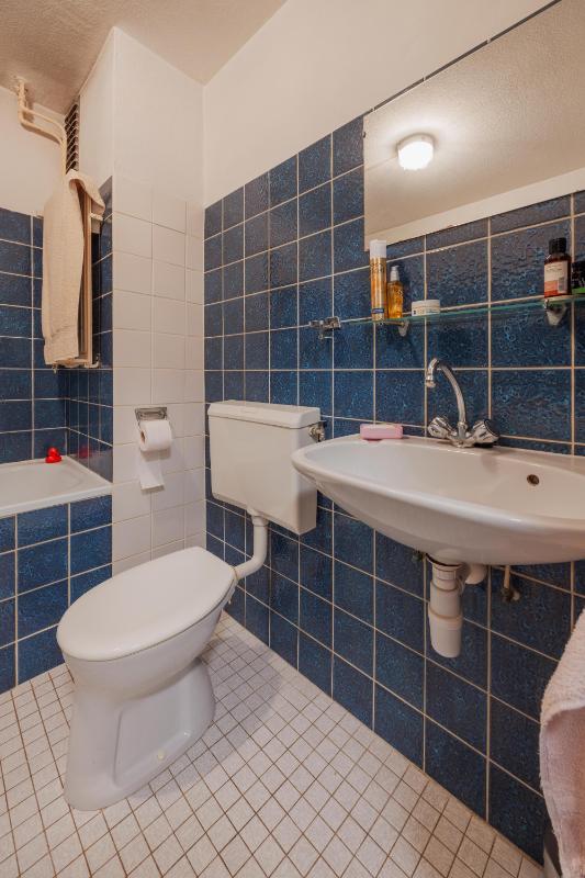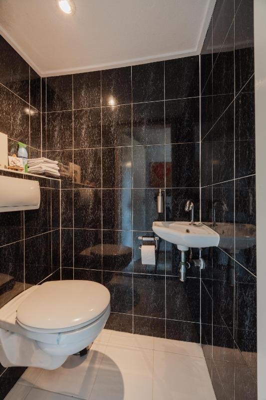 De badkamer is compleet ingericht met een ligbad/douchecombinatie, wastafel, tweede toilet en aansluitingen voor wasapparatuur. De ruimte is deels betegeld en voorzien van ventilatie.