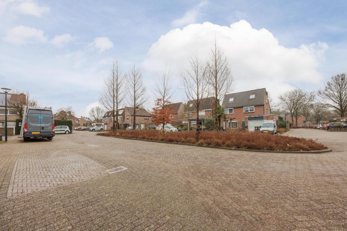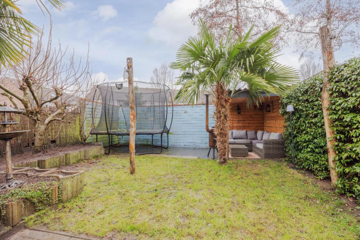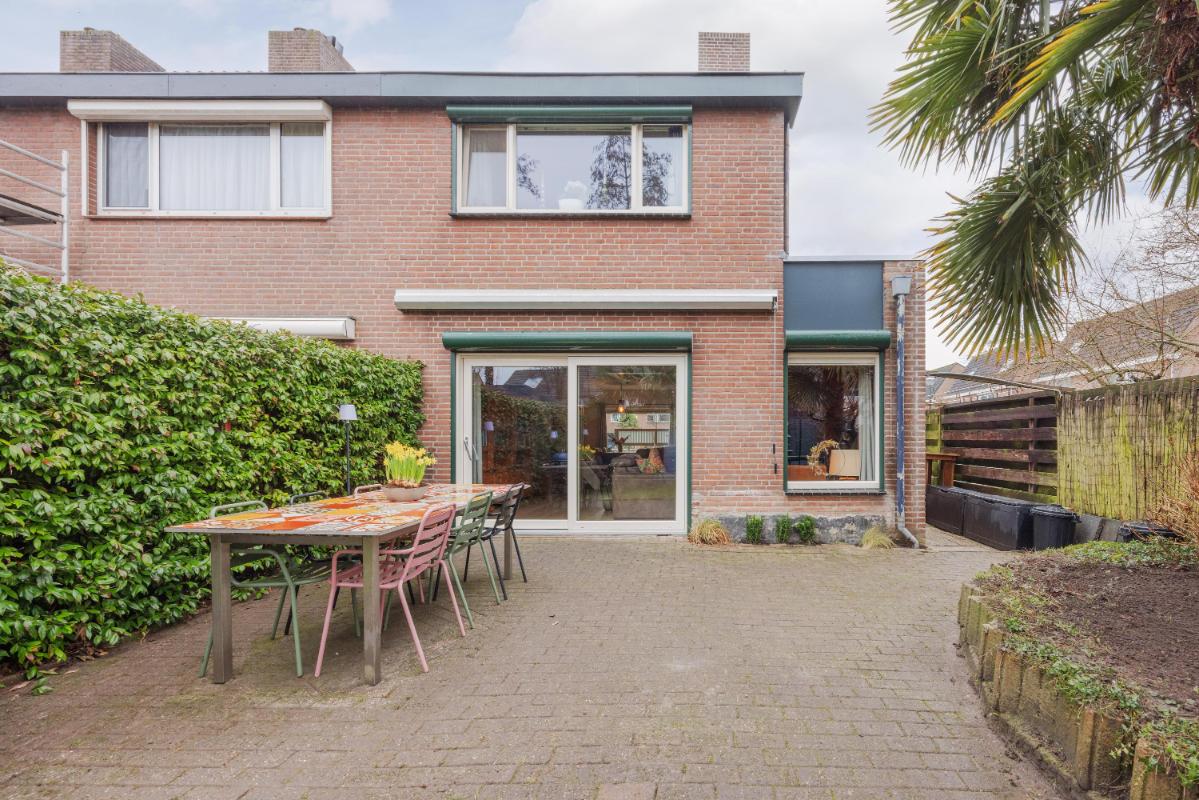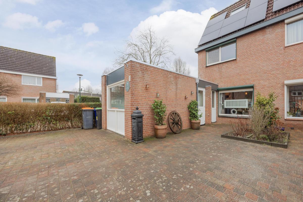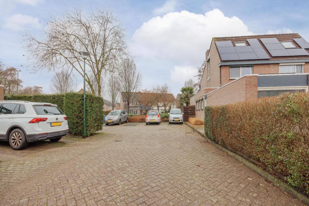 Tuin: De achtertuin is verzorgd aangelegd met een eigen achterom en een vrijstaande overkapping en ligt overwegend op het westen. De tuin biedt volop privacy en de tuin beschikt voorts nog over een buitenkraan en een zonnescherm. Aan de voorzijde tevens nog 2 parkeerplaatsen op eigen terrein.