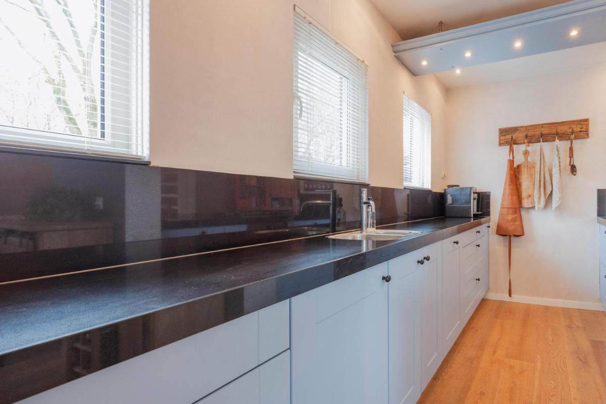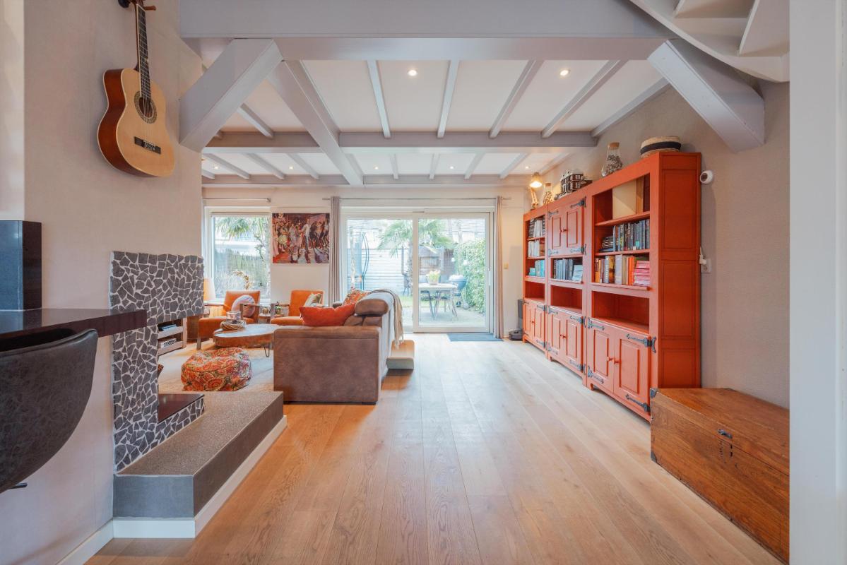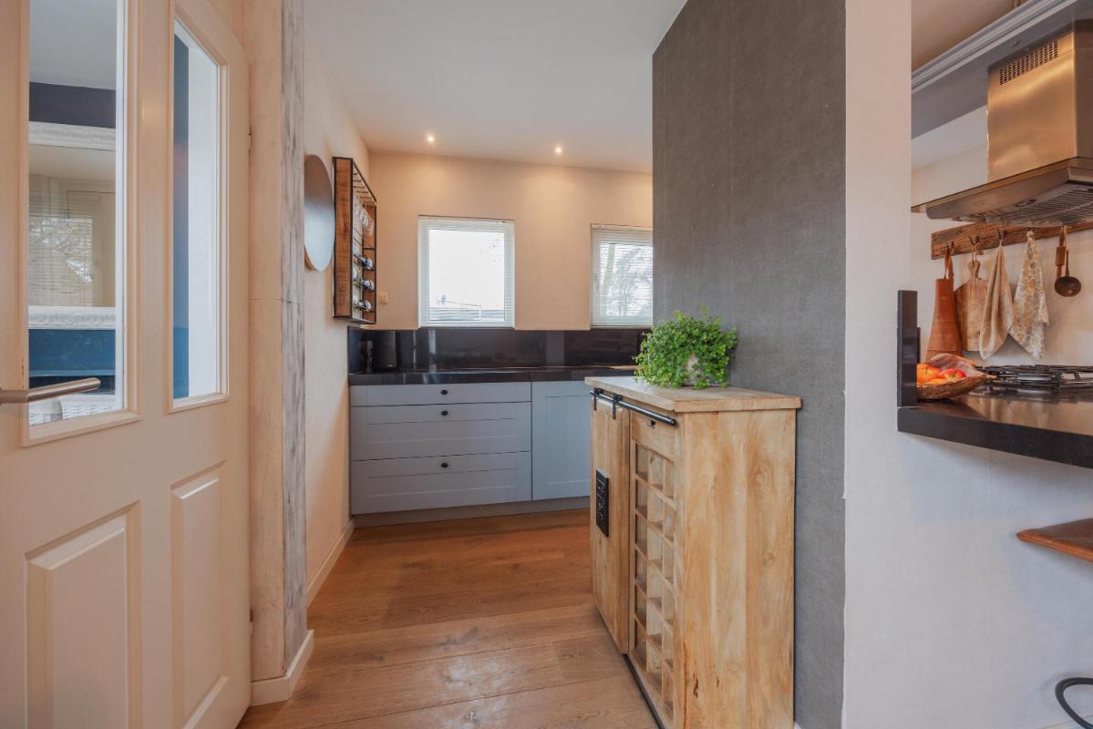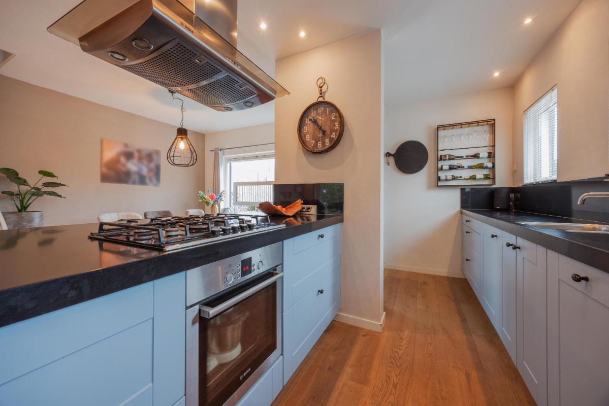 INDELING WONING: Begane grond: Zij-entree/hal met toegang tot de toiletruimte, (voormalige) garage/inpandige berging en toegang tot de woonkamer. De toiletruimte is vernieuwd en voorzien van een wandcloset met fonteintje. De inpandige garage/berging is voorzien van een kunststof pui met nog een separate loopdeur. In de garage/berging bevindt zich de meterkast (10 groepen en 3 aardlekschakelaars), omvormer zonnepanelen alsmede de aansluitingen ten behoeve van de wasapparatuur. De L-vormige woonkamer is voorzien van fraaie eiken houten vloer, een sfeervolle schouw en de trapopgang naar de 1e verdieping. Aan de achterzijde een grote schuifpui naar de verzorgd aangelegde achtertuin. Door de grote raampartijen is het een heerlijk lichte woonkamer met een oppervlakte van maar liefst ca. 44m2. De haf open keuken is eveneens een keer vernieuwd en voorzien rechte opstelling en een schiereiland met diverse inbouwapparatuur zoals o.a. een koelkast, combi-oven, afzuigkap, 5-pits gaskookplaat en een vaatwasser. Voorts is het keukenblok voorzien van een natuurstenen blad.