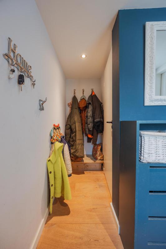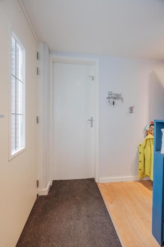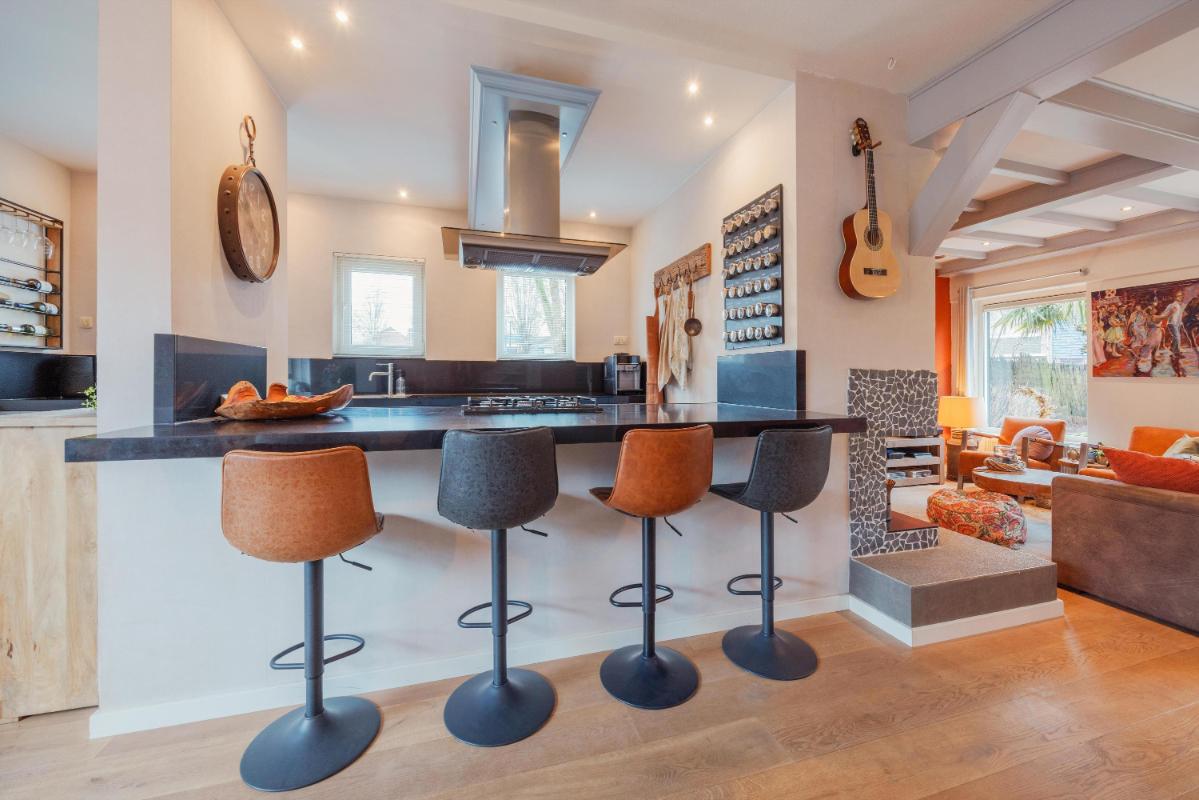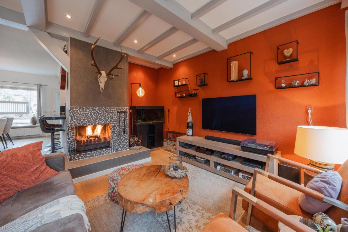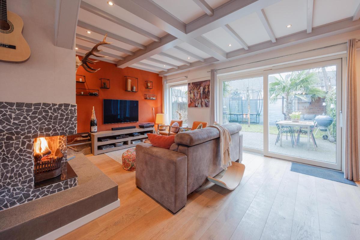 INDELING WONING: Begane grond: Zij-entree/hal met toegang tot de toiletruimte, (voormalige) garage/inpandige berging en toegang tot de woonkamer. De toiletruimte is vernieuwd en voorzien van een wandcloset met fonteintje. De inpandige garage/berging is voorzien van een kunststof pui met nog een separate loopdeur. In de garage/berging bevindt zich de meterkast (10 groepen en 3 aardlekschakelaars), omvormer zonnepanelen alsmede de aansluitingen ten behoeve van de wasapparatuur. De L-vormige woonkamer is voorzien van fraaie eiken houten vloer, een sfeervolle schouw en de trapopgang naar de 1e verdieping. Aan de achterzijde een grote schuifpui naar de verzorgd aangelegde achtertuin. Door de grote raampartijen is het een heerlijk lichte woonkamer met een oppervlakte van maar liefst ca. 44m2. De haf open keuken is eveneens een keer vernieuwd en voorzien rechte opstelling en een schiereiland met diverse inbouwapparatuur zoals o.a. een koelkast, combi-oven, afzuigkap, 5-pits gaskookplaat en een vaatwasser. Voorts is het keukenblok voorzien van een natuurstenen blad.