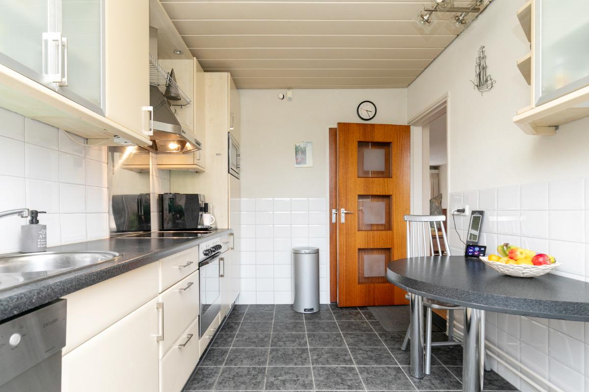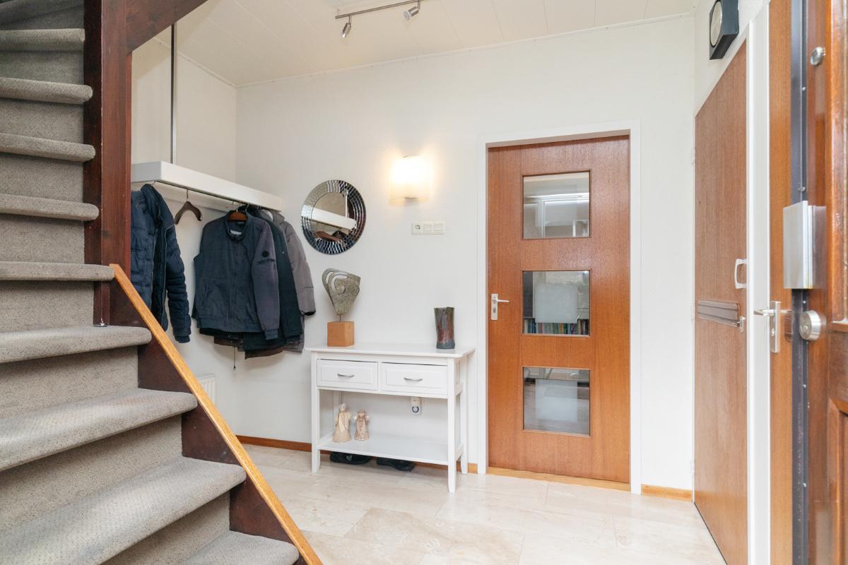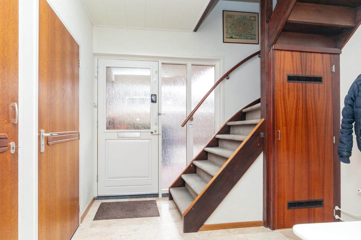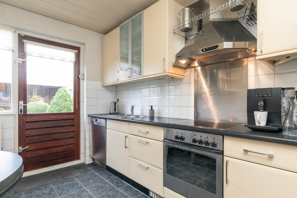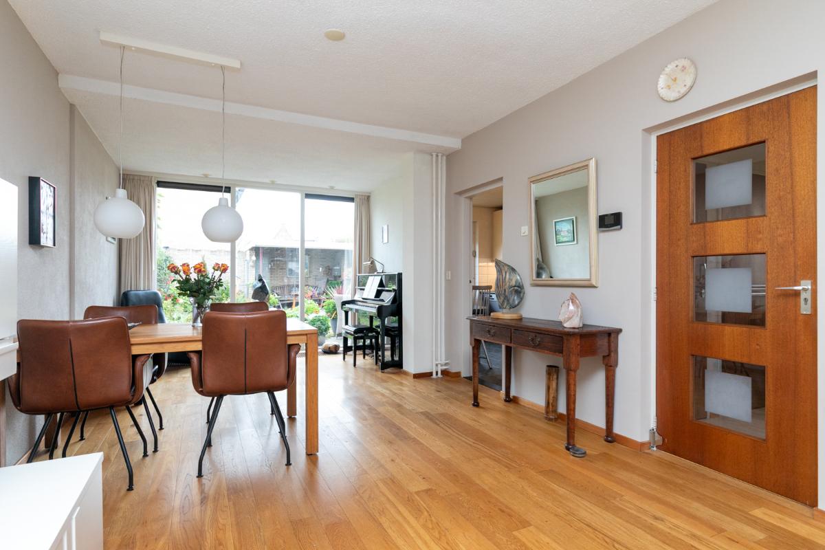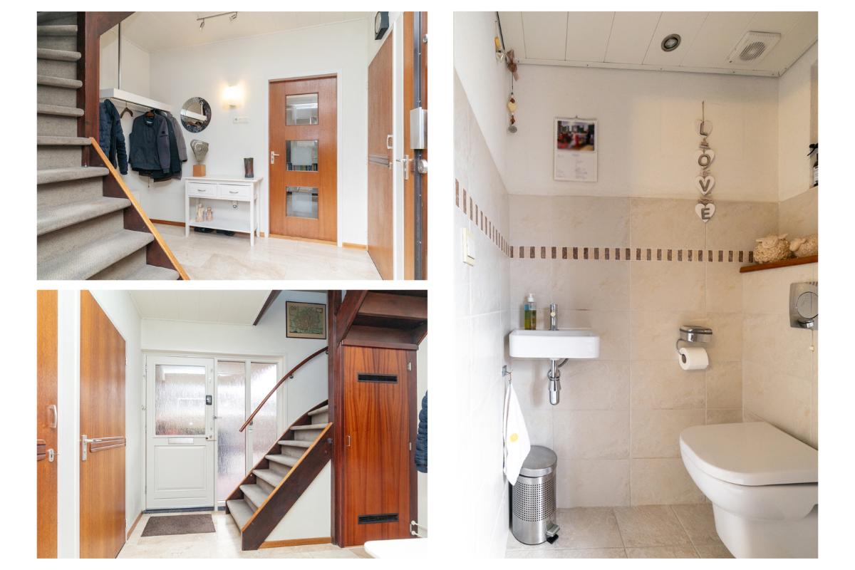 Globale Indeling: Begane grond : Overdekte entree/hal met trapopgang, meterkast (7 groepen, kookgroep en 3 aardlekschakelaars), en de gedeeltelijk betegelde toiletruimte met wandcloset en fonteintje. Vanuit de hal toegang tot de uitgebouwde woonkamer. De L-vormige woonkamer ca. 46 m2, is voorzien van een fraaie eikenhouten vloer en heeft door de grote raampartijen een heerlijke lichtinval. Ruime dichte woonkeuken met keukenblok in een rechte opstelling geplaatst met diverse inbouwapparatuur, namelijk: RVS afzuigkap, keramische kookplaat, combi-magnetron, vaatwasser en een koelkast met vriesvak. Daarnaast beschikt de keuken nog over een praktische provisiekast en vanuit de keuken toegang tot de fraai aangelegde achtertuin.