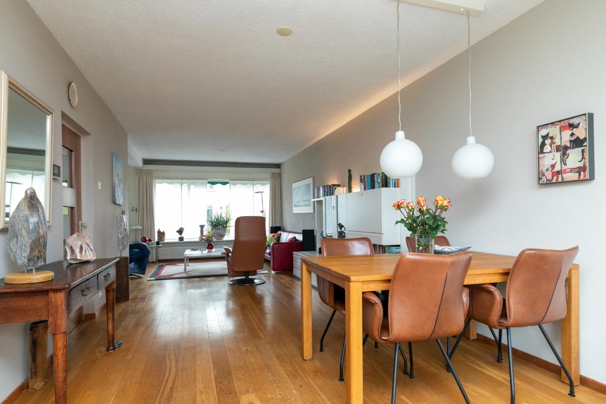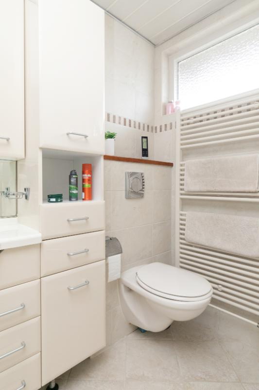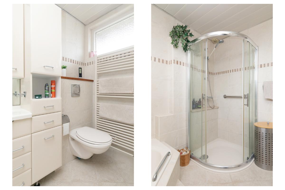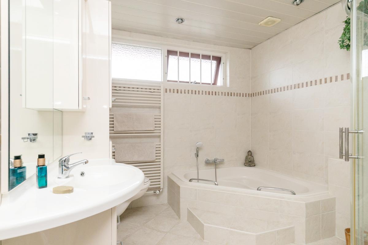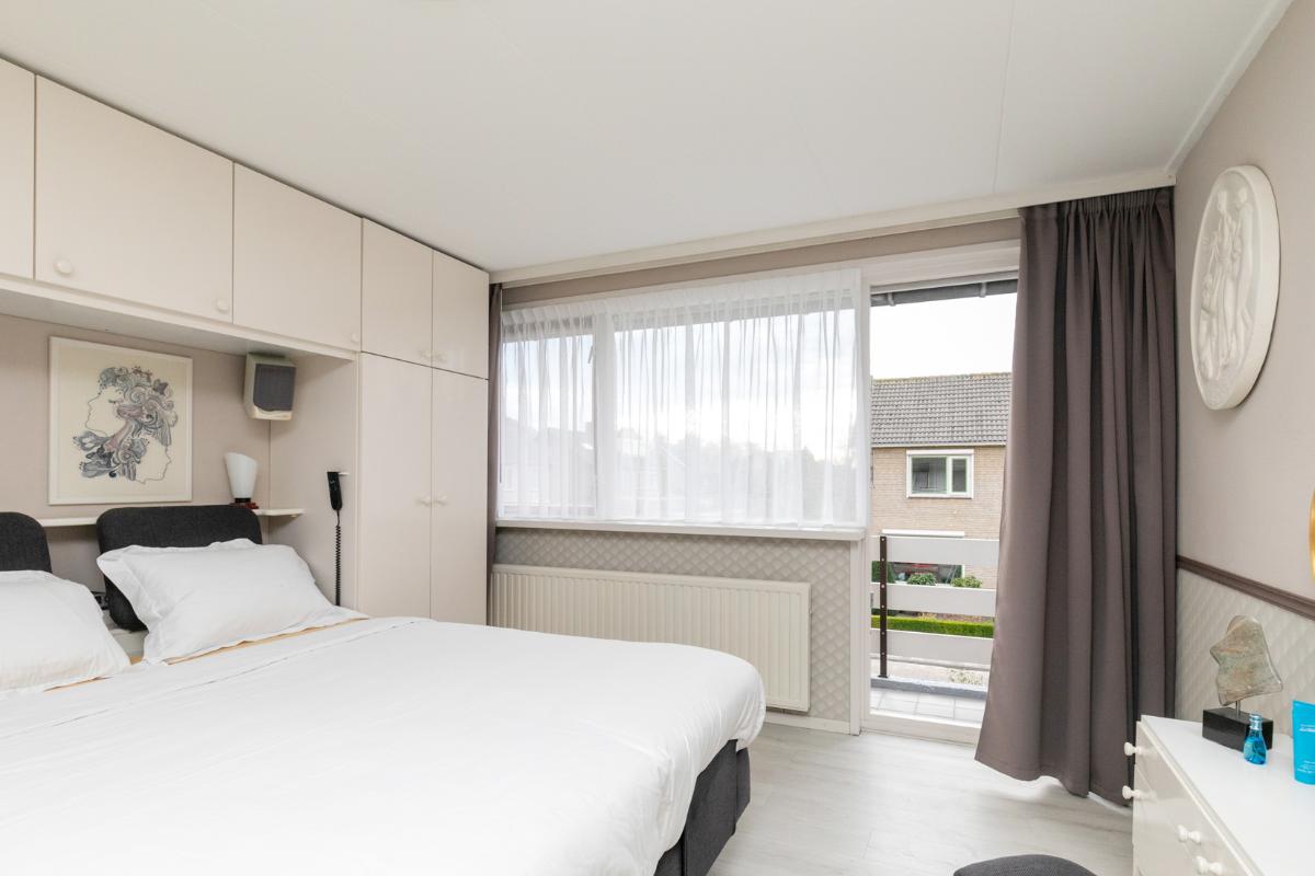 1e Verdieping: Overloop met toegang tot de 3 ruime slaapkamers en de badkamer. Ruime slaapkamer gelegen aan de voorzijde. Hoofdslaapkamer gelegen aan de voorzijde vaste kastenwand en toegang tot het balkon. De 3e slaapkamer is aan de achterzijde gelegen en beschikt over een vaste wastafel. Kenmerkend voor deze woningen zijn eveneens op deze verdieping de grote raampartijen. De badkamer is eveneens ruim van opzet en volledig betegeld en voorzien van een inloopdouche, wandcloset, wastafelmeubel, een verdiept hoekbad en een handdoekradiator.