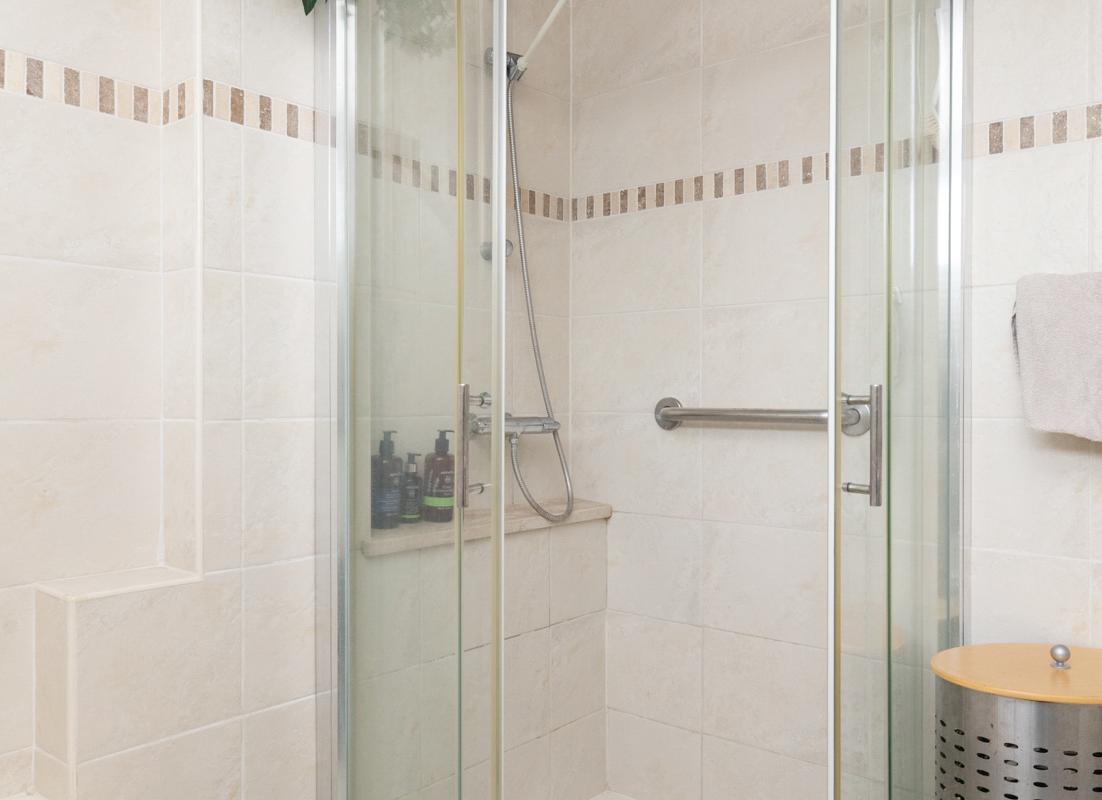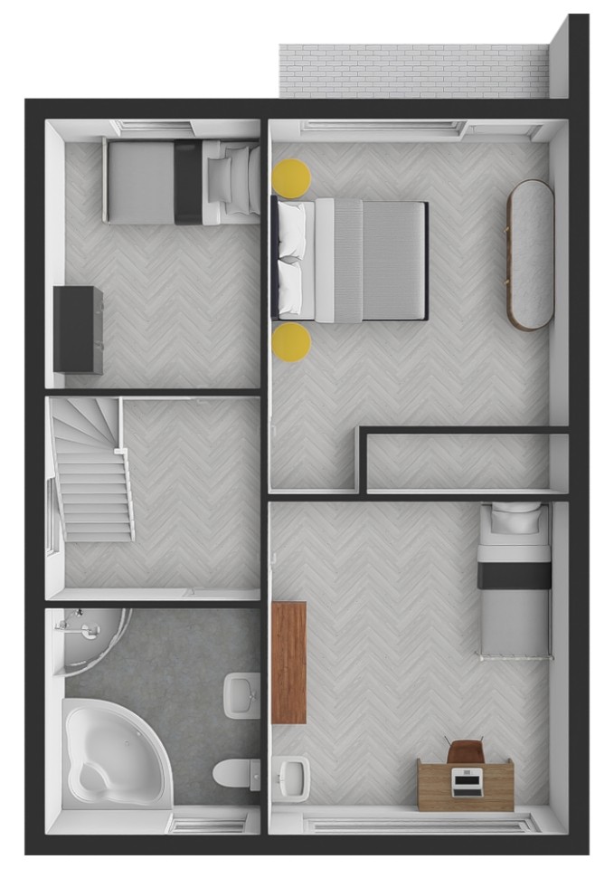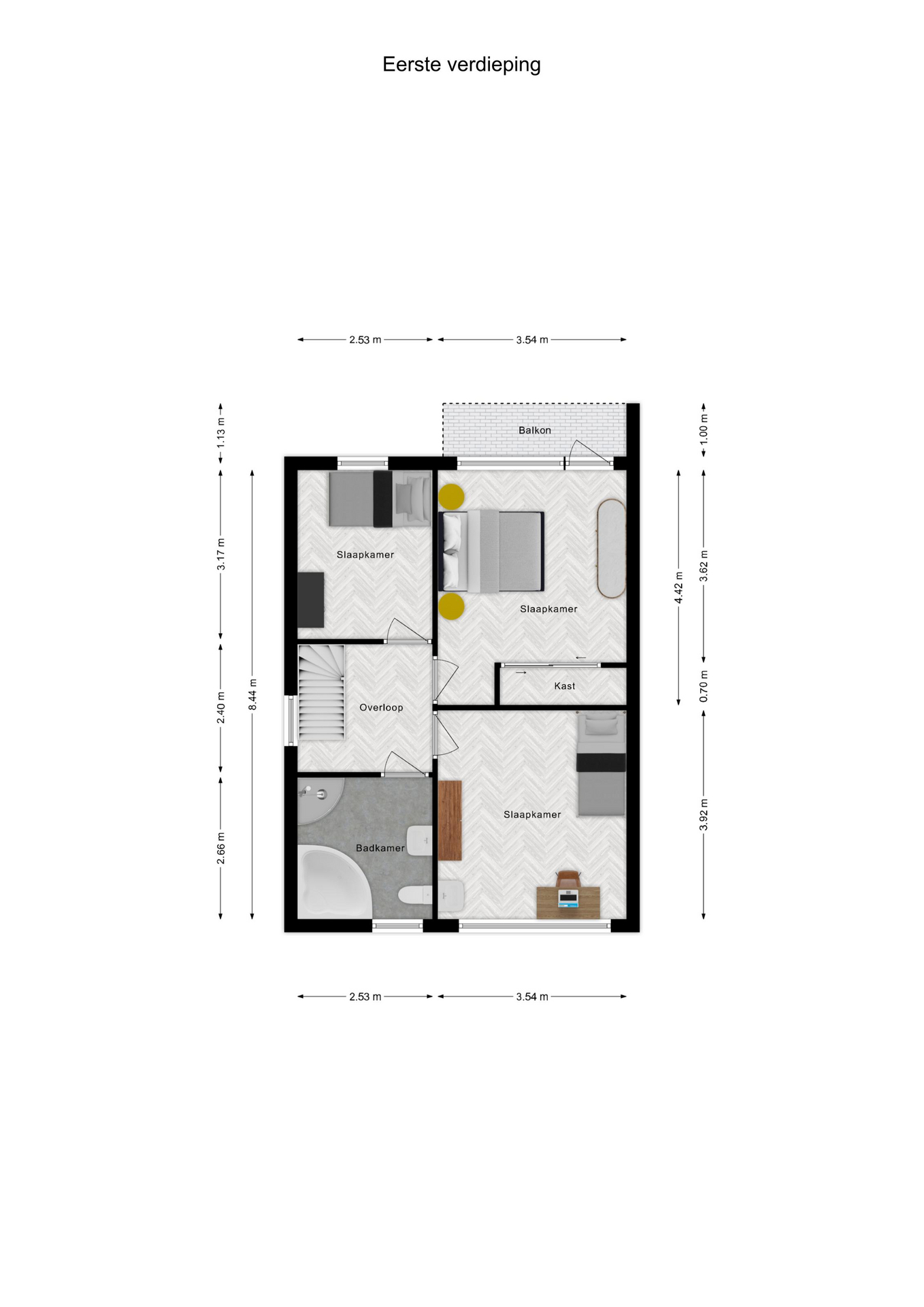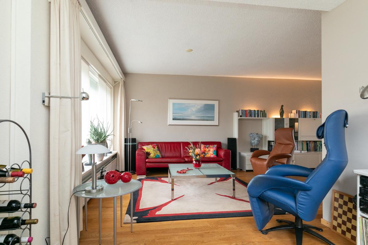 1e Verdieping: Overloop met toegang tot de 3 ruime slaapkamers en de badkamer. Ruime slaapkamer gelegen aan de voorzijde. Hoofdslaapkamer gelegen aan de voorzijde vaste kastenwand en toegang tot het balkon. De 3e slaapkamer is aan de achterzijde gelegen en beschikt over een vaste wastafel. Kenmerkend voor deze woningen zijn eveneens op deze verdieping de grote raampartijen. De badkamer is eveneens ruim van opzet en volledig betegeld en voorzien van een inloopdouche, wandcloset, wastafelmeubel, een verdiept hoekbad en een handdoekradiator.