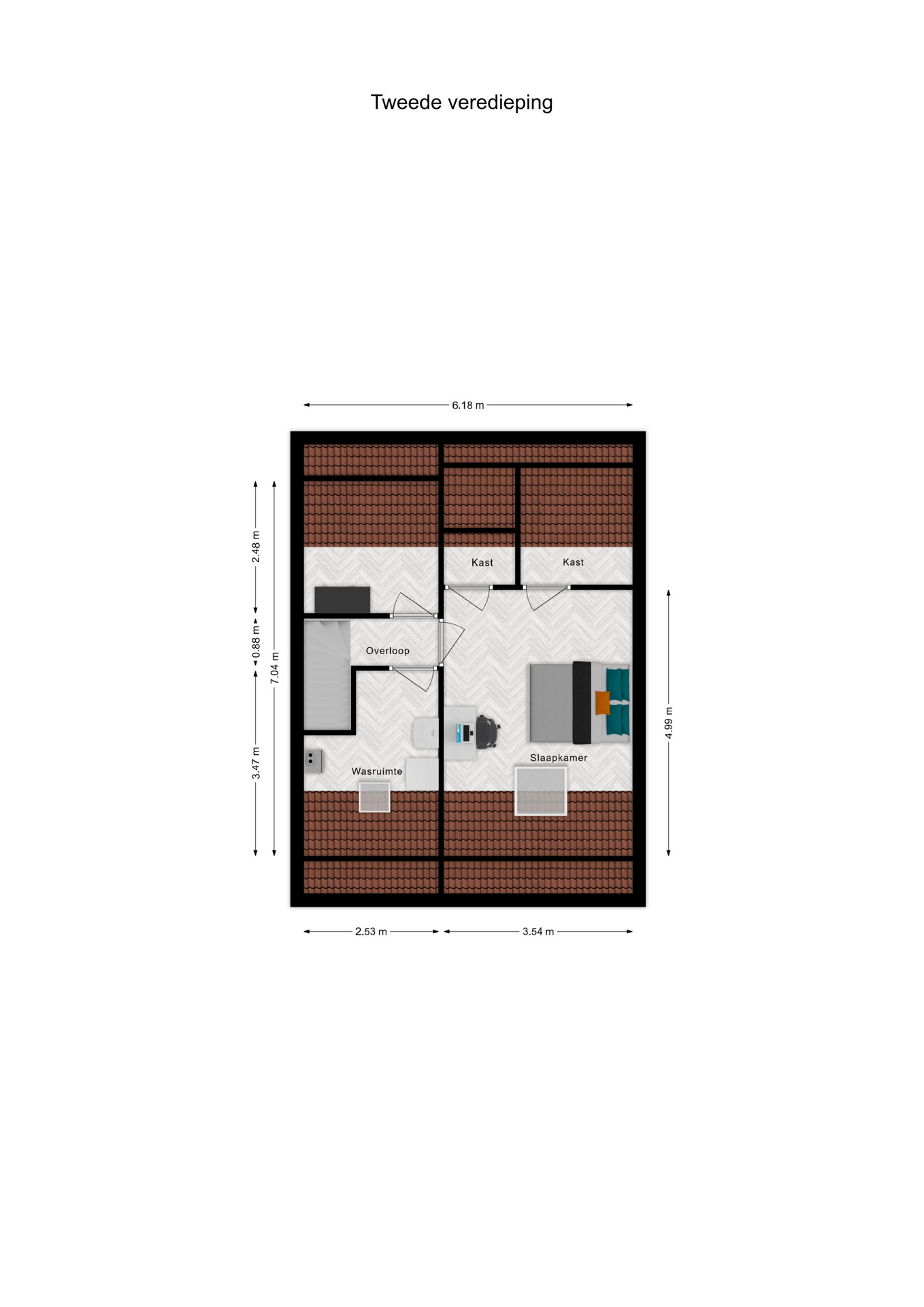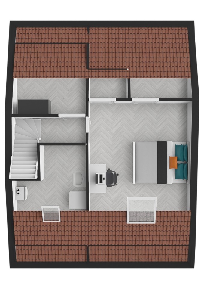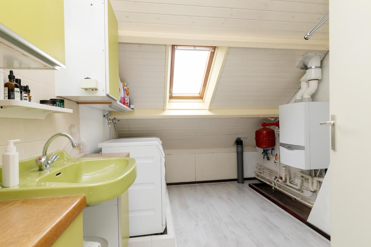 Zolderverdieping: Middels vaste trap te bereiken overloop met toegang een kamer gelegen aan de voorzijde (hier is eenvoudig door plaatsing van een dakvenster nog een extra slaapkamer te realiseren), de technische ruimte aan de achterzijde met opstelling van de Vaillant combiketel (bouwjaar ca. 2021), vaste wastafel en in een betonbak de aansluiting voor de wasapparatuur. Verder nog de ruime 4e zolder-/slaapkamer met 2 grote bergruimtes en een groot dakvenster.