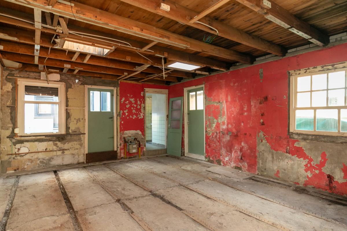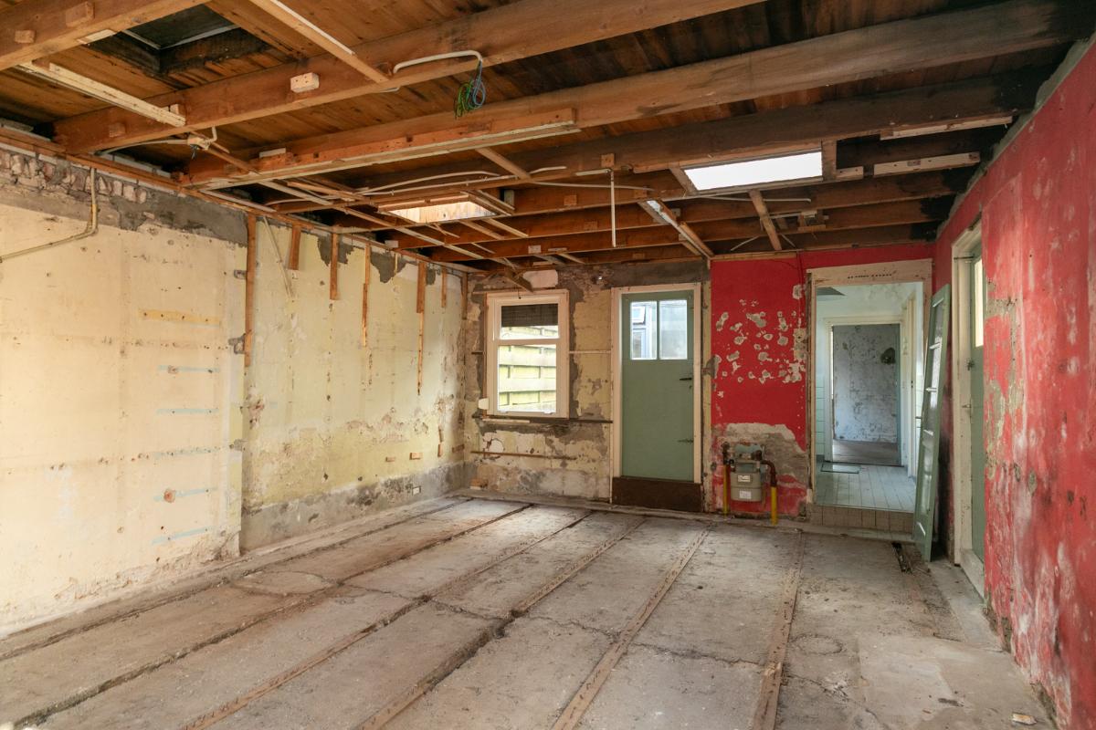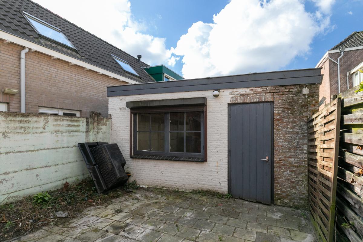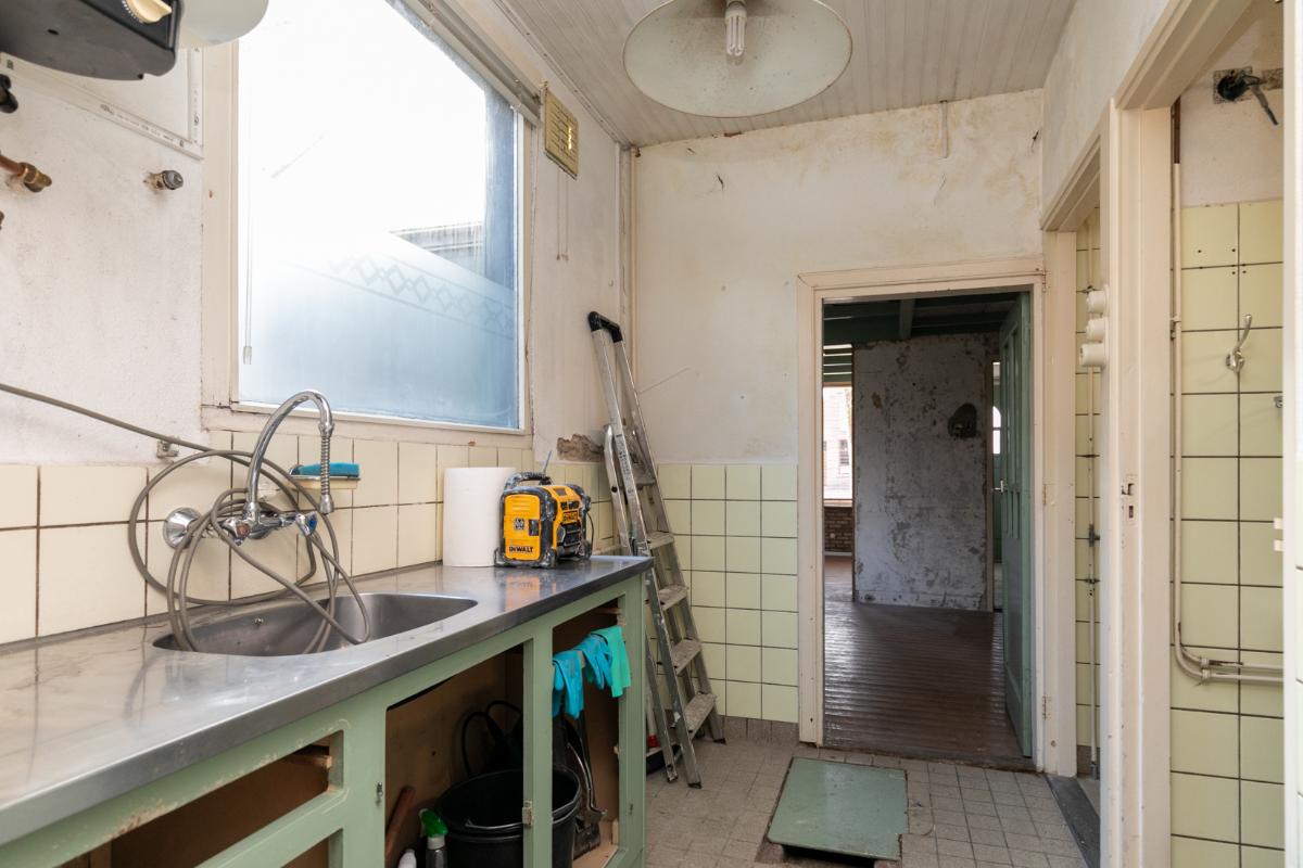 Via de eenvoudige keuken heeft men toegang tot een doucheruimte en toiletruimte (alles te renoveren). Vanuit de keuken bereikt men een achterruimte. Deze achterruimte is volledige opnieuw te renoveren en bied de mogelijkheid om bijvoorbeeld in te delen als slaapkamer met badkamer of als tweede woonkamer. Deze ruimte geeft toegang tot de de achtertuin waar ook een leuke indeling en privacyvolle plek van te maken is. De achtertuin is te bereiken via een achterom.