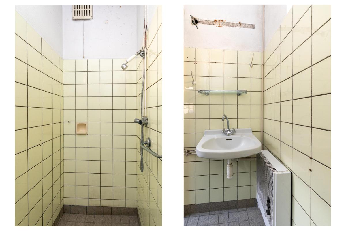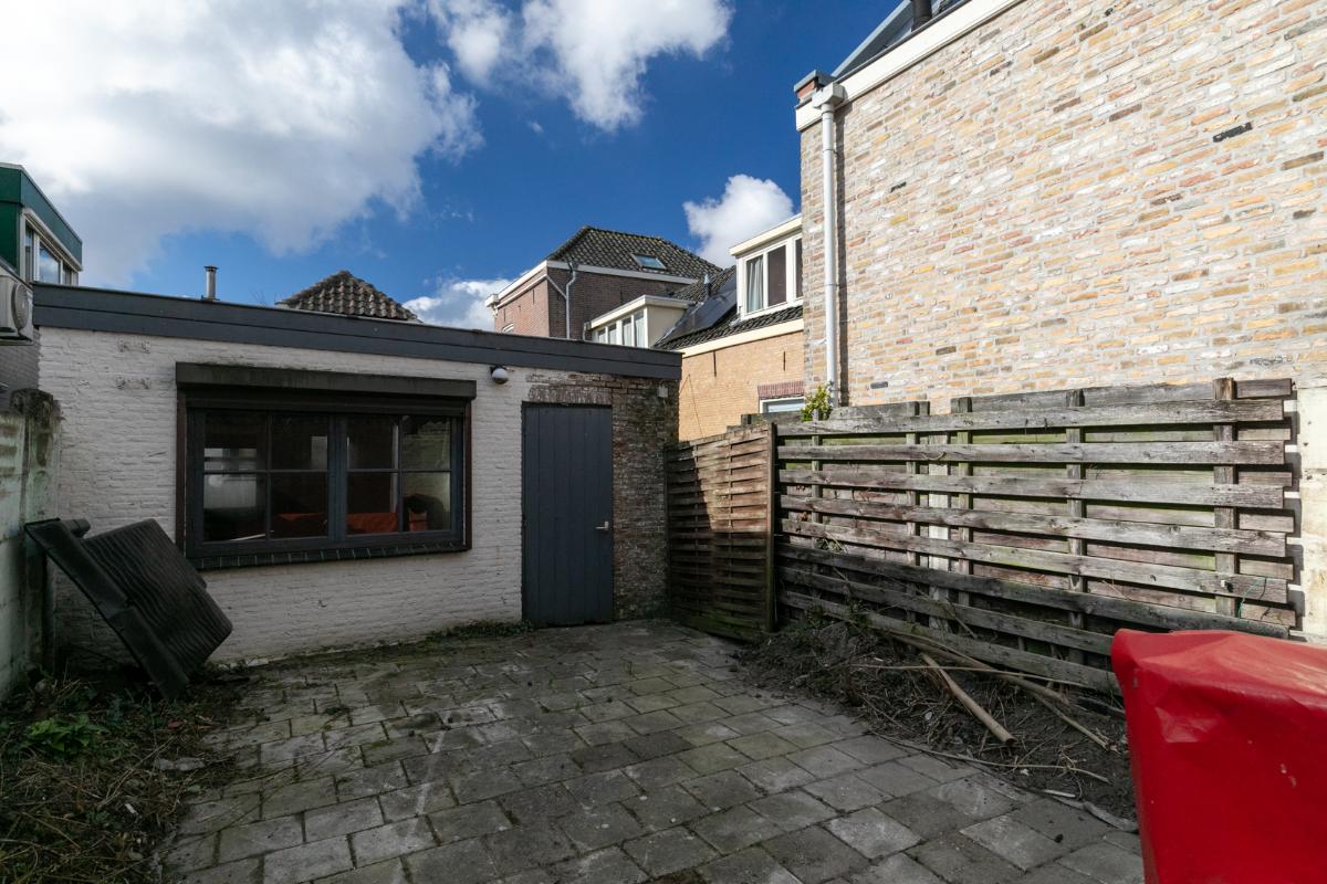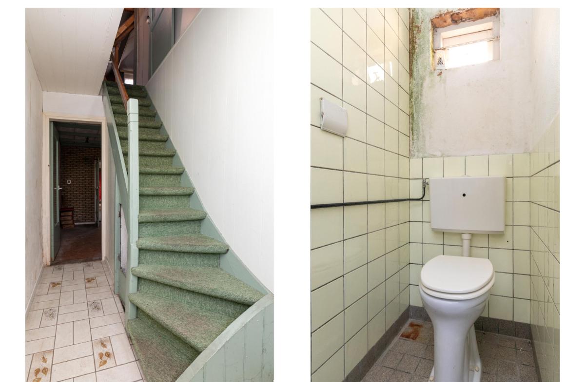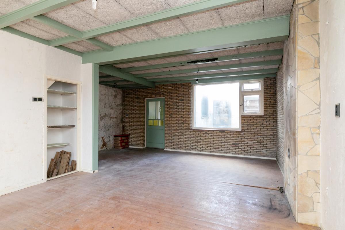 Via de eenvoudige keuken heeft men toegang tot een doucheruimte en toiletruimte (alles te renoveren). Vanuit de keuken bereikt men een achterruimte. Deze achterruimte is volledige opnieuw te renoveren en bied de mogelijkheid om bijvoorbeeld in te delen als slaapkamer met badkamer of als tweede woonkamer. Deze ruimte geeft toegang tot de de achtertuin waar ook een leuke indeling en privacyvolle plek van te maken is. De achtertuin is te bereiken via een achterom.