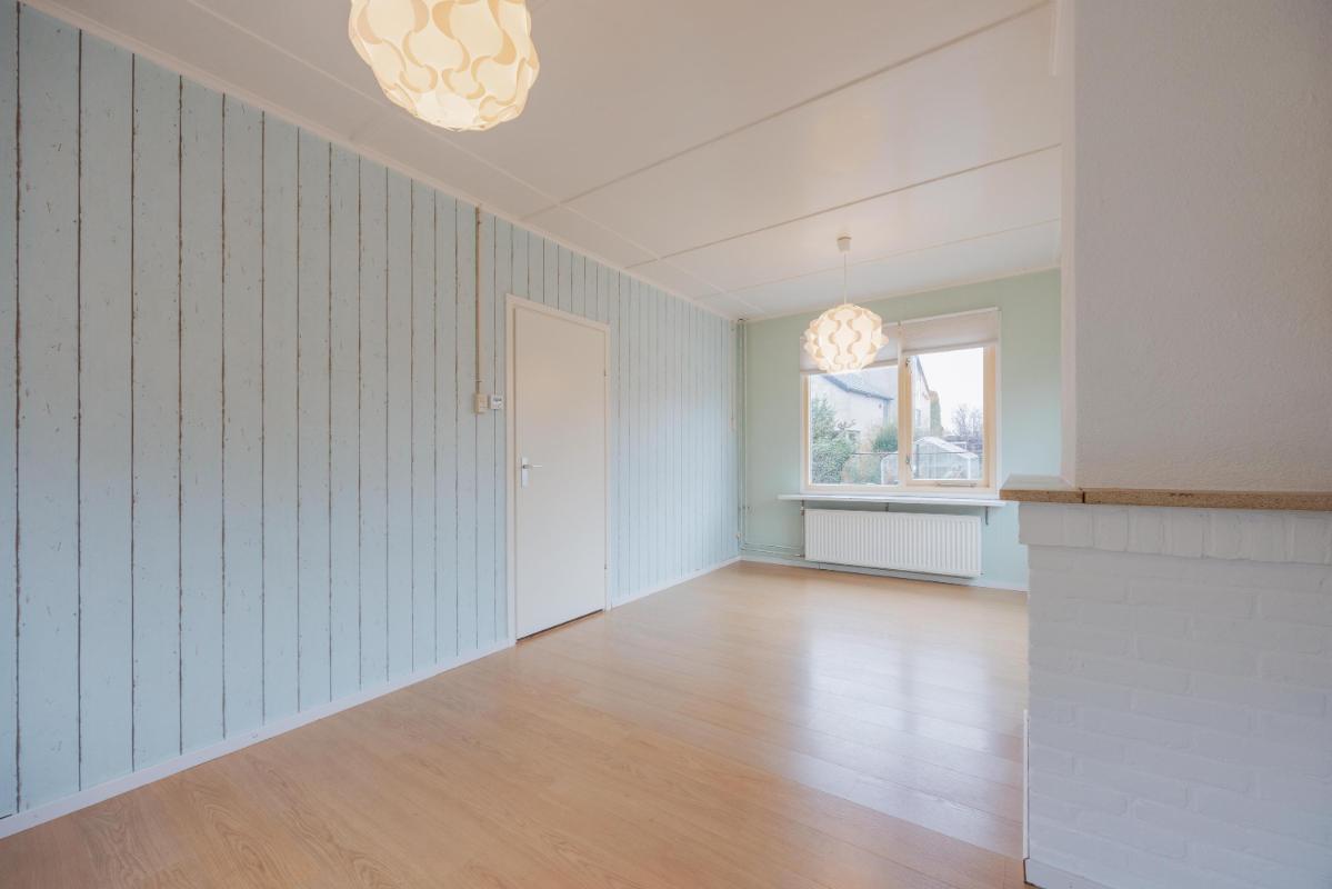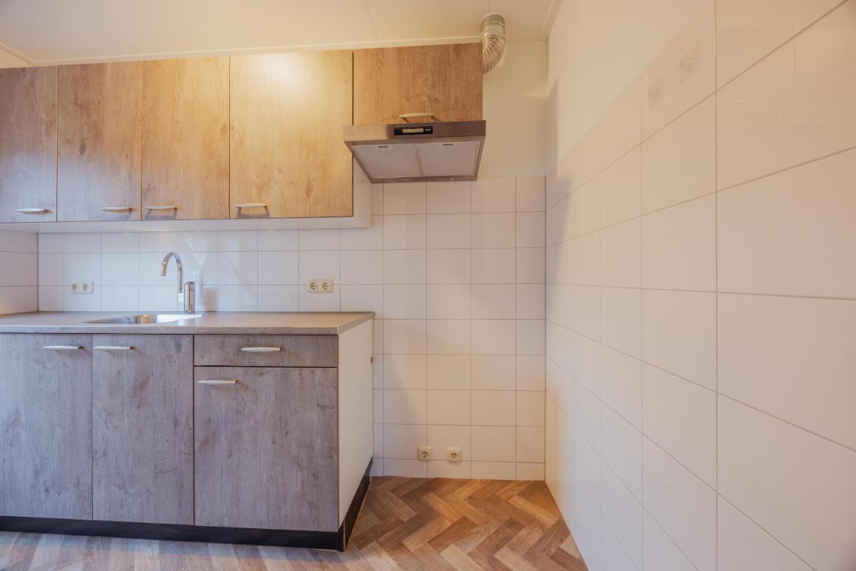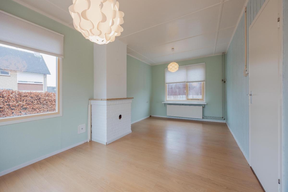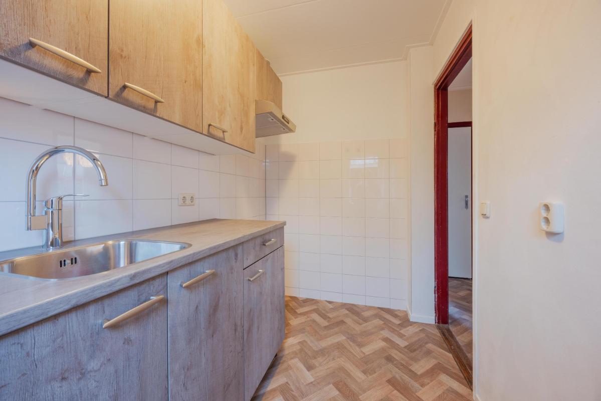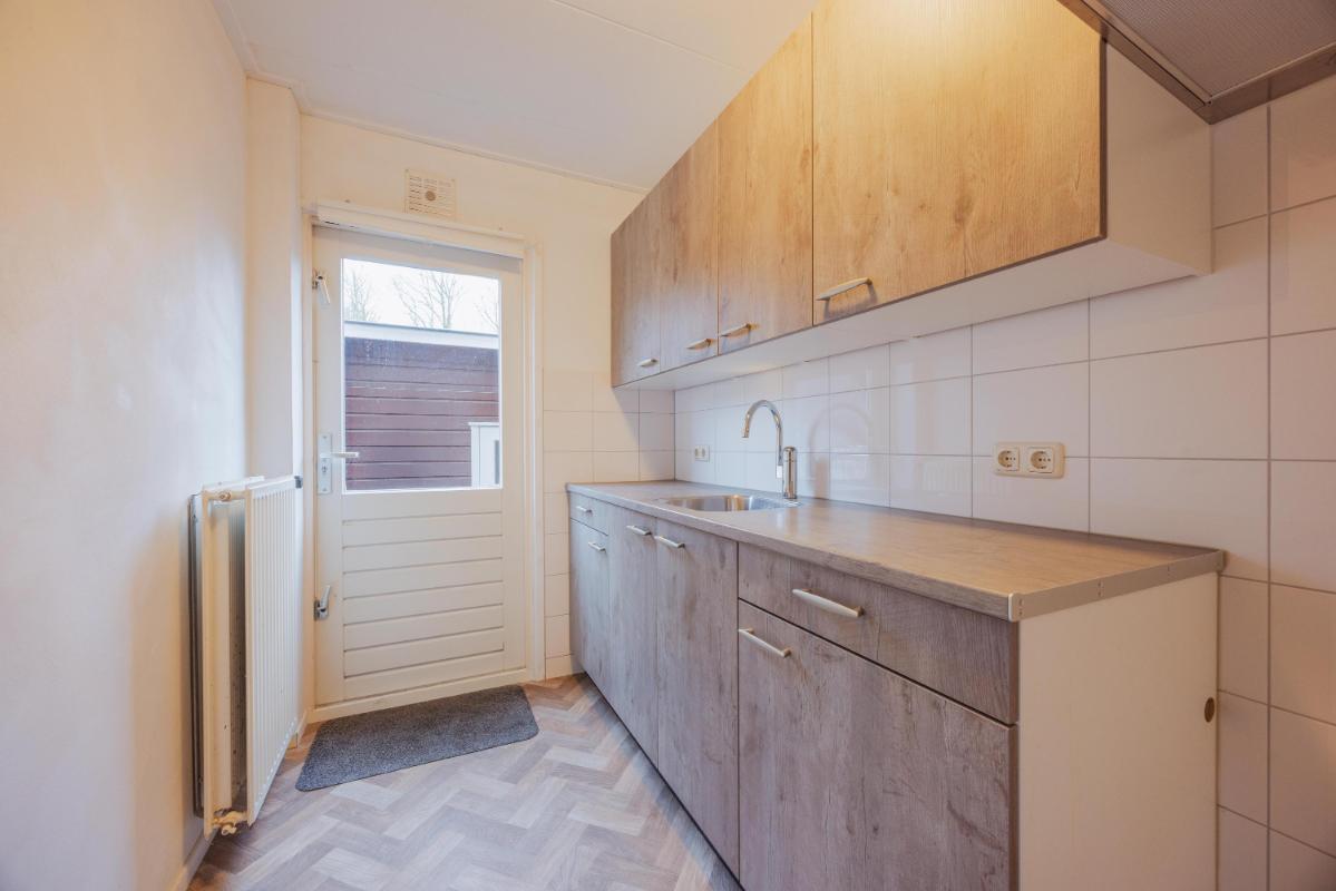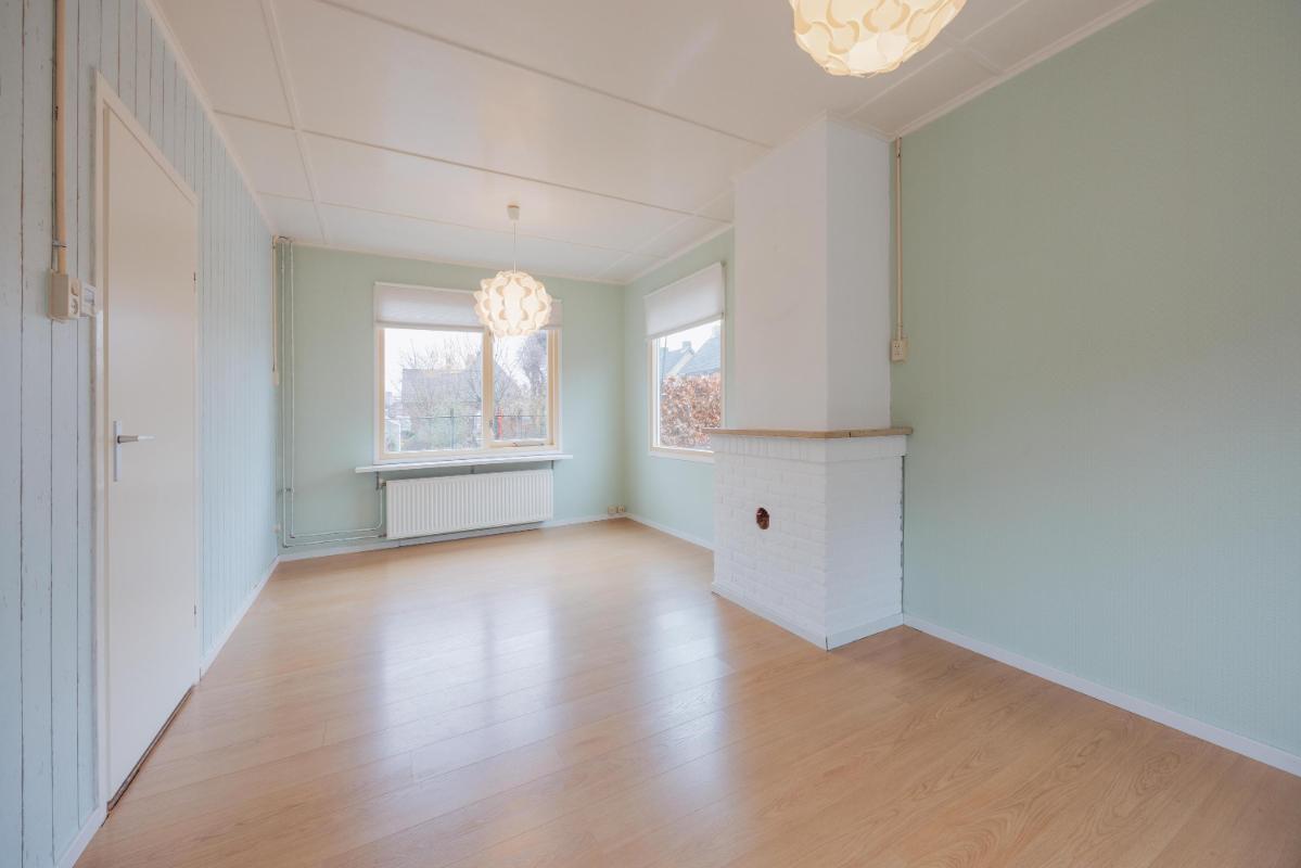 De doorzonwoonkamer heeft een oppervlakte van circa 21 m², geniet van veel natuurlijke lichtinval en is voorzien van een rookkanaal en een nette laminaatvloer. Aan de achterzijde van de woning bevindt zich de gesloten keuken, uitgerust met een recht keukenblok en een schouw met afzuigkap. Vanuit de keuken is er directe toegang tot de tuin.