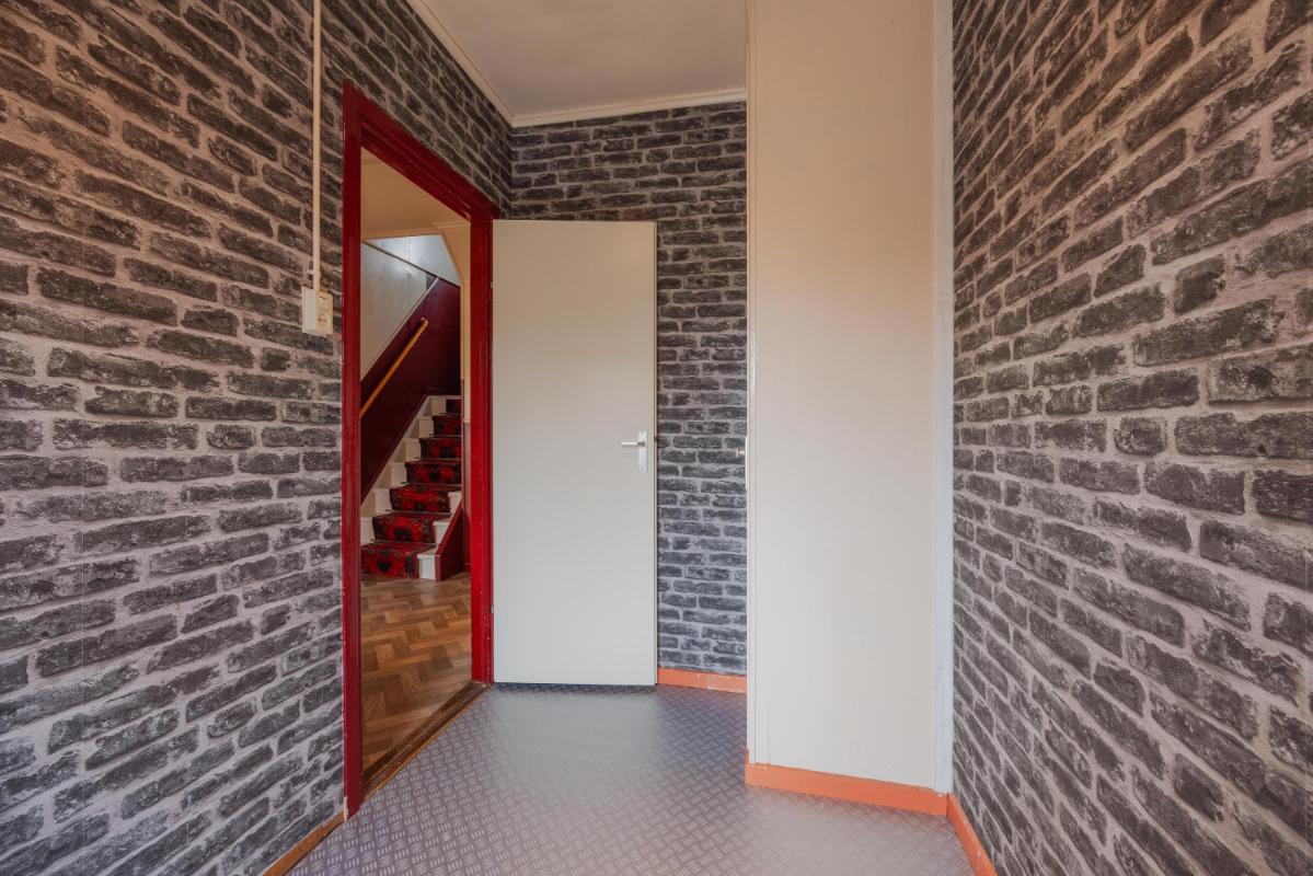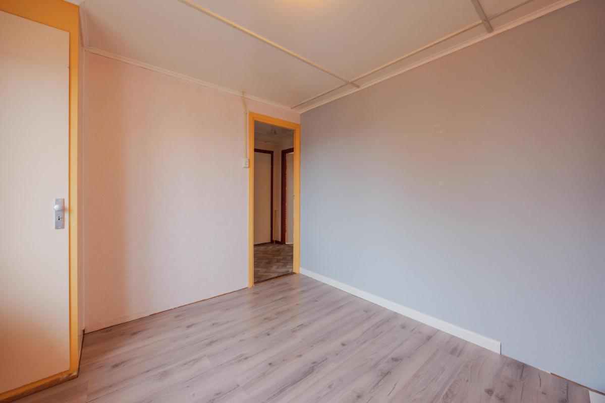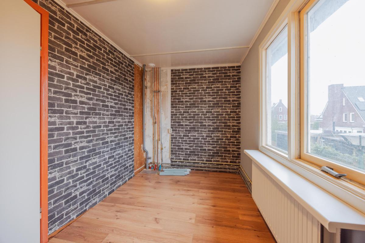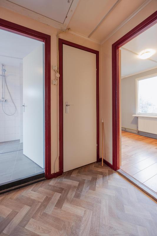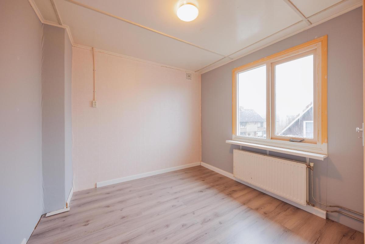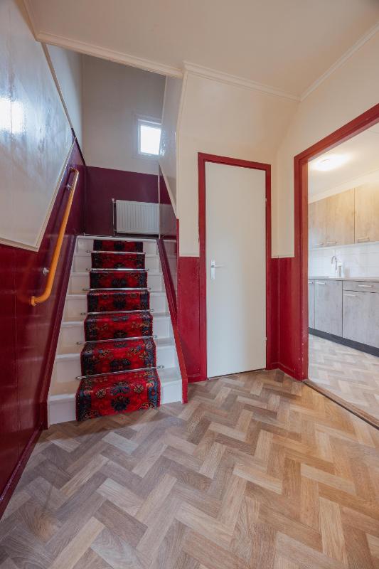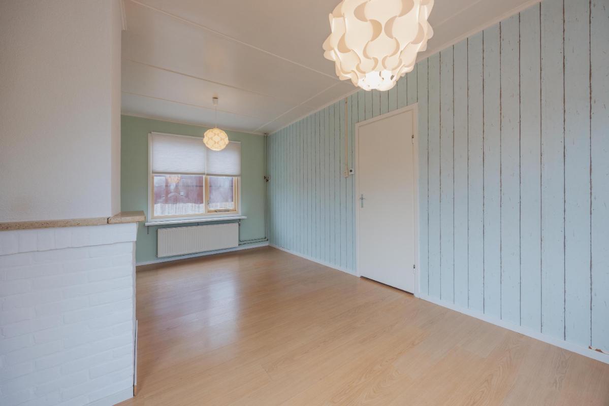 De doorzonwoonkamer heeft een oppervlakte van circa 21 m², geniet van veel natuurlijke lichtinval en is voorzien van een rookkanaal en een nette laminaatvloer. Aan de achterzijde van de woning bevindt zich de gesloten keuken, uitgerust met een recht keukenblok en een schouw met afzuigkap. Vanuit de keuken is er directe toegang tot de tuin.