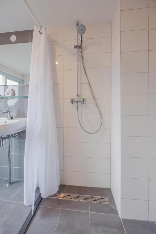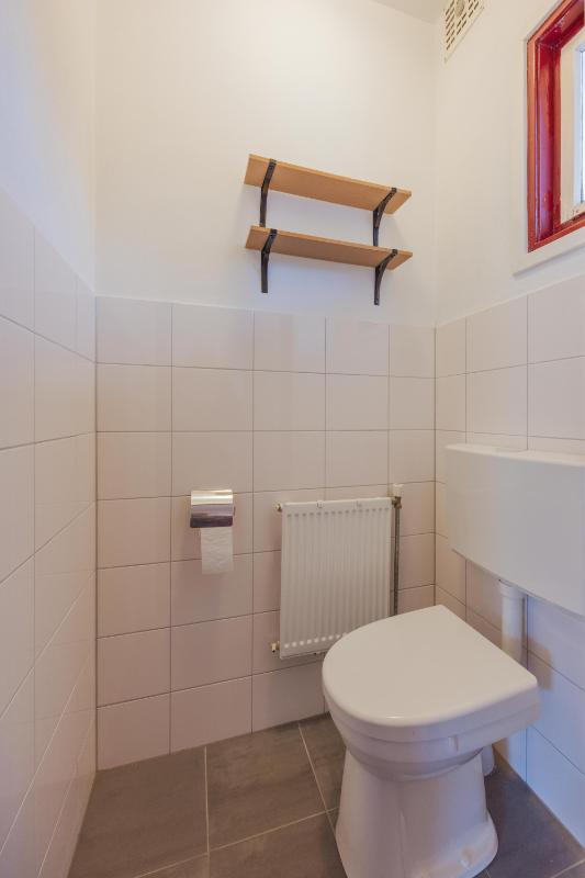 Eerste verdieping De overloop biedt toegang tot drie slaapkamers, een vaste kast en de badkamer. De badkamer is volledig betegeld en ingericht met een inloopdouche, wastafel, staand toilet en aansluiting voor wasapparatuur.
