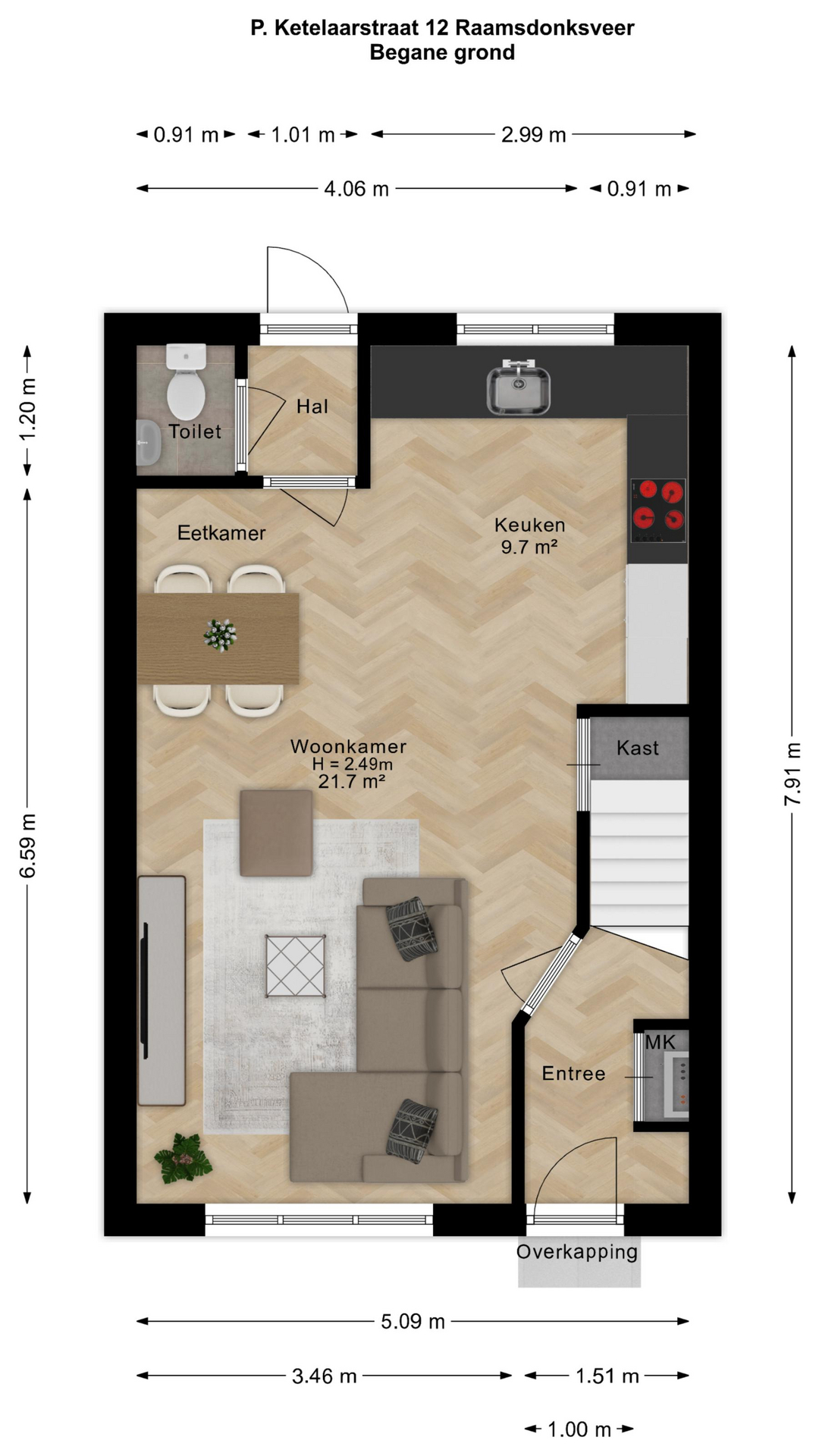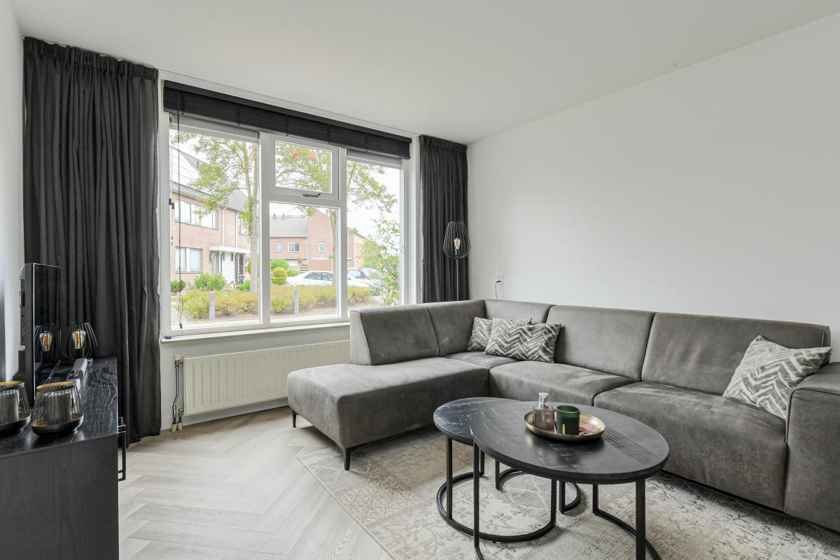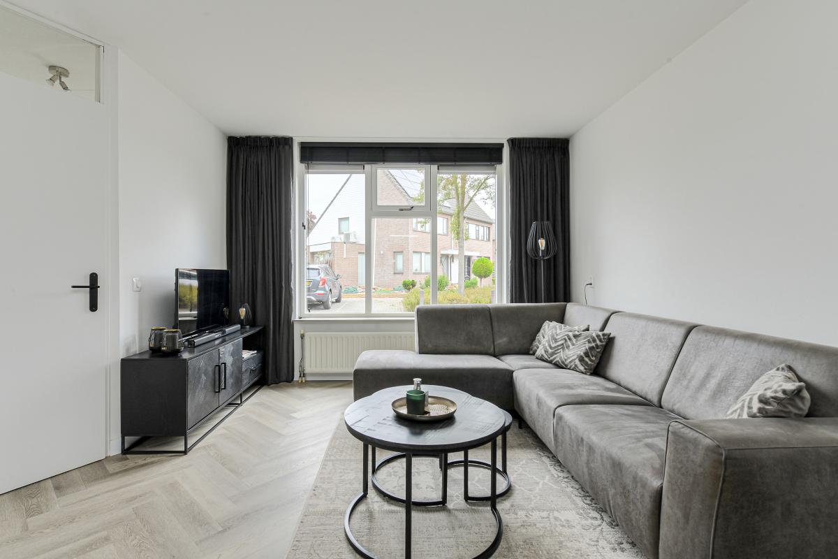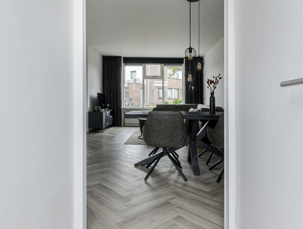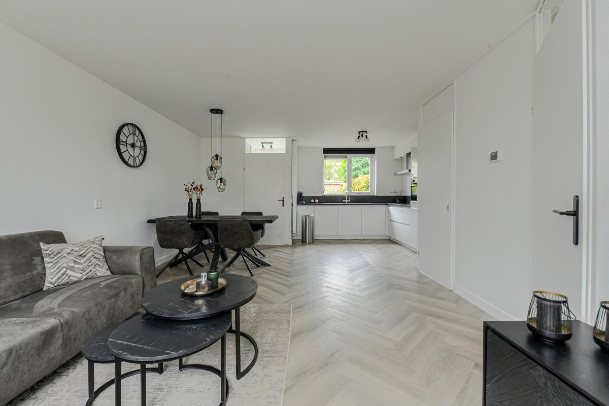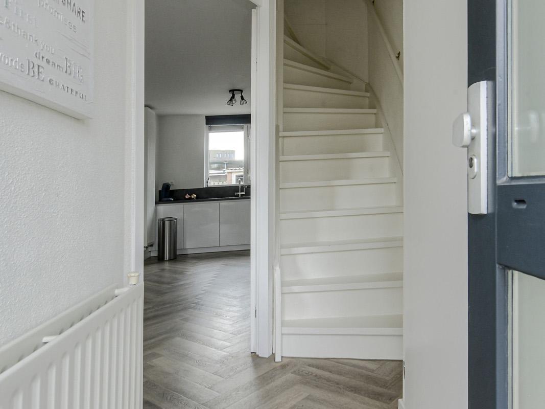 Begane grond: Entree met hal, meterkast (9 groepen en aardlekbeveiliging) en trapopgang naar de eerste verdieping. Ruime en lichte woonkamer (ca. 22 m2) met trapkast. Aan de achterzijde bevindt zich de moderne open keuken (2022) in hoekopstelling (10m2), voorzien van diverse inbouwapparatuur zoals o.a.: een 4-pits inductiekookplaat, magnetronoven, afzuigkap, kokend waterkraan, koel-vriescombinatie en vaatwasser. Het achter portaal biedt toegang tot de betegelde toiletruimte met fonteintje en tot de zonnige achtertuin.