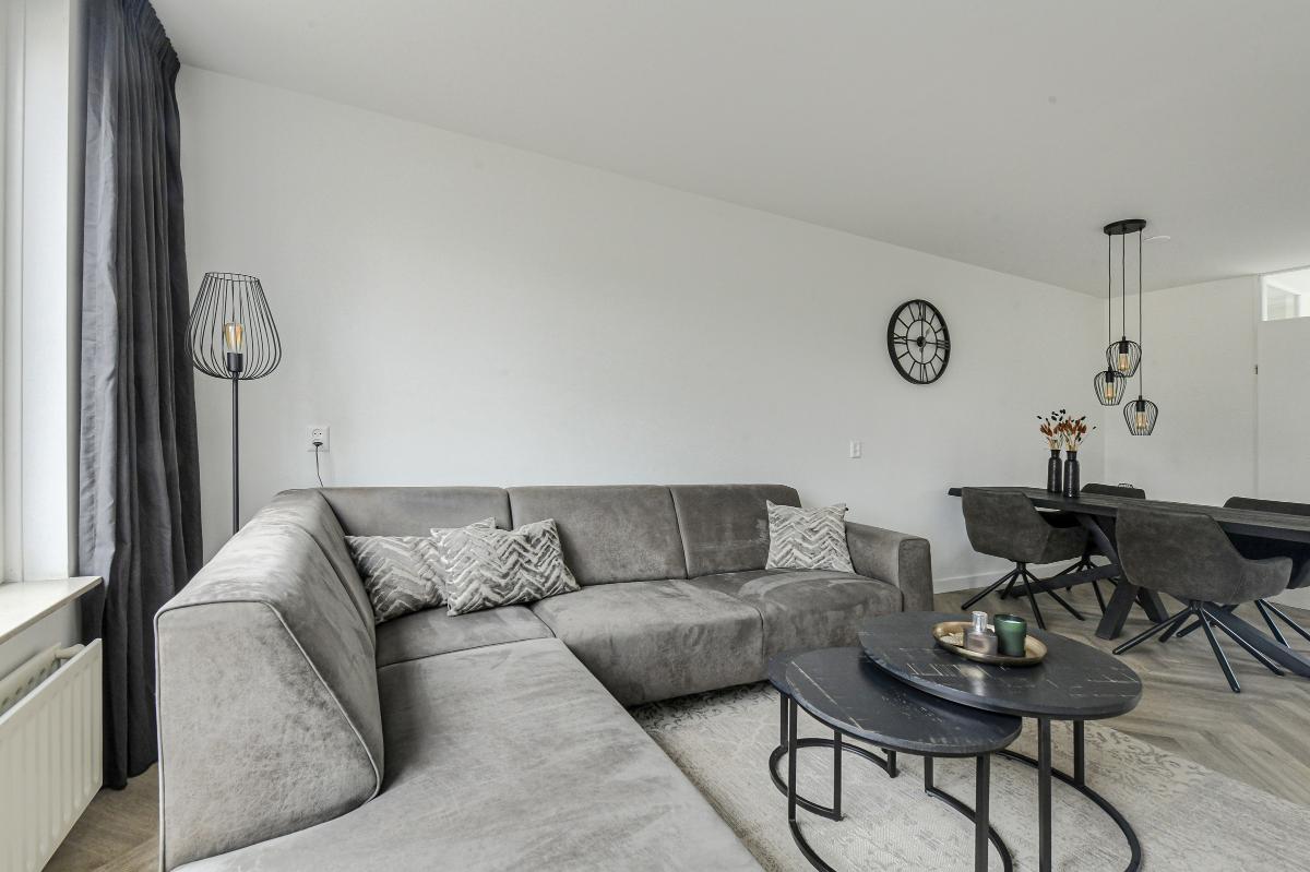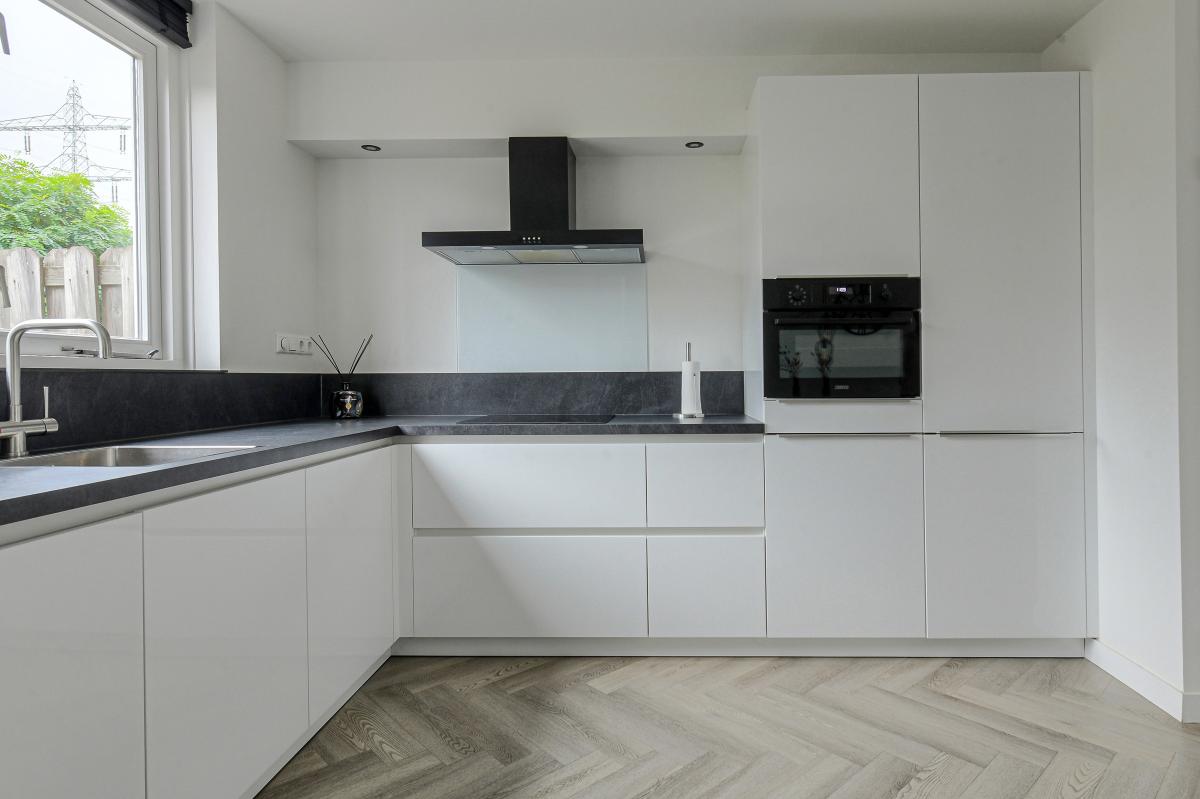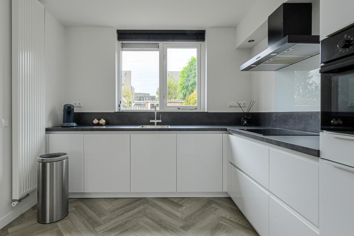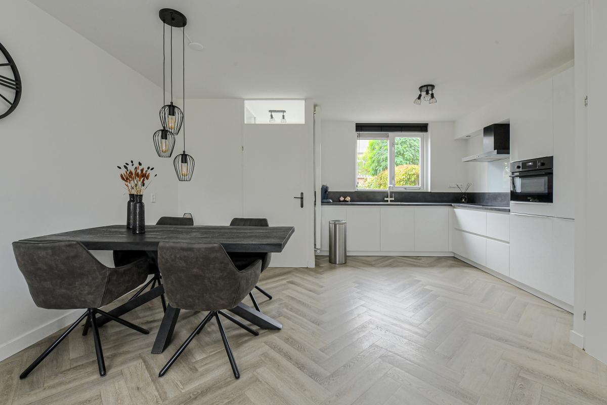 In de lichte, grote woonkamer met open keuken voelt u zich meteen thuis. De keuken is uitgerust met moderne inbouwapparatuur, waaronder een vaatwasser, koel-vriescombinatie, magnetronoven, inductiekookplaat en een kokend waterkraan. Hier kookt u met gemak de lekkerste maaltijden, terwijl u in contact blijft met uw gezelschap.
