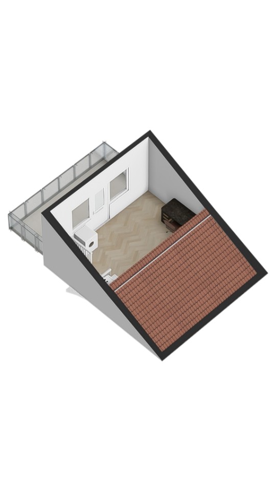 Tweede verdieping: Vaste trap naar een royale en lichte zolderkamer met toegang tot het ruime dakterras (ca. 11,5m2) en berging achter de knieschotten. Tevens bevindt zich hier de opstelling van de HR-combiketel, de wasmachineaansluiting, de omvormer voor de zonnepanelen en de mechanische ventilatie.
