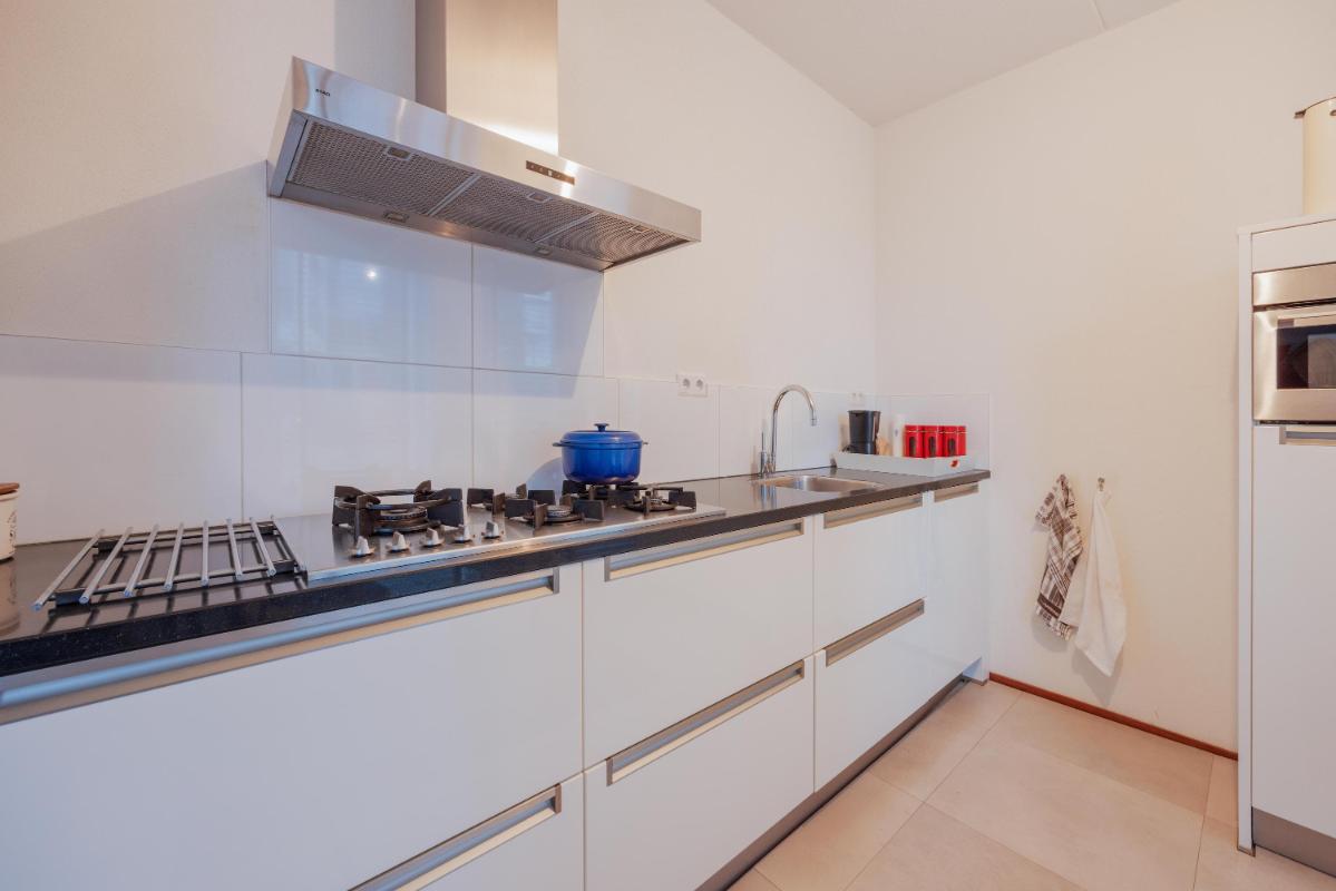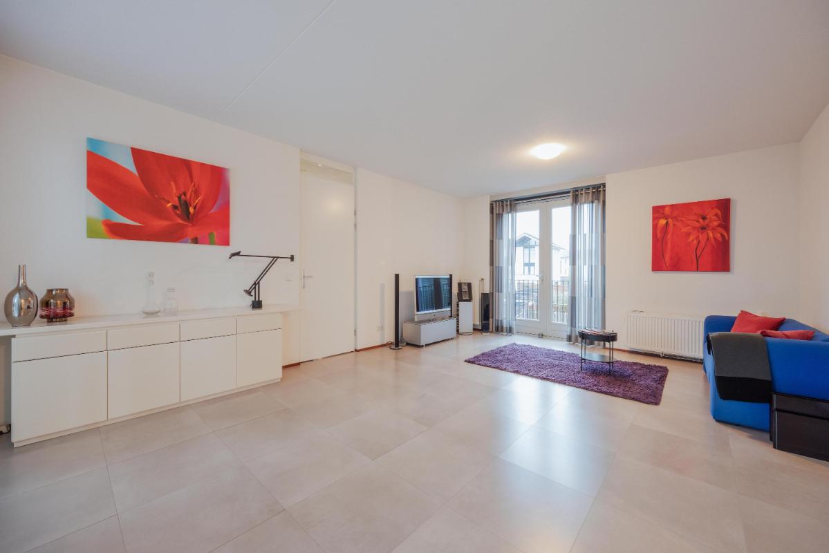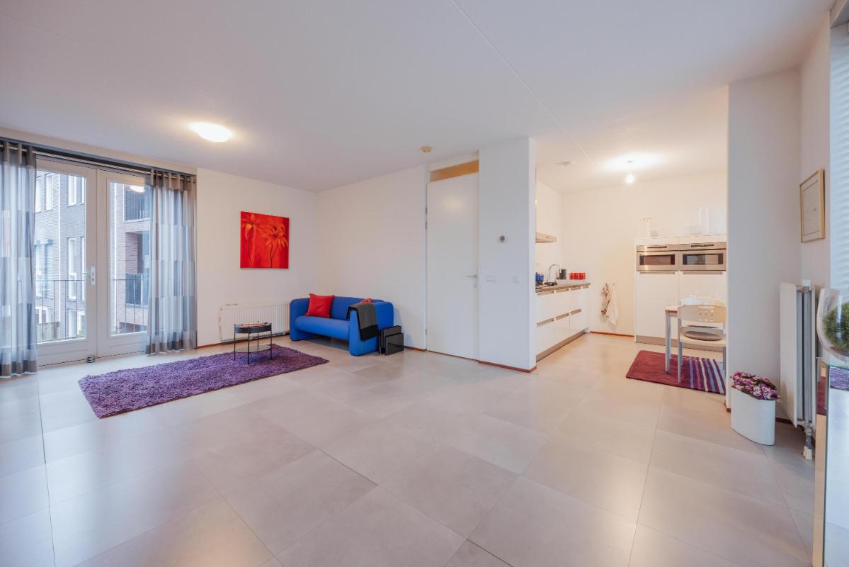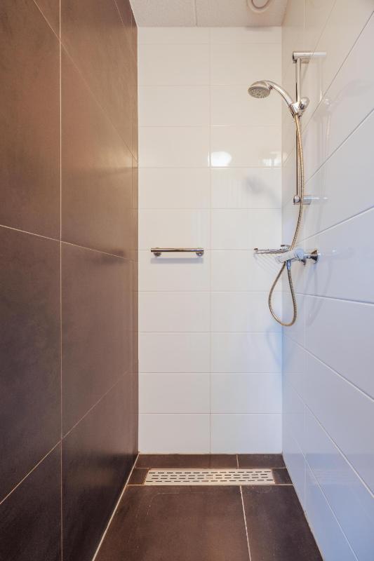 De woonkamer heeft een oppervlakte van ruim 37m2 en heeft veel lichtinval door de vele grote raampartijen en de aanwezige Franse balkons. Vanuit de woonkamer is de half open keuken bereikbaar met een nette complete keukeninrichting. Het keukenblok is voorzien van een hardstenen blad en beschikt over de volgende inbouwapparatuur: afzuigkap, 5-pits gaskookplaat, vaatwasser, koelkast, vriezer, oven en een combimagnetron/oven. Vanuit de woonkamer is een tussenhal te bereiken die toegang biedt tot de 2 ruime slaapkamers en de badkamer. De badkamer is volledig betegeld in een neutrale kleurstelling en is voorzien van een wastafelmeubel met dubbele kraan en een ruime inloopdouche. De slaapkamer aan de achterzijde biedt middels grote schuifpui toegang tot het balkon op het zuiden.