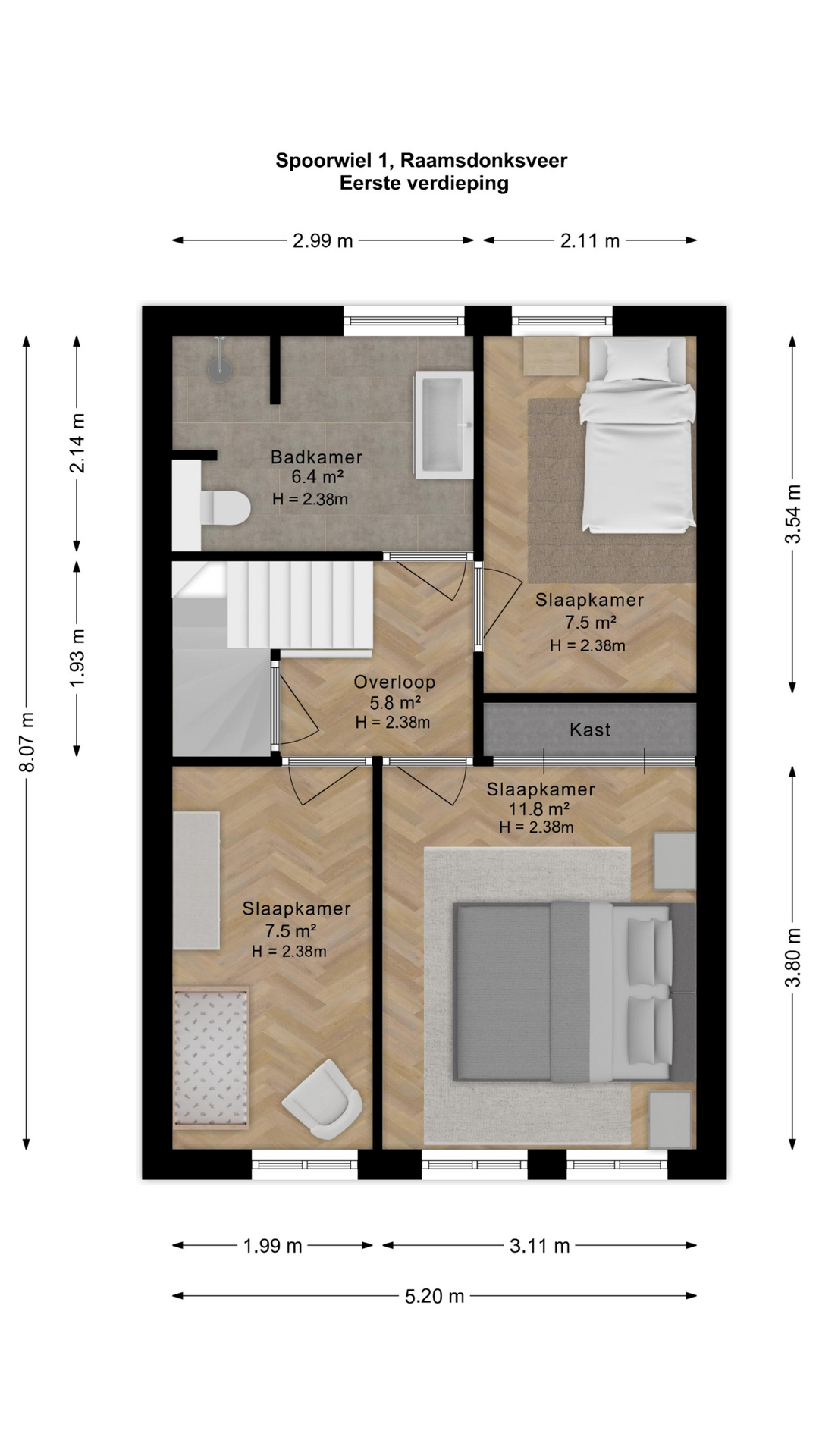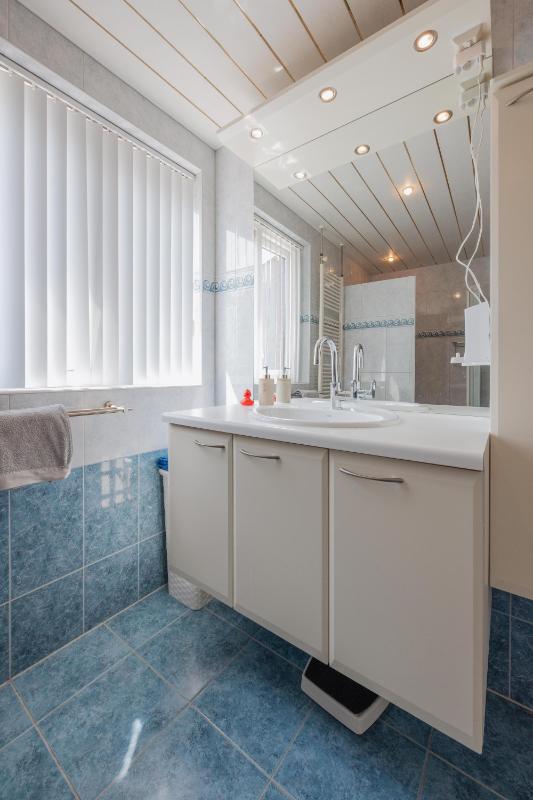 Eerste verdieping Via de overloop bereik je drie slaapkamers en de ruime badkamer. Deze is volledig betegeld en uitgerust met een designradiator, toilet, riant wastafelmeubel met veel bergruimte en een grote inloopdouche. De slaapkamers zijn netjes afgewerkt met laminaatvloeren en lichte wandafwerking.