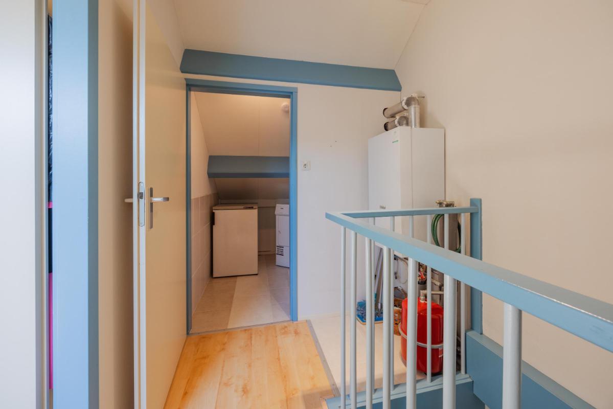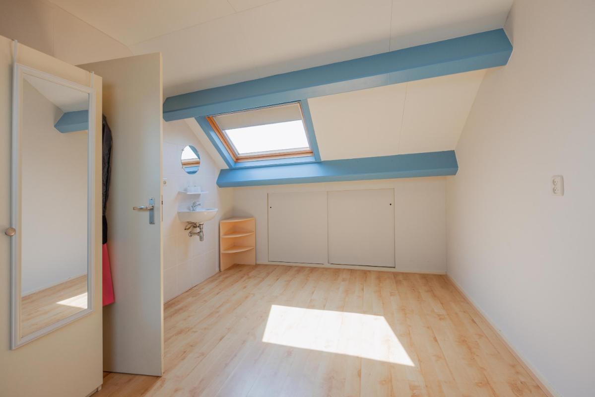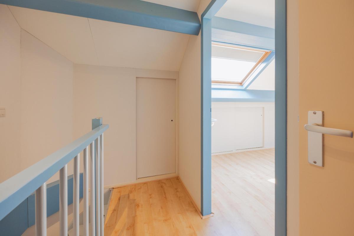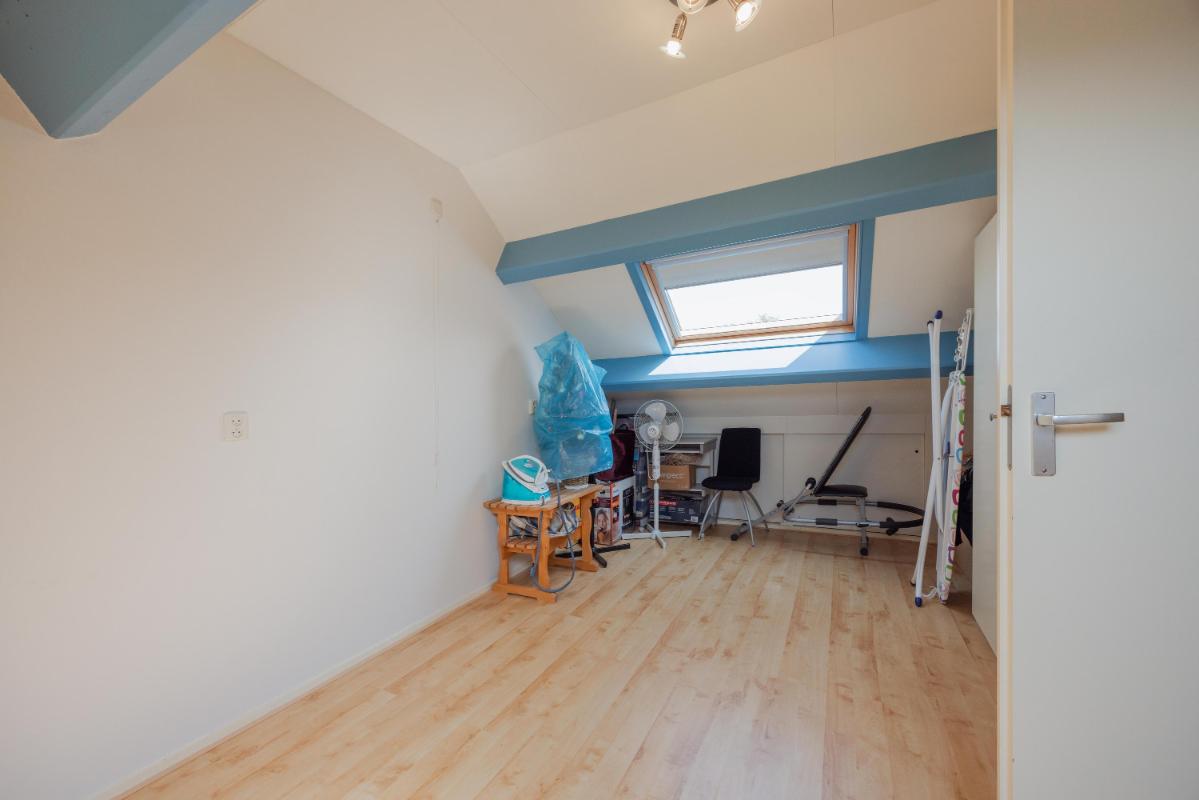 Tweede verdieping Een vaste trap leidt naar de zolder. Hier vind je de voorzolder met cv-installatie (Remeha Tzerra 2026 !!) en aansluitingen voor wasmachine en droger. Daarnaast is er een royale vierde slaapkamer met Velux dakraam en handige bergruimte achter de knieschotten. In 2022 is het volledige dak vernieuwd en voorzien van nieuwe dakisolatie en dakpannen.