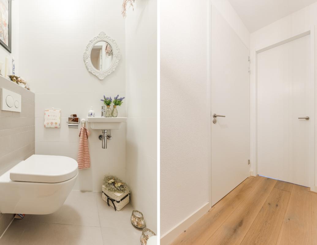 Modern "zwevend" toilet met fonteintje, geheel licht betegeld met mooie licht grijze vloertegel en wit en licht grijze wandtegel.