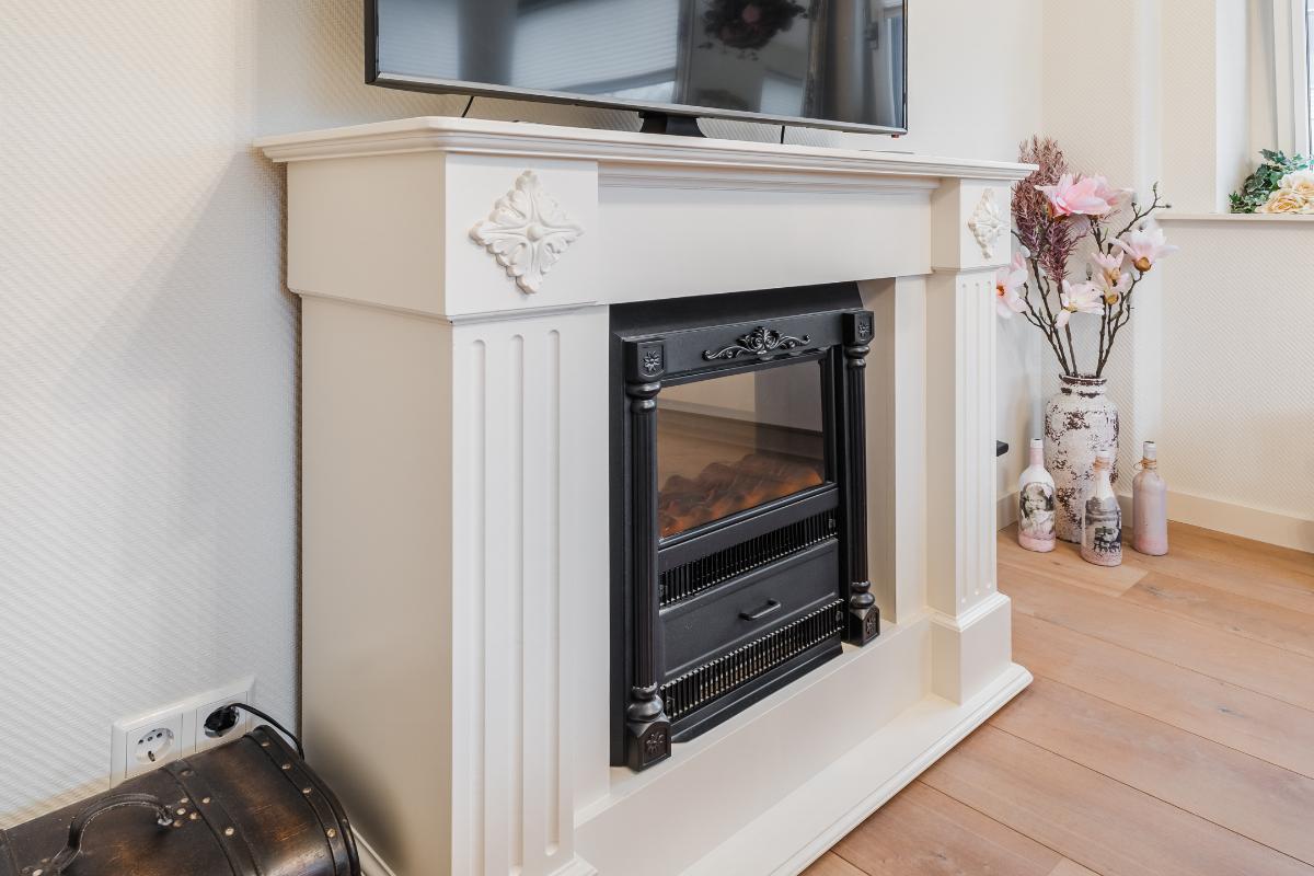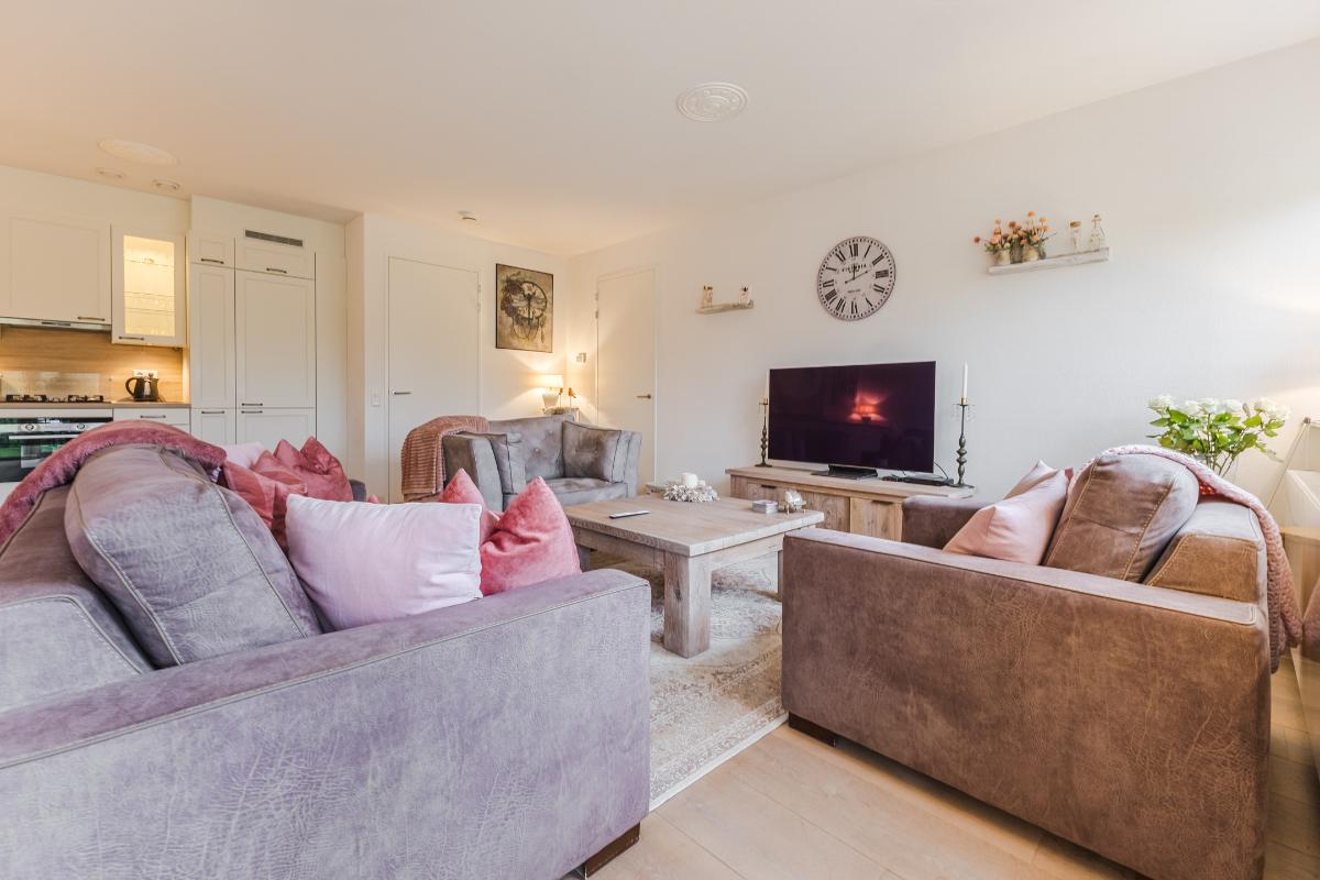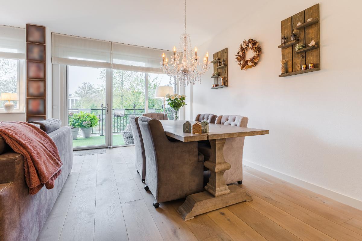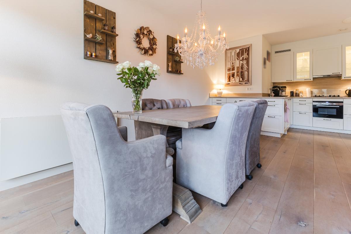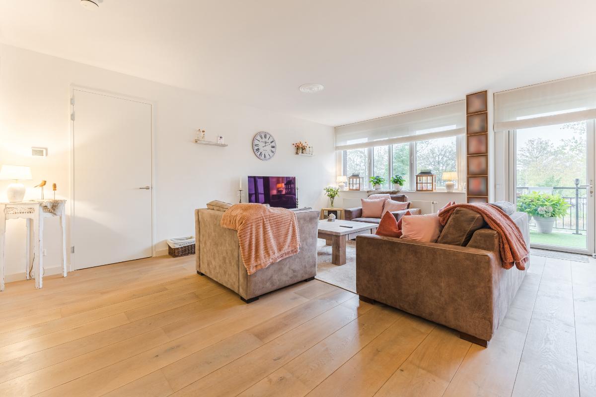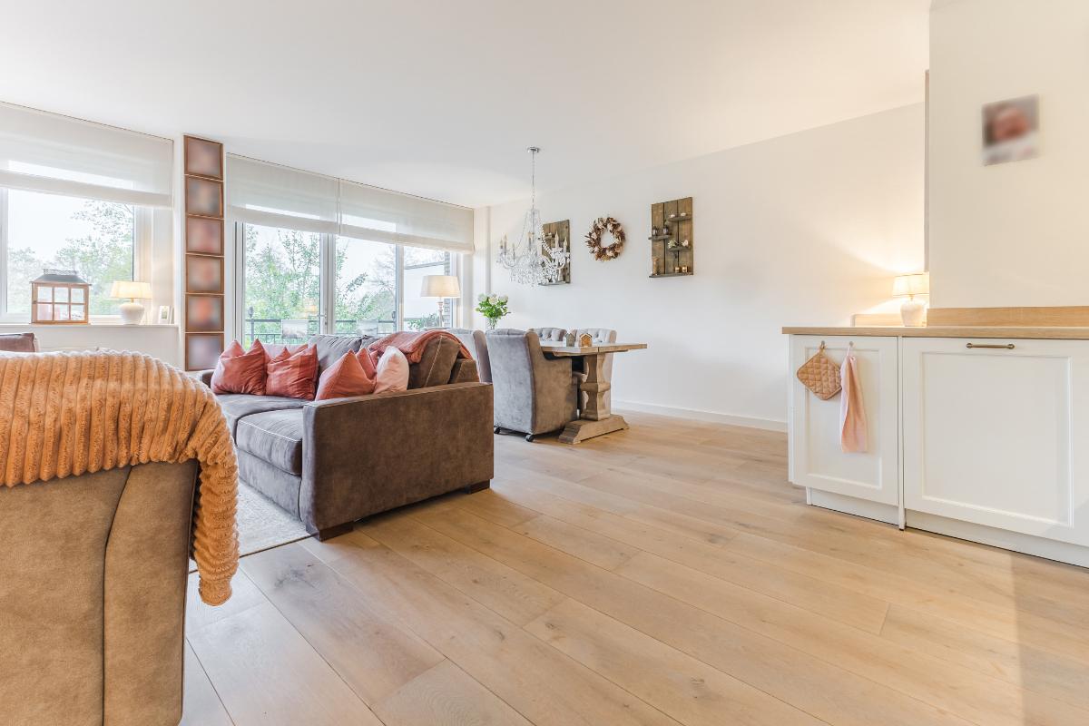 Vanuit de hal, komen we in de sfeervolle en mooie lichte woonkamer met grote ramen en veel licht, deze is voorzien van mooie houten vloerdelen en glasvlies wandafwerking.