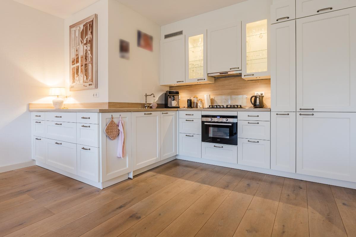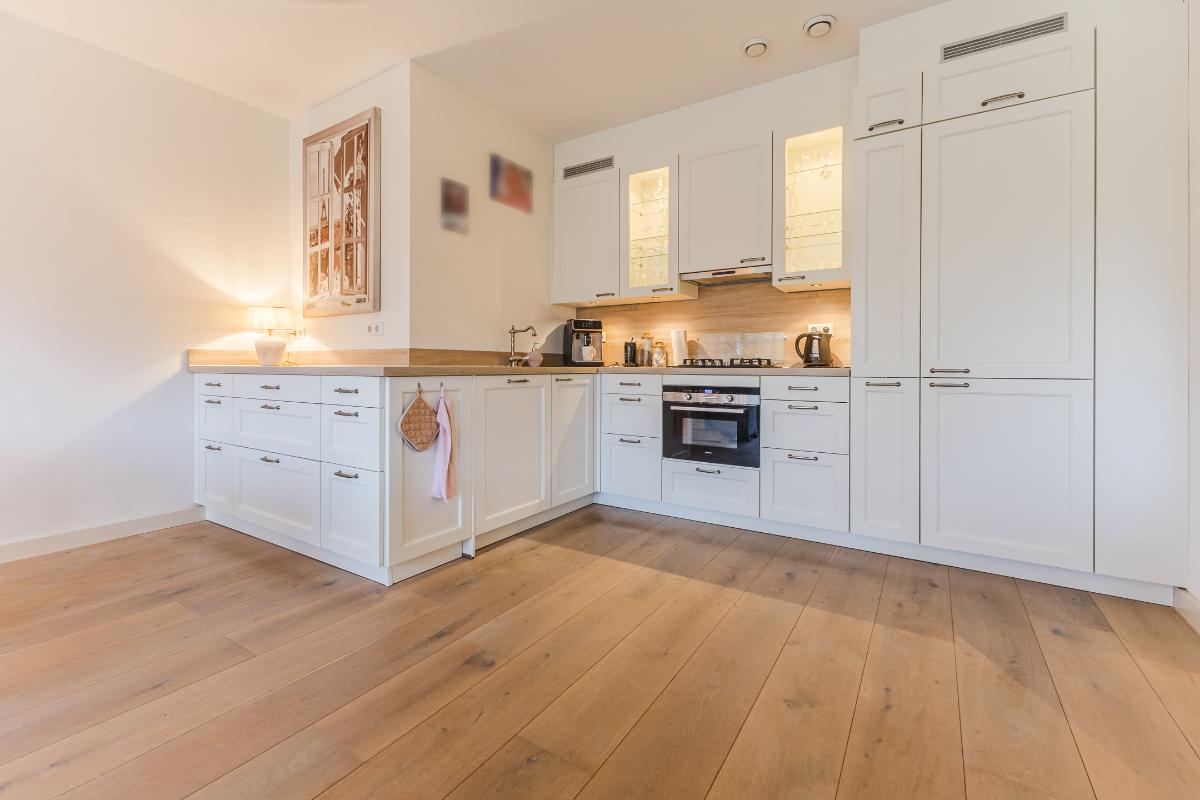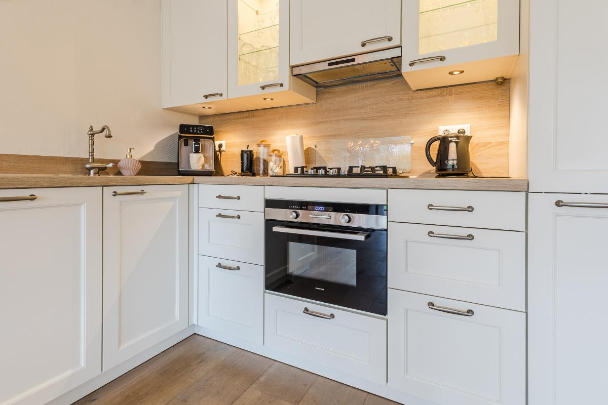 Open keuken met een moderne, speelse keukeninstallatie, welke is voorzien van een vlakscherm, 4-pits gaskookplaat, combi-oven, apothekerskast, veel praktische lades, koel/vries combinatie en de vaatwasser.