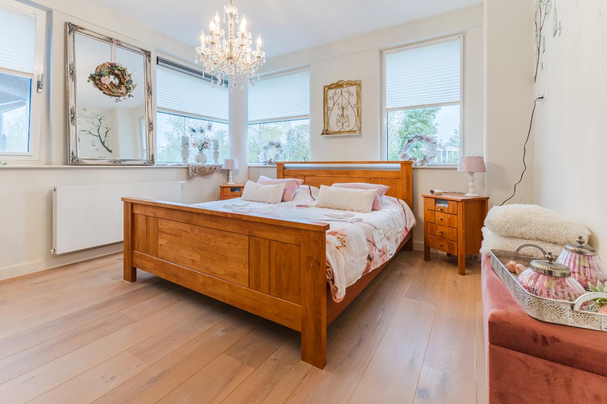 De ruime ouderslaapkamer, treft u aan met ook hier veel ramen voor een leuk, vrij uitzicht. Ook hier mooie houten vloerdelen en glasvlies wandafwerking.