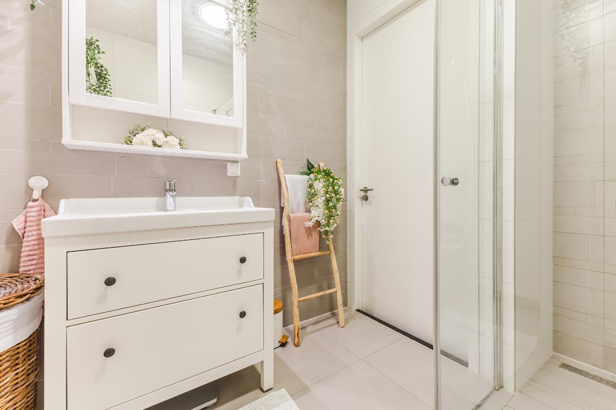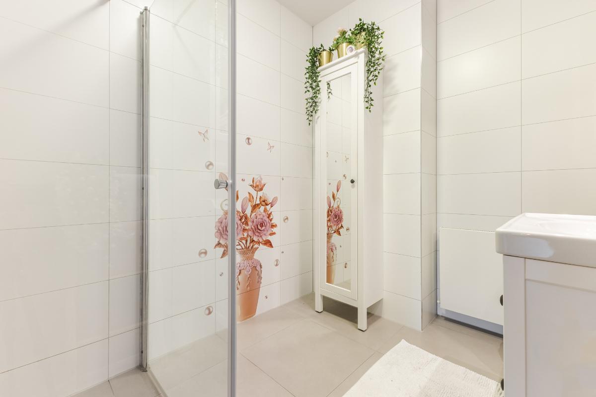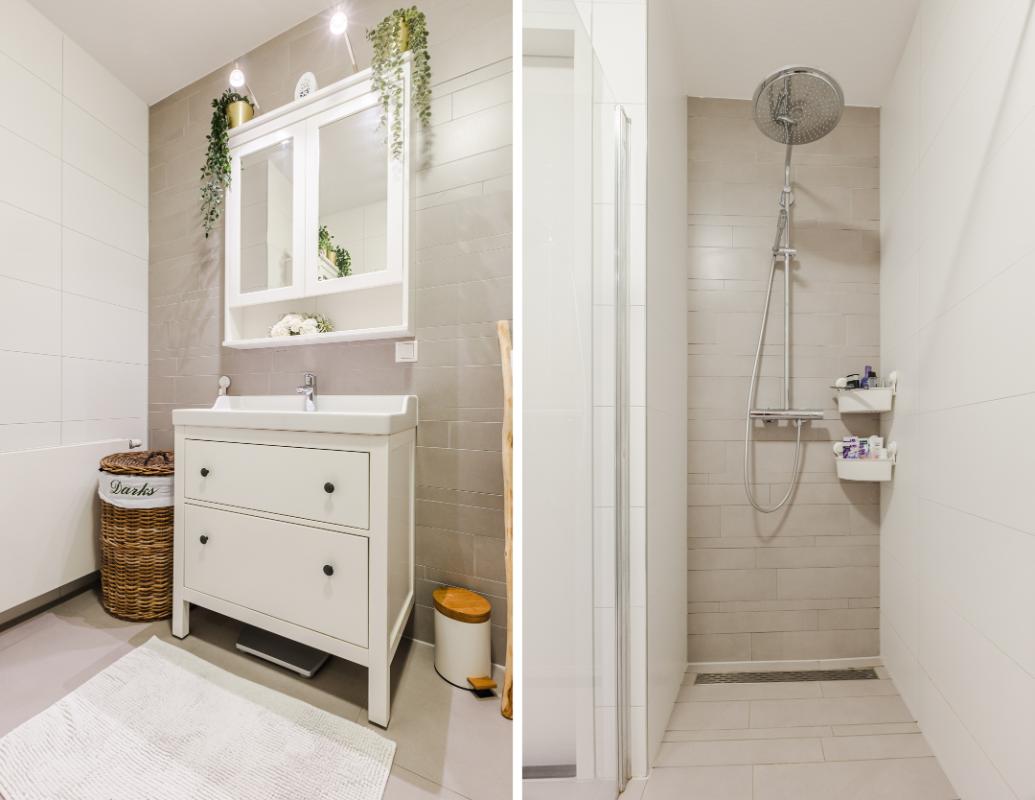 Moderne badkamer, welke is voorzien van een inloopdouche met regendouche, mooi badmeubel met vaste wastafel en geheel betegeld met een licht grijze vloertegel en een licht grijze en witte wandtegel.