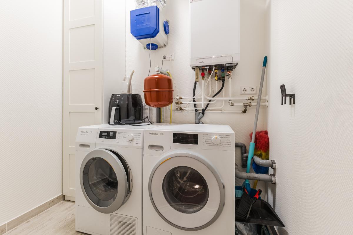 Inpandige berging met de wasmachine-aansluiting, mechanische ventilatie en de opstelling van de CV combi-ketel (Intergas), glasvlies wandafwerking en een licht grijze tegelvloer.
