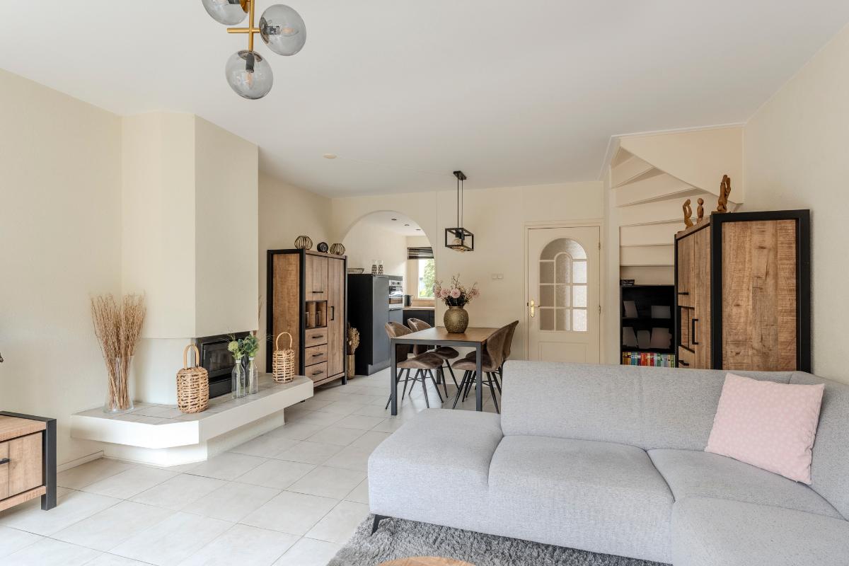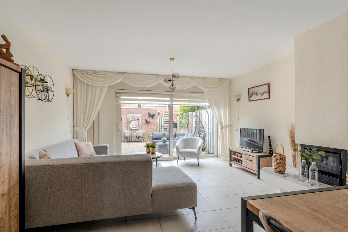 Sfeervolle, tuingerichte woonkamer, welke is voorzien van een lichte tegelvloer, spachtelputz wandafwerking en een mooie aluminium schuifpui zorgt voor veel lichtinval in de woonkamer.