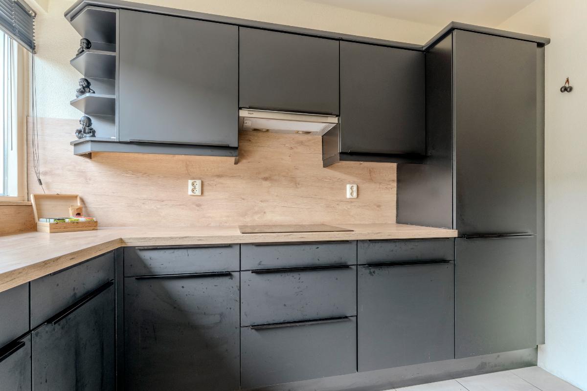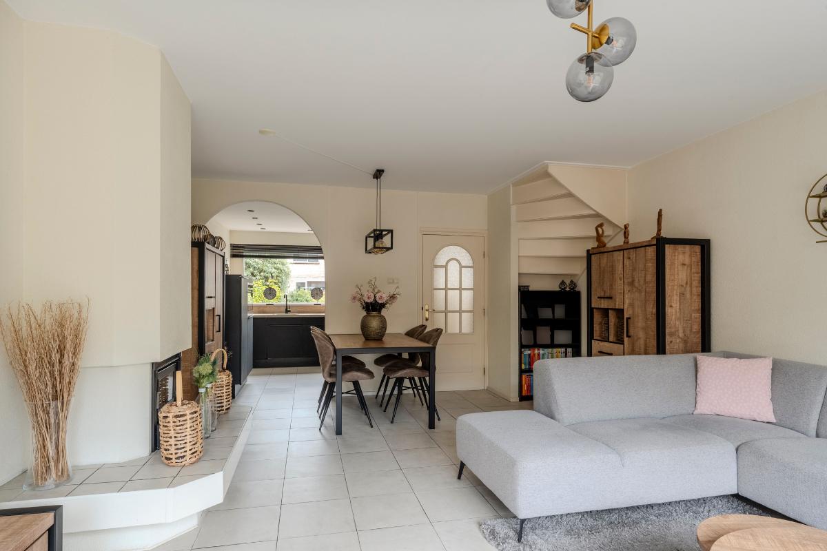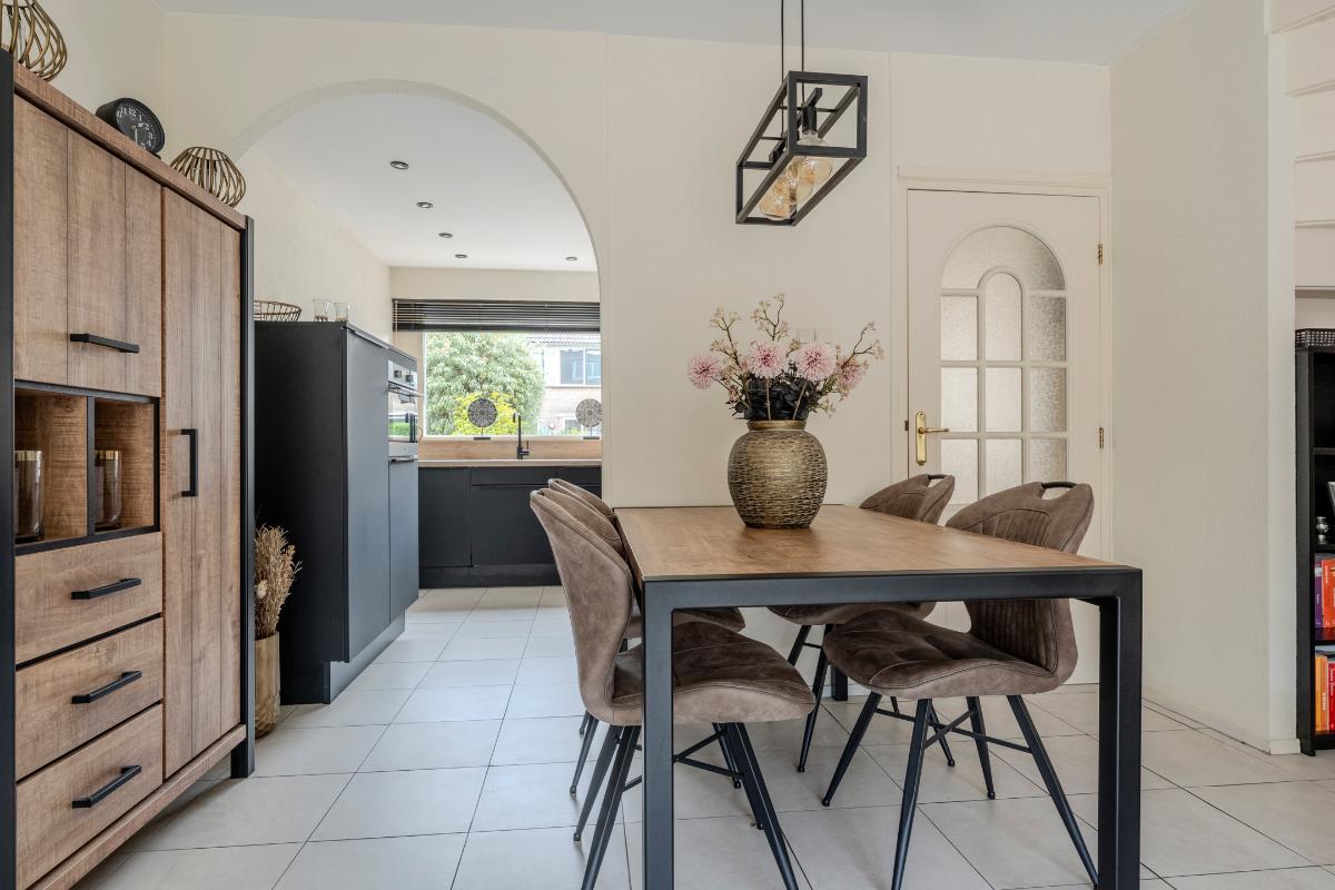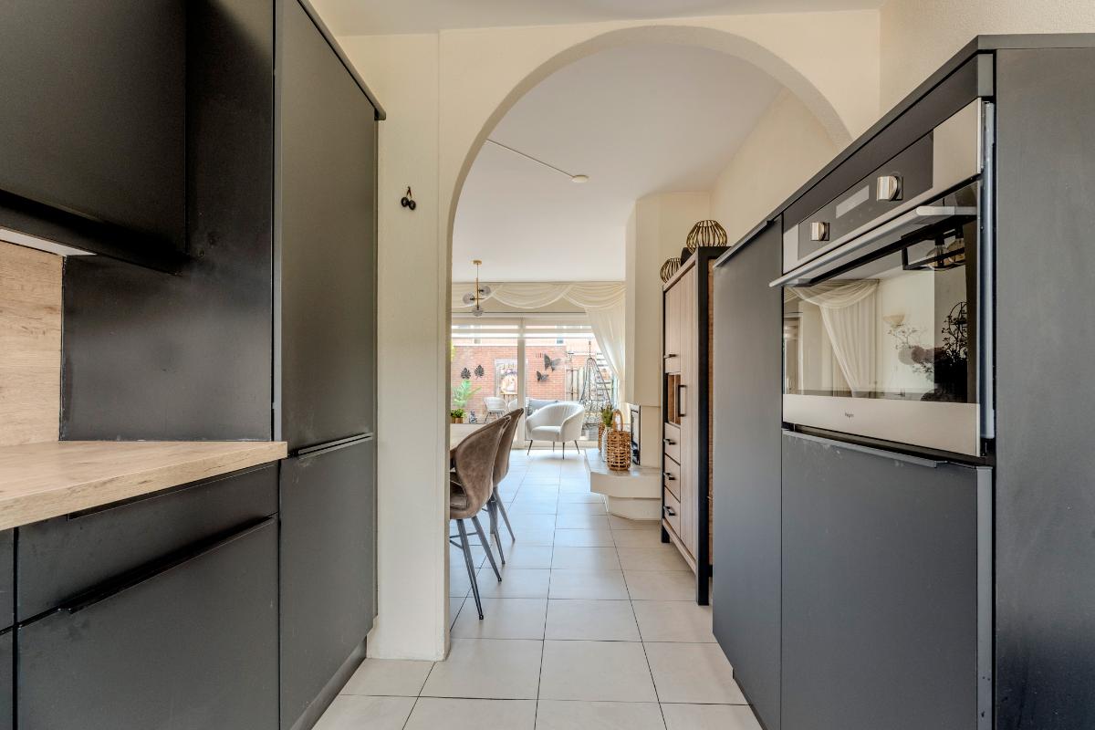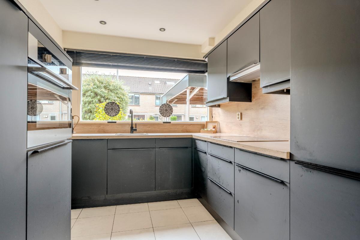 Aan de voorzijde van de woning, ligt de half open moderne keukeninstallatie welke in 2022 is vernieuwd. De keuken is voorzien een 4-pits inductiekookplaat, combi-oven, koel/vries combinatie, close in boiler en de vaatwasser. Inbouwspots zorgen voor mooie verlichting.